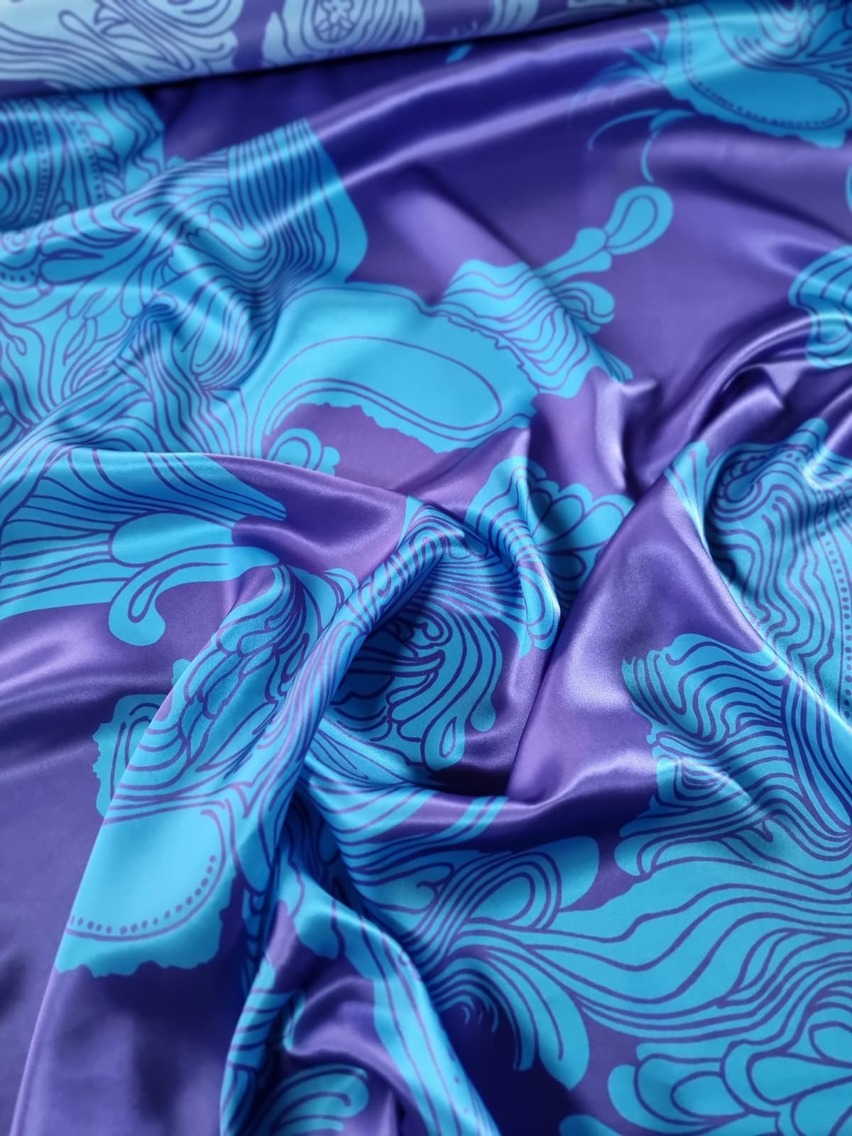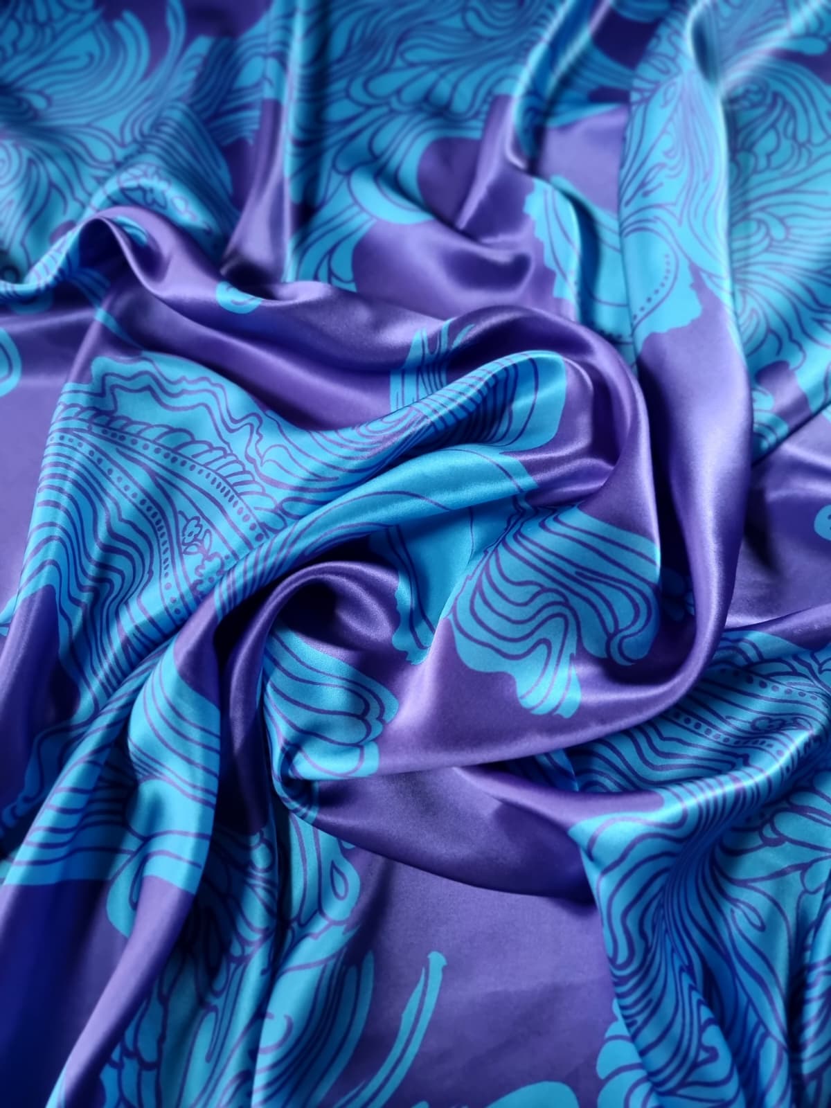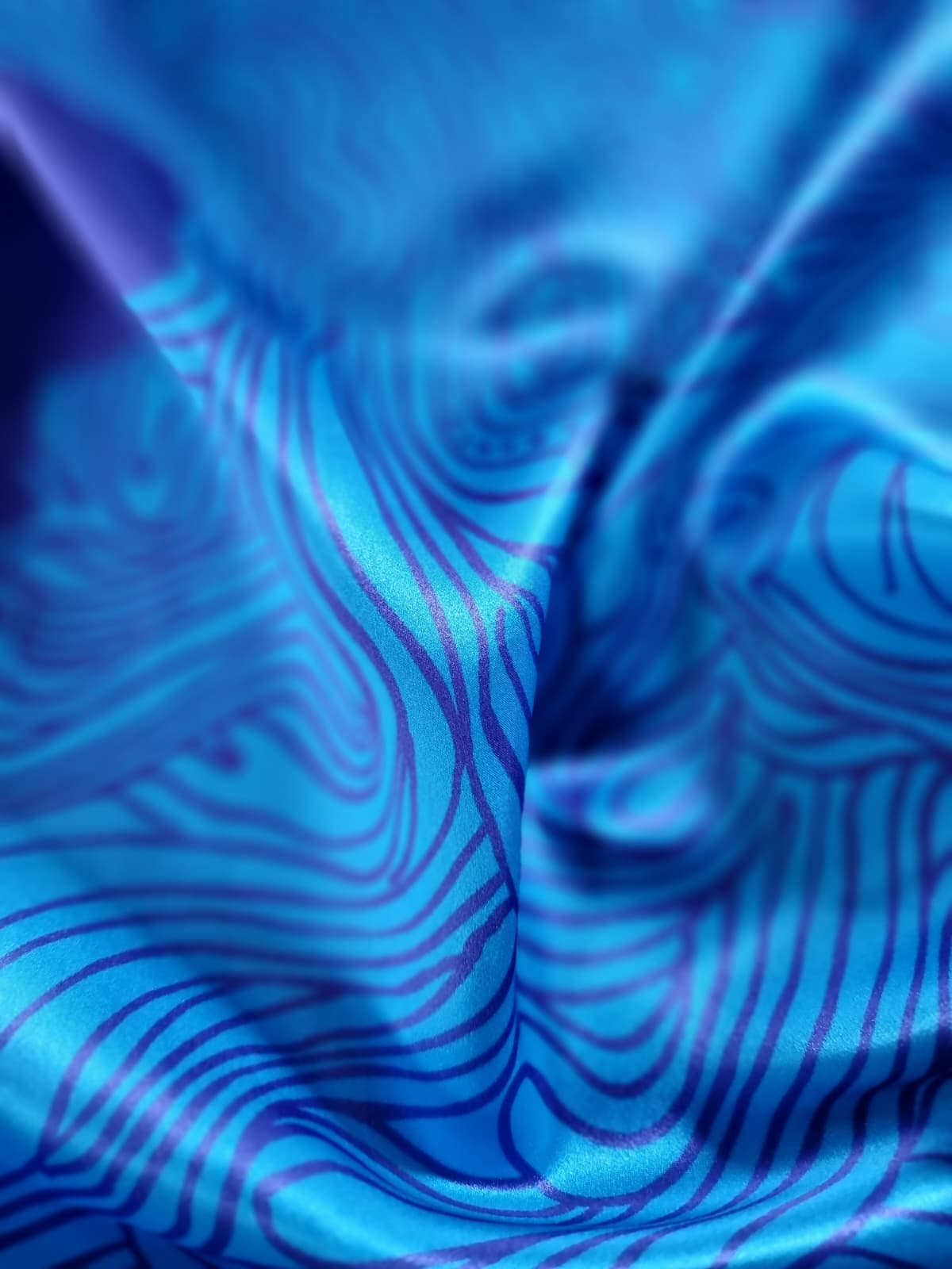 Tesatura fina din matase naturala – satinata cu imprimeu abstract, Turcoaz / Albastru / Indigo