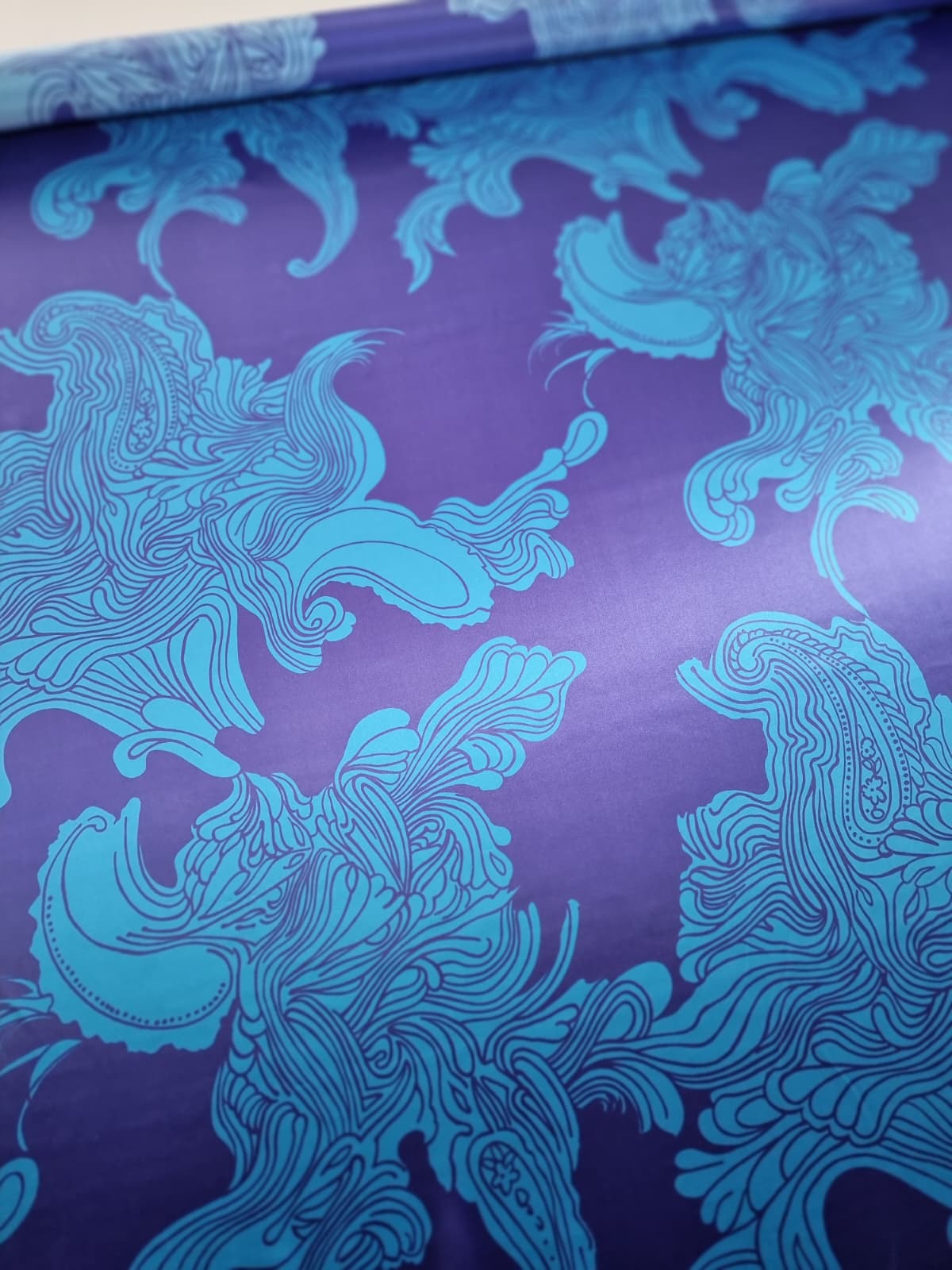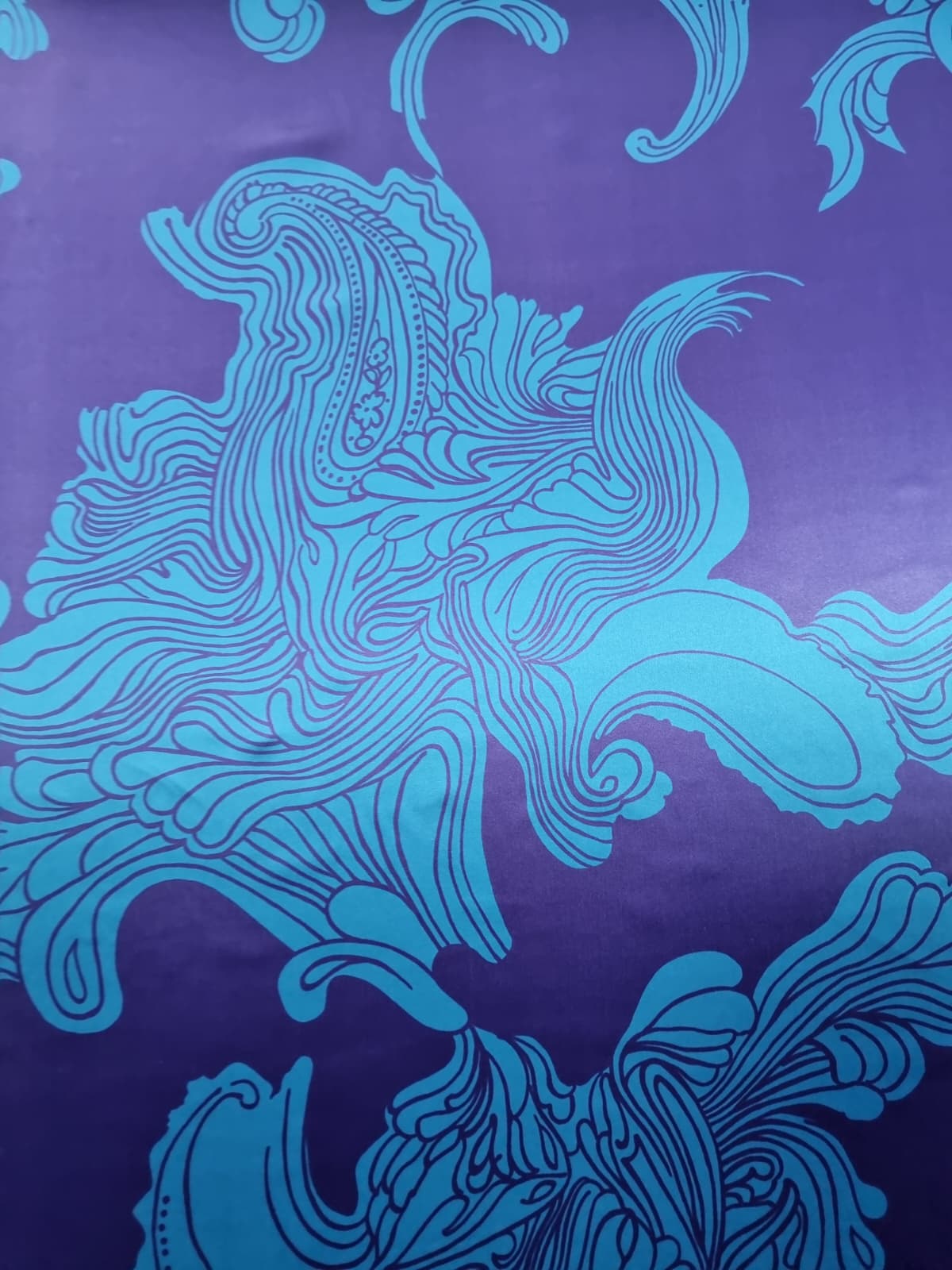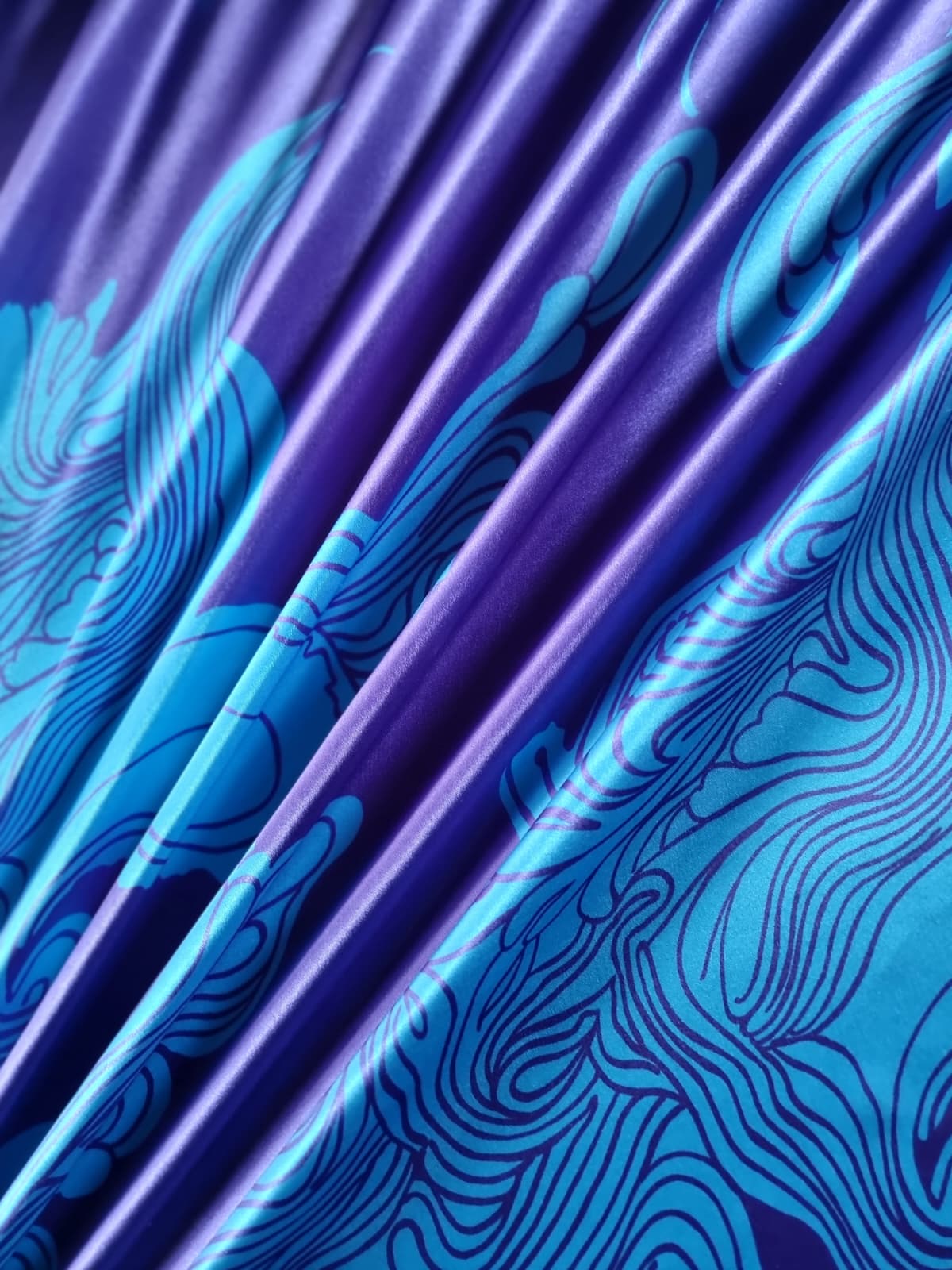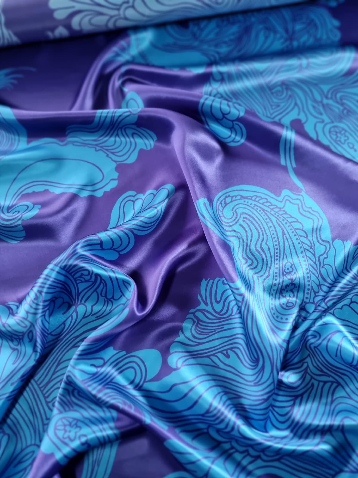 Tesatura fina din matase naturala – satinata cu imprimeu abstract, Turcoaz / Albastru / Indigo