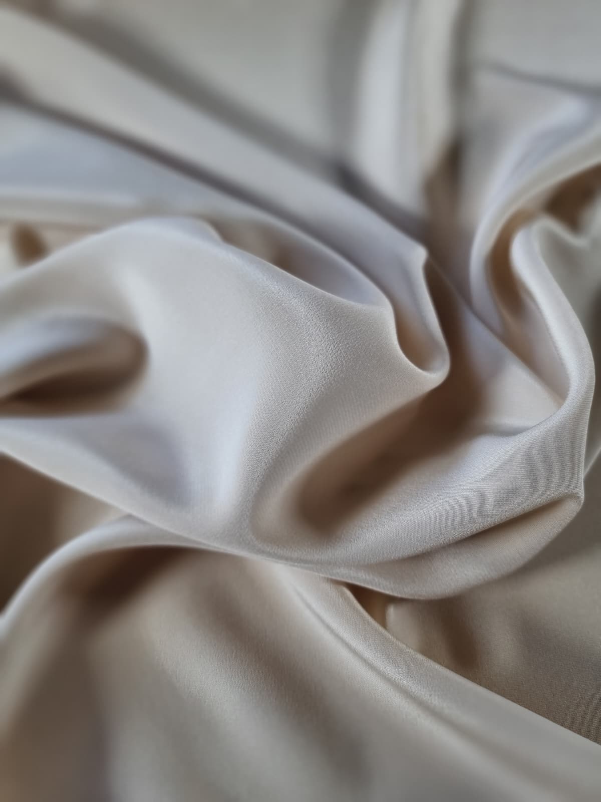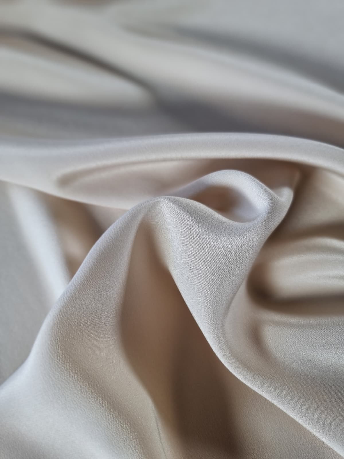 Crepe sau Dublu crepe din mătase naturală sau alte fibre similar – este o țesătură luxoasă ce îmbină finețea absolută a mătăsii cu textura sofisticată a crepului. Cu o suprafață ușor granulată, dar incredibil de fluidă, acest material oferă un drapaj impecabil și un joc subtil de lumină și umbre. Perfect pentru rochii elegante, bluze rafinate și costume couture, dublu crepe-ul din mătase naturală este alegerea ideală pentru cei care caută o combinație între delicatețe, structură și rafinament atemporal.