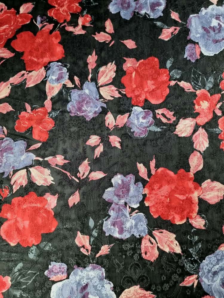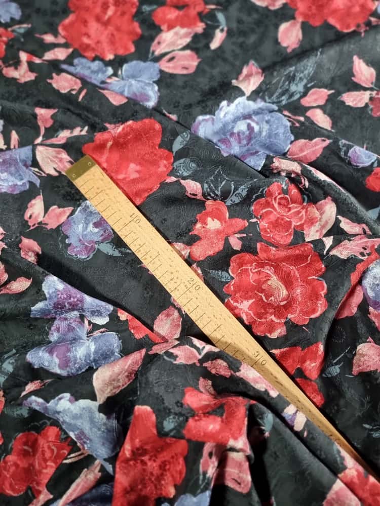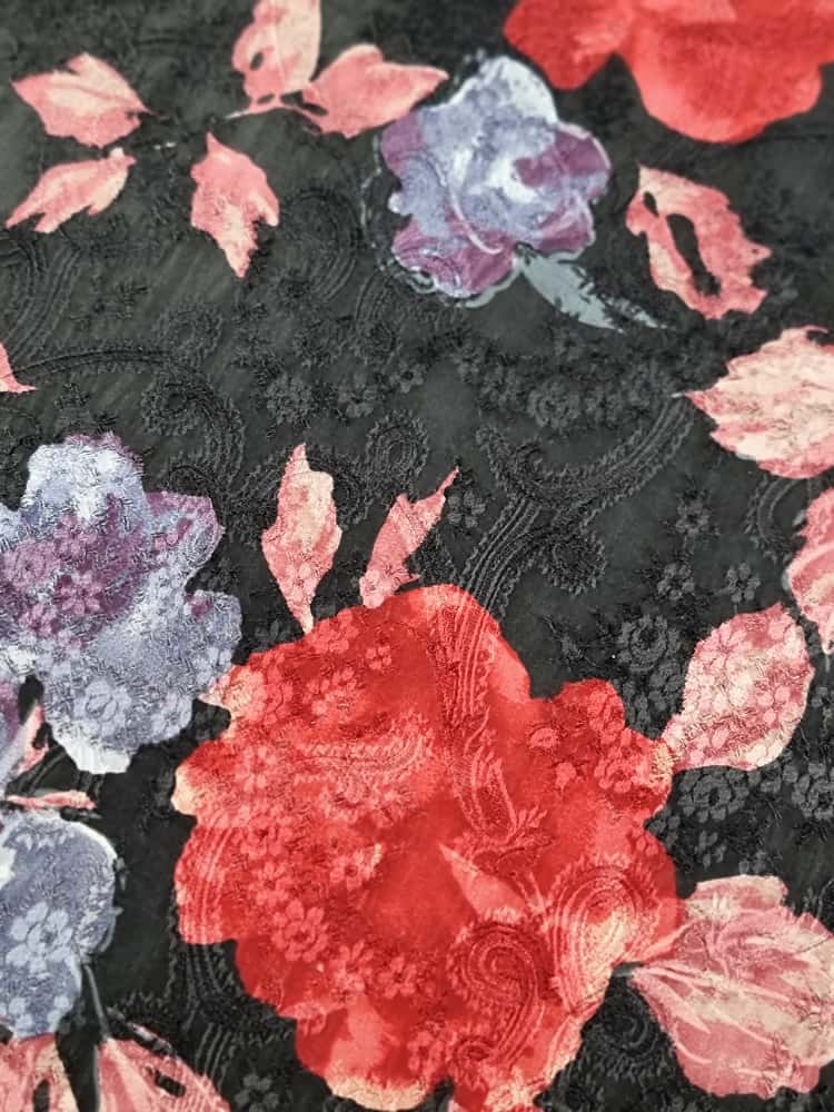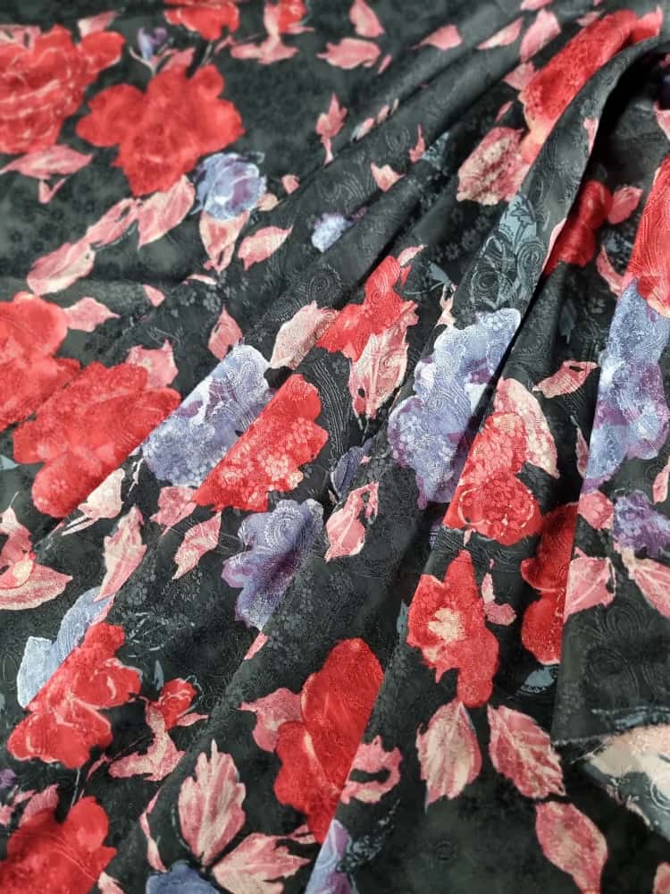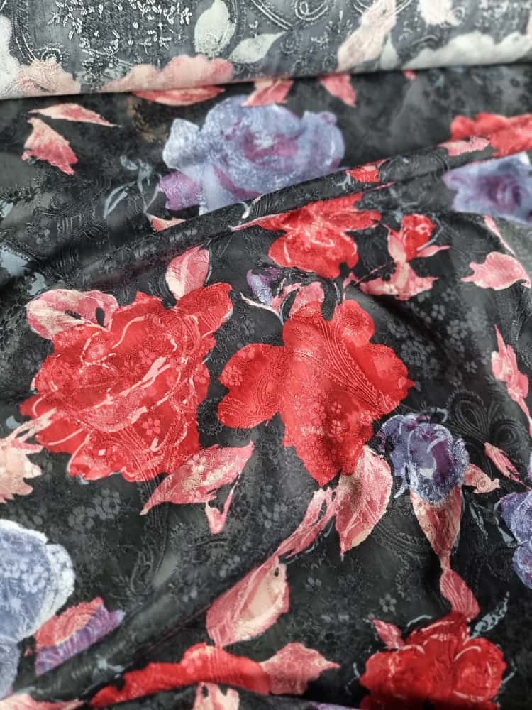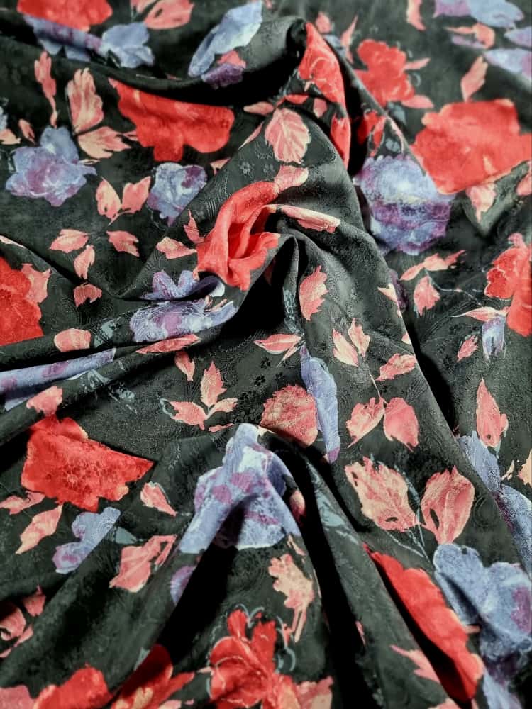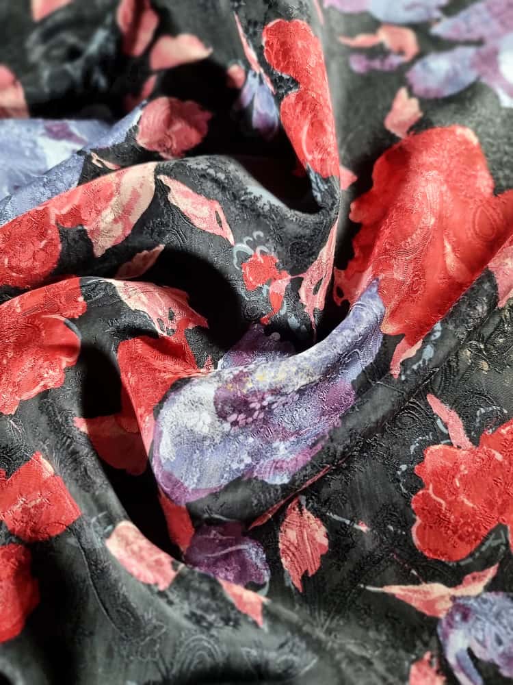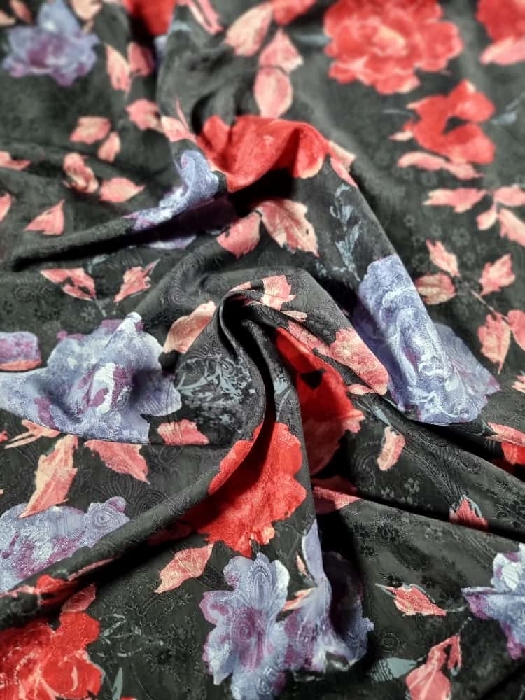 Tesatura jacquard din matase naturala cu viscoza – model floral, Multicolor pe fond Negru