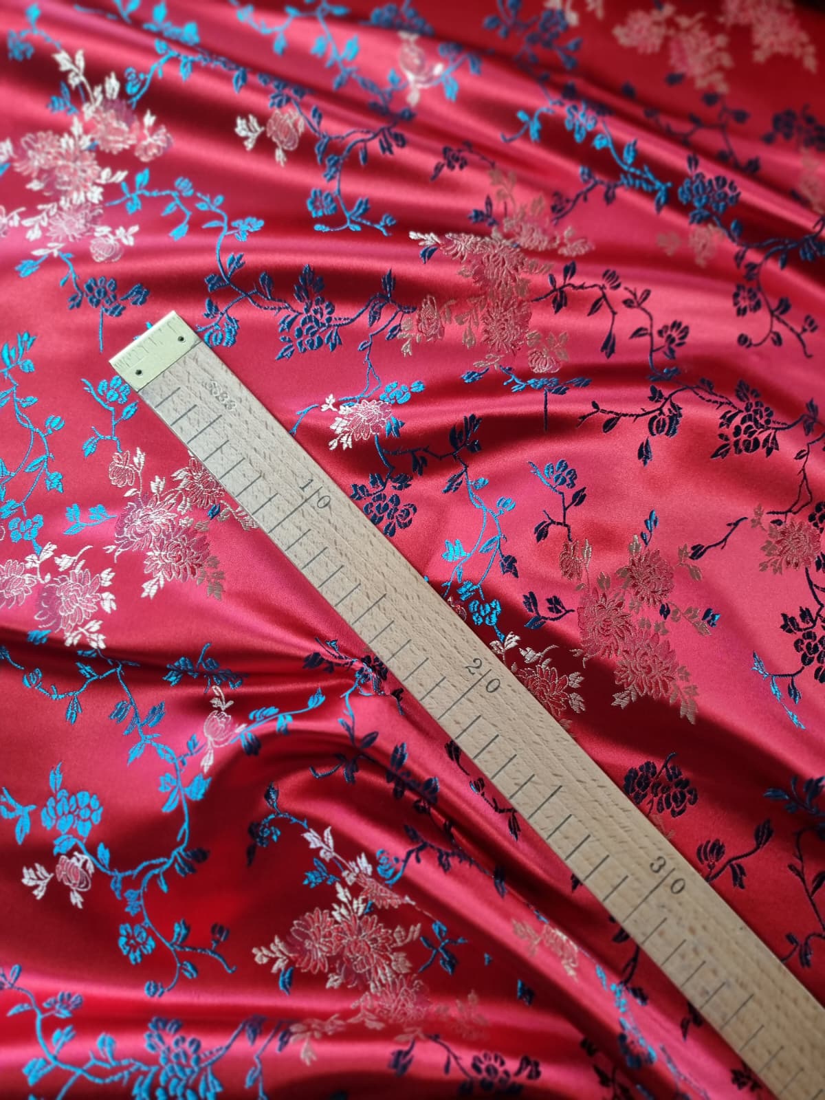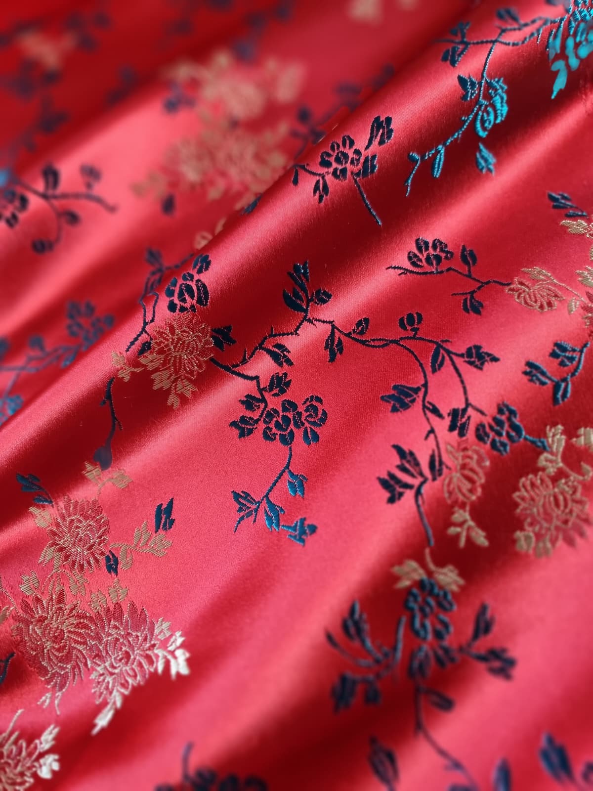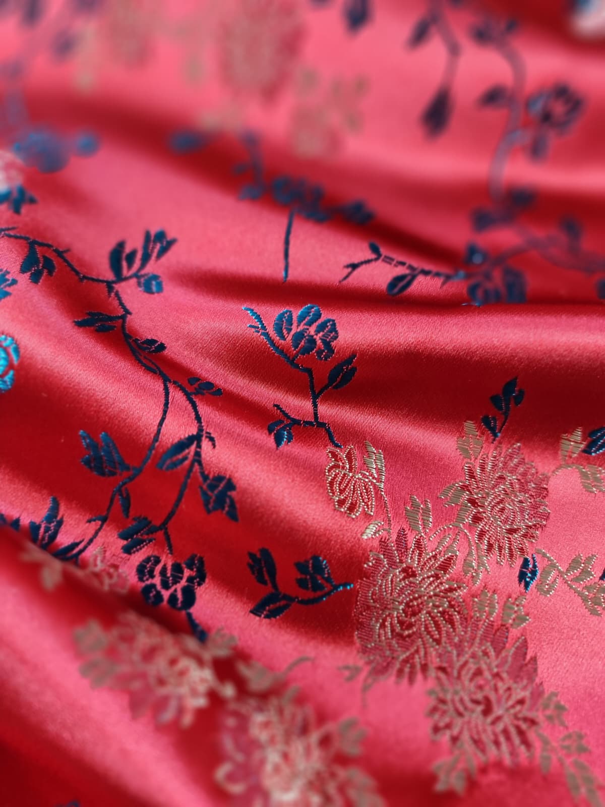 Tesatura Jacquard satinată cu flori albastre si aurii in stil asiatic pe fond Roșu