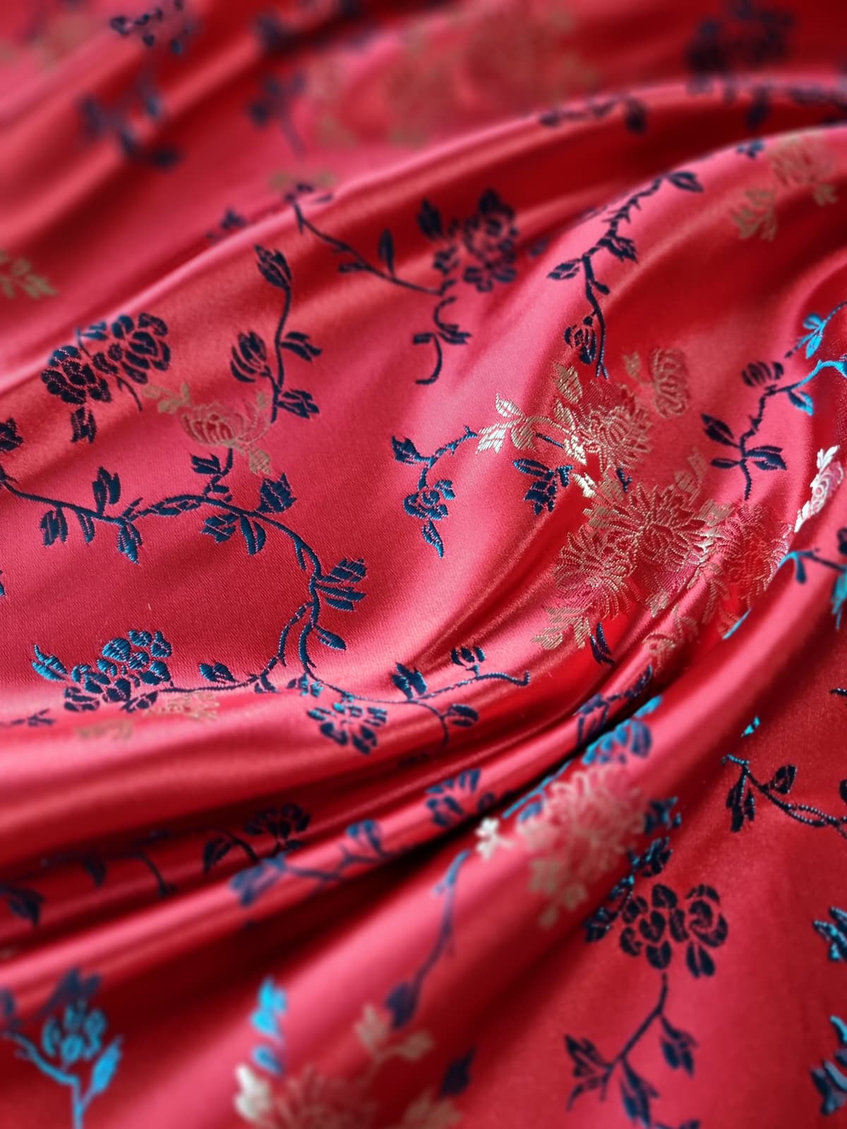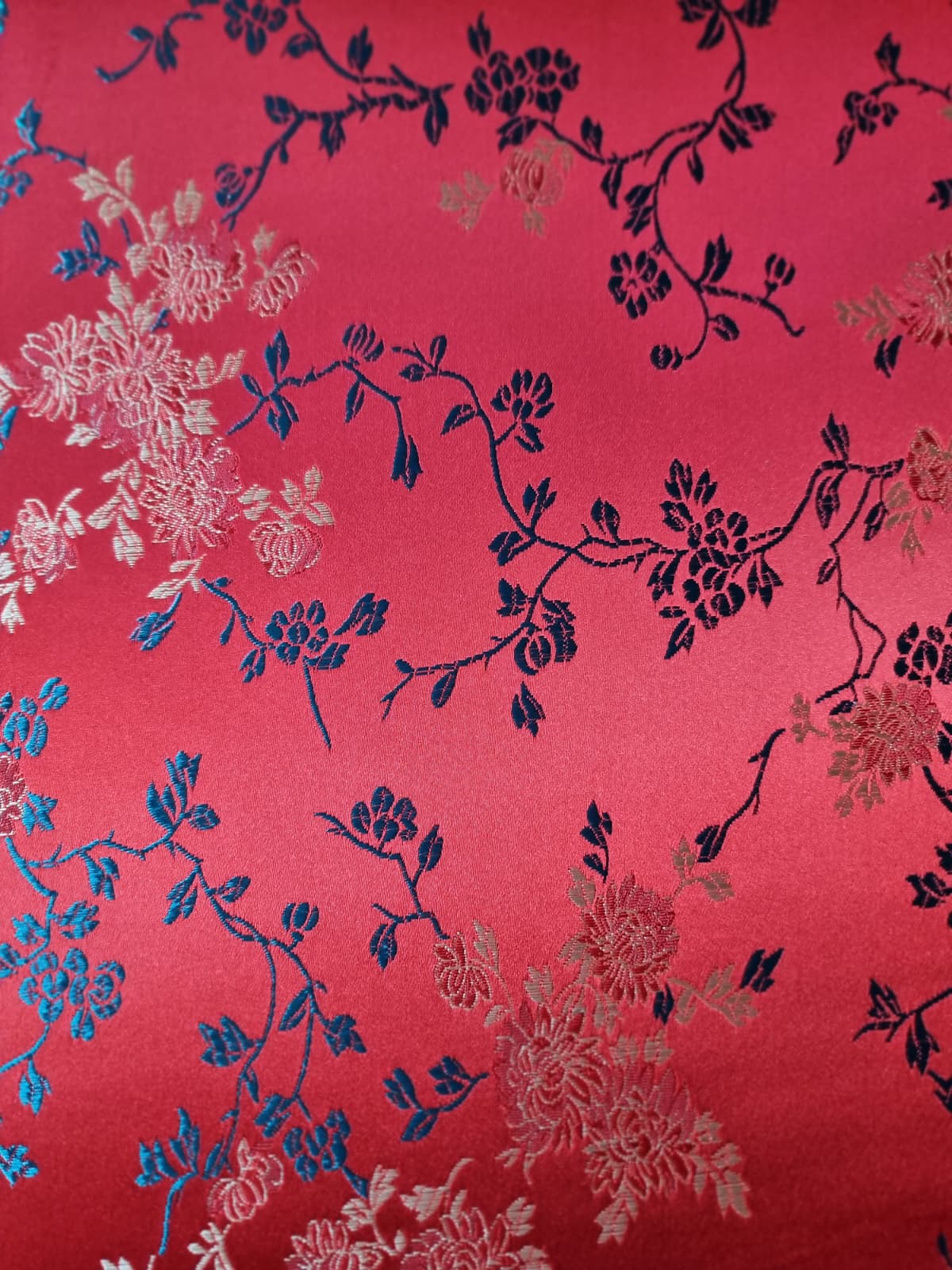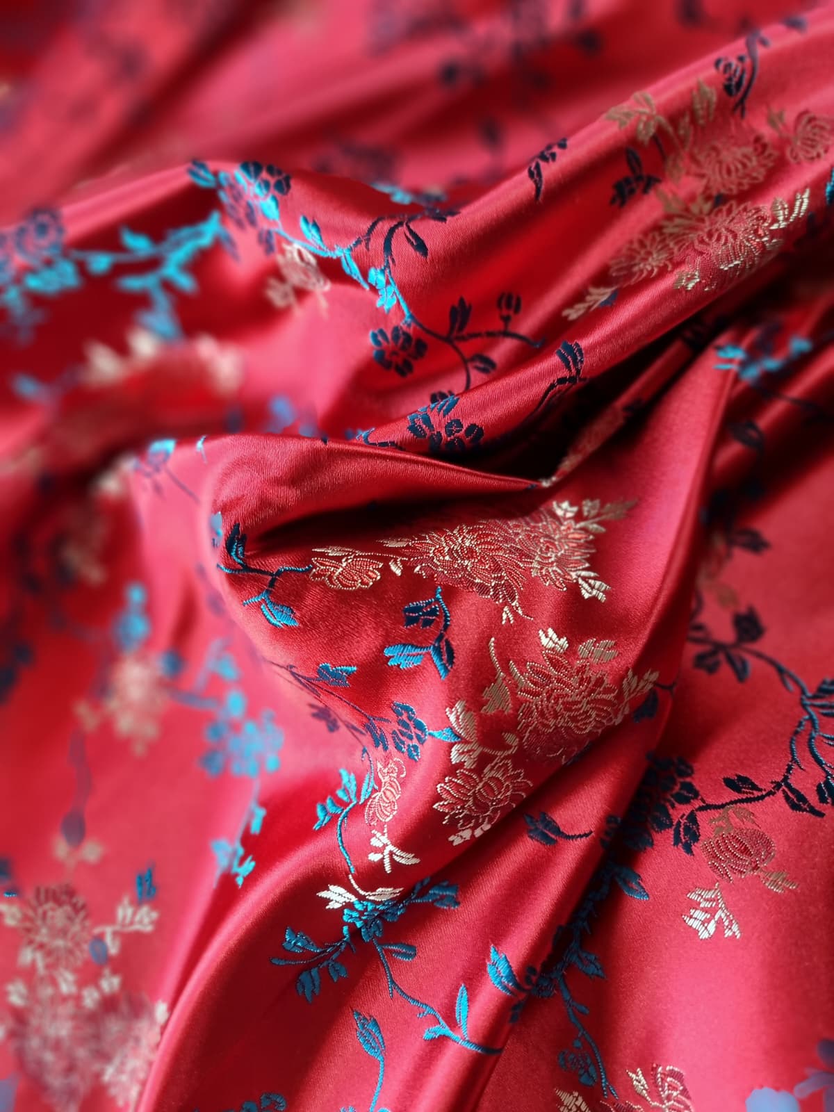 Tesatura Jacquard satinată cu flori albastre si aurii in stil asiatic pe fond Roșu