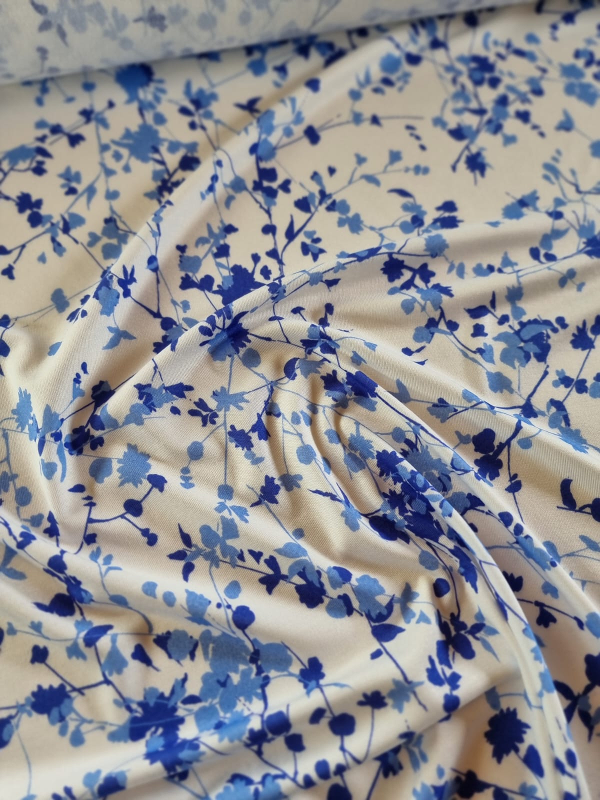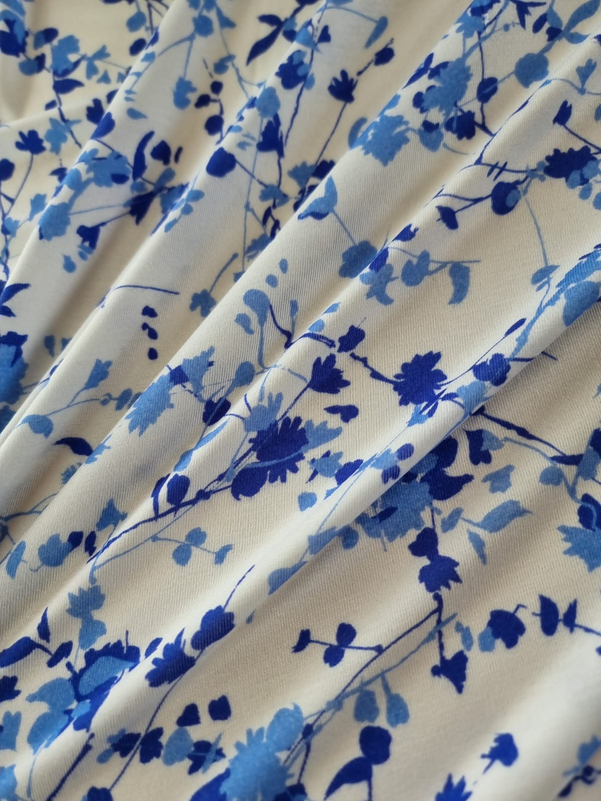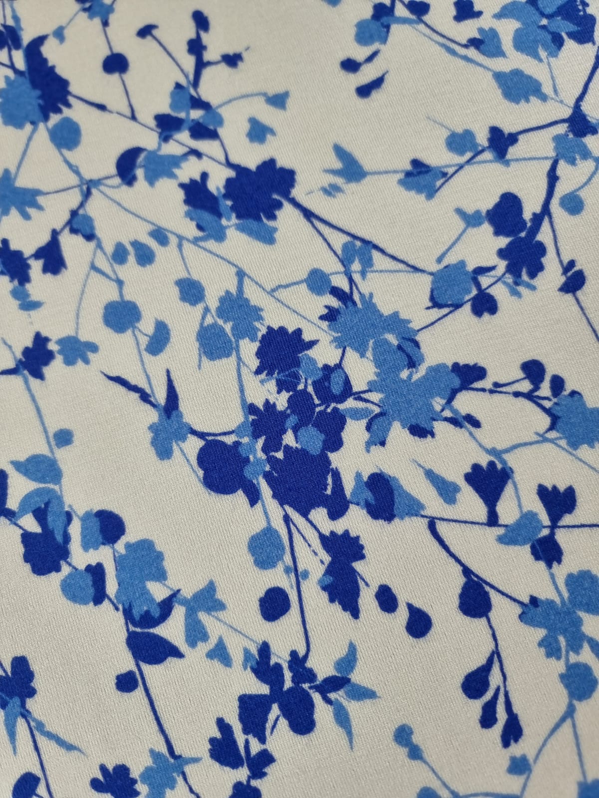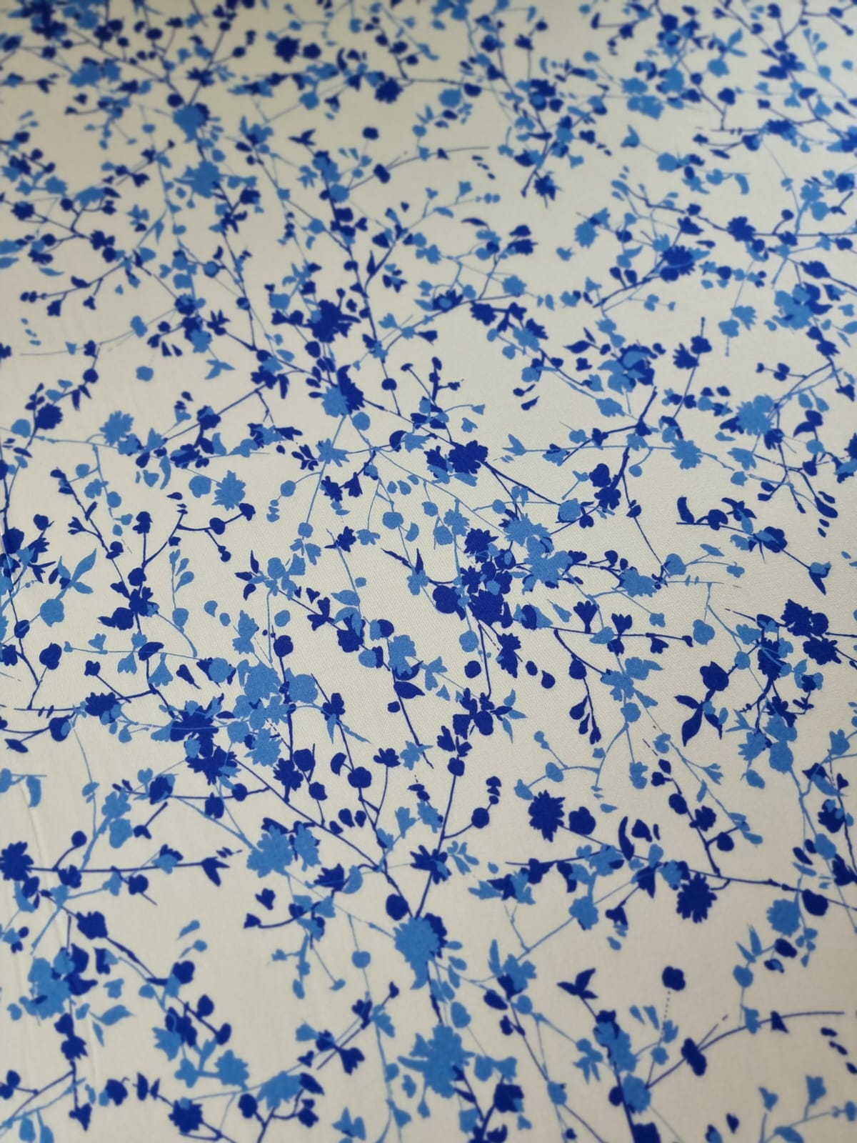 Tesatura jerse din viscoza cu imprimeu floral, Crenguțe în nuanțe de albastru pe fond Alb