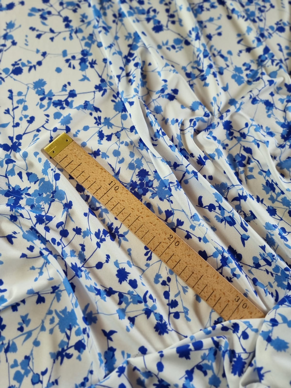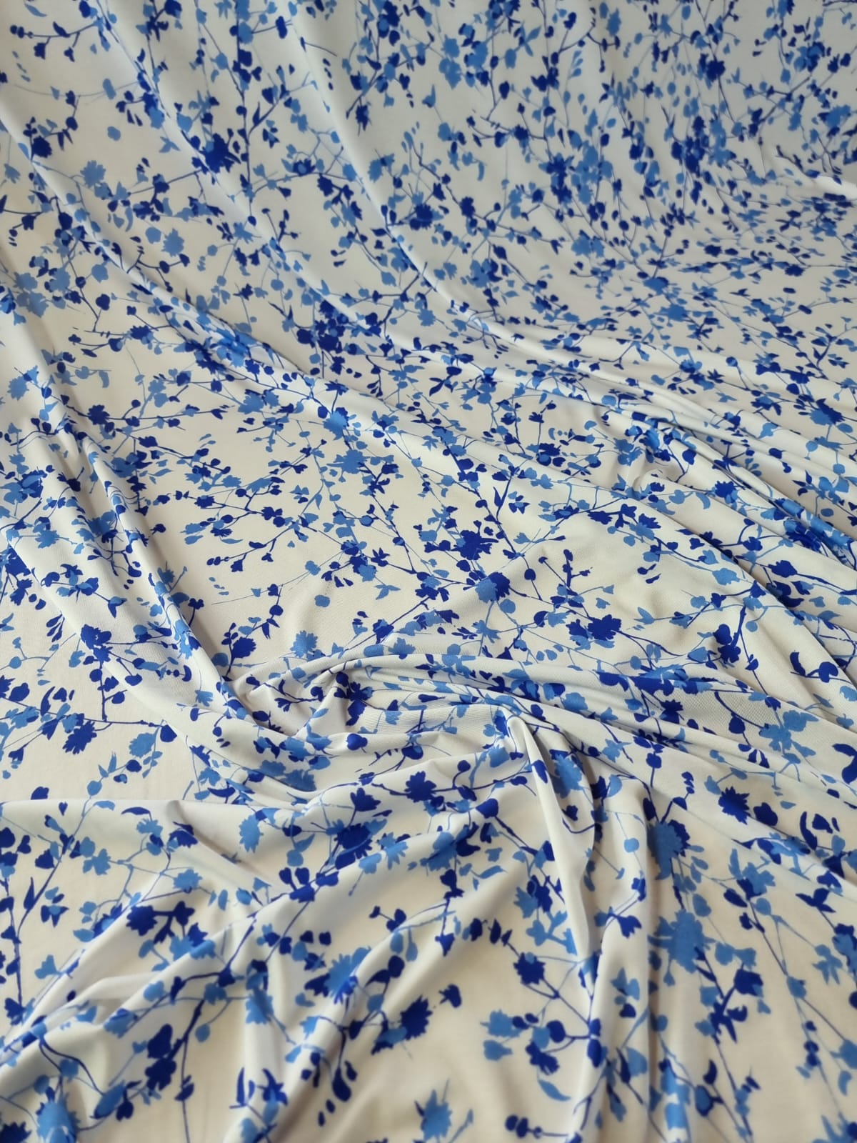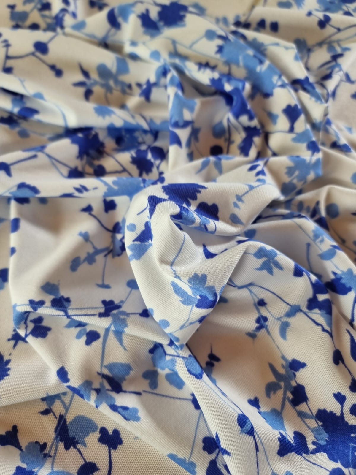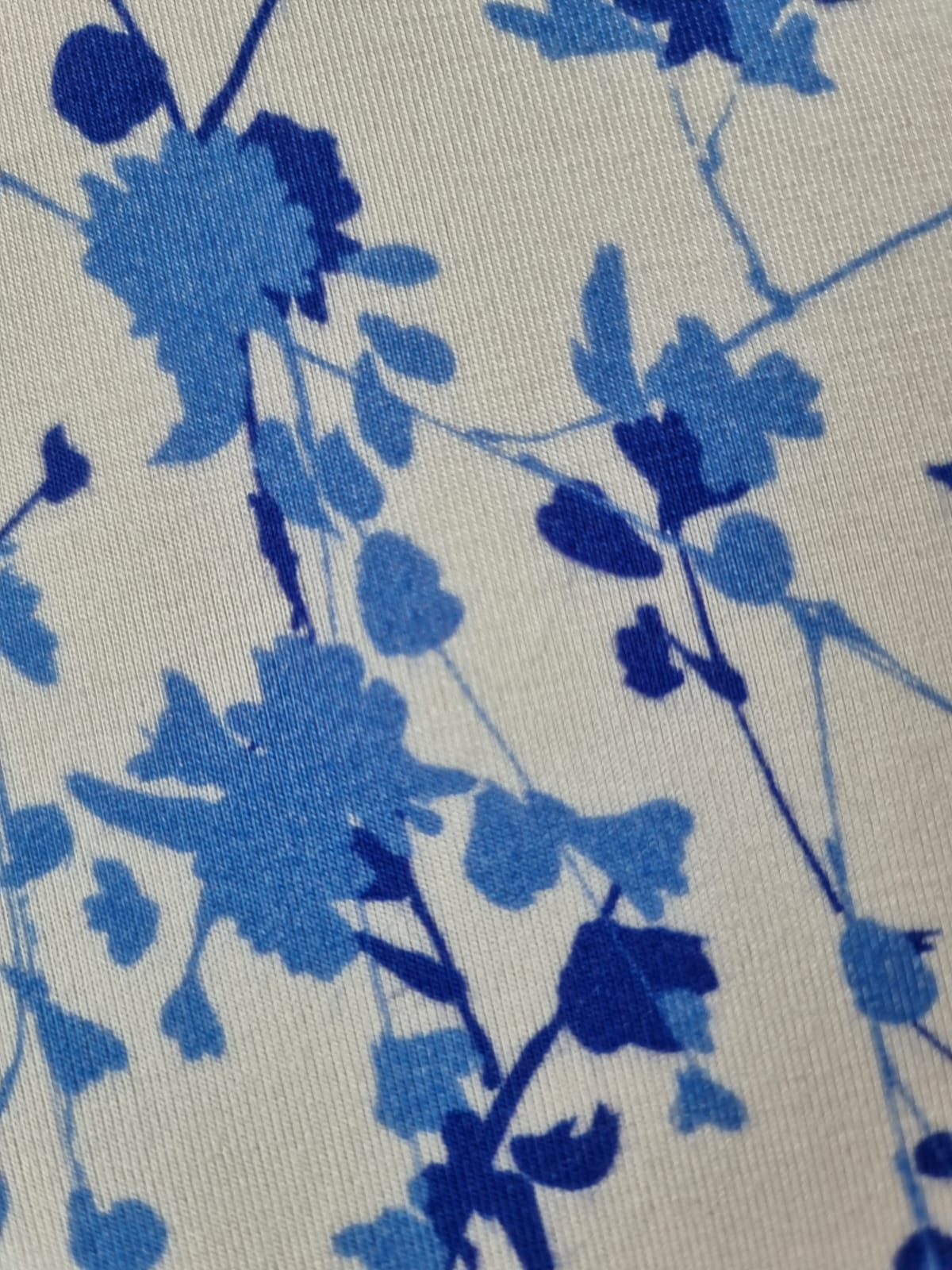 Tesatura jerse din viscoza cu imprimeu floral, Crenguțe în nuanțe de albastru pe fond Alb