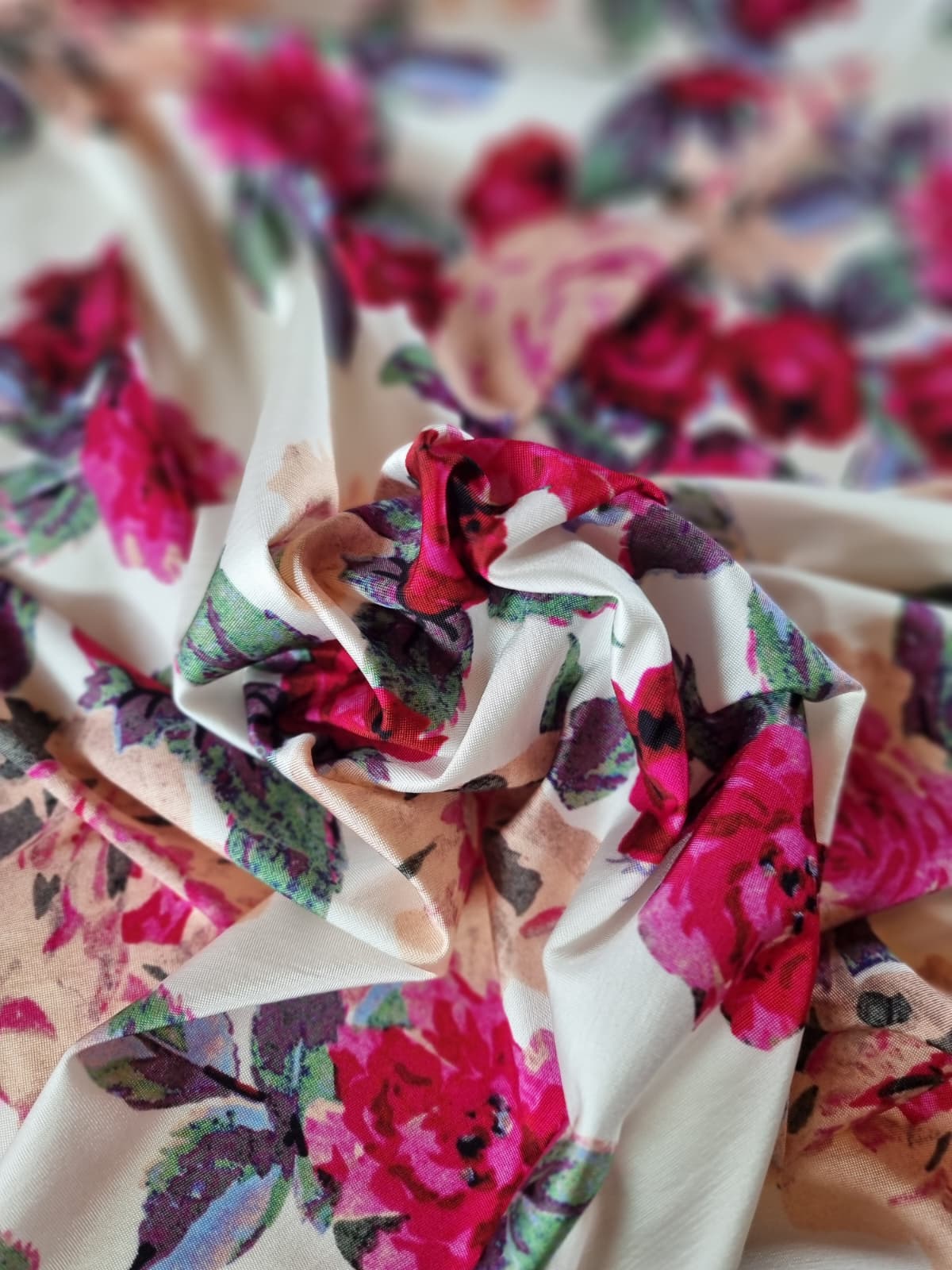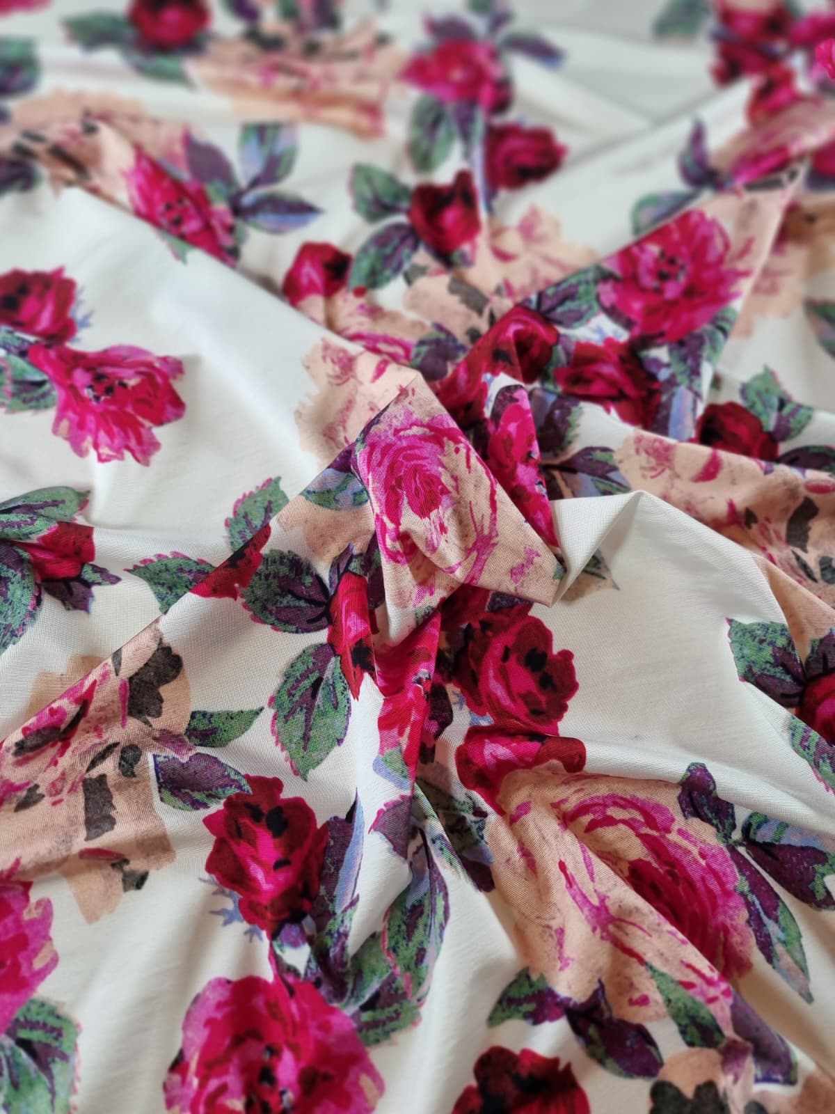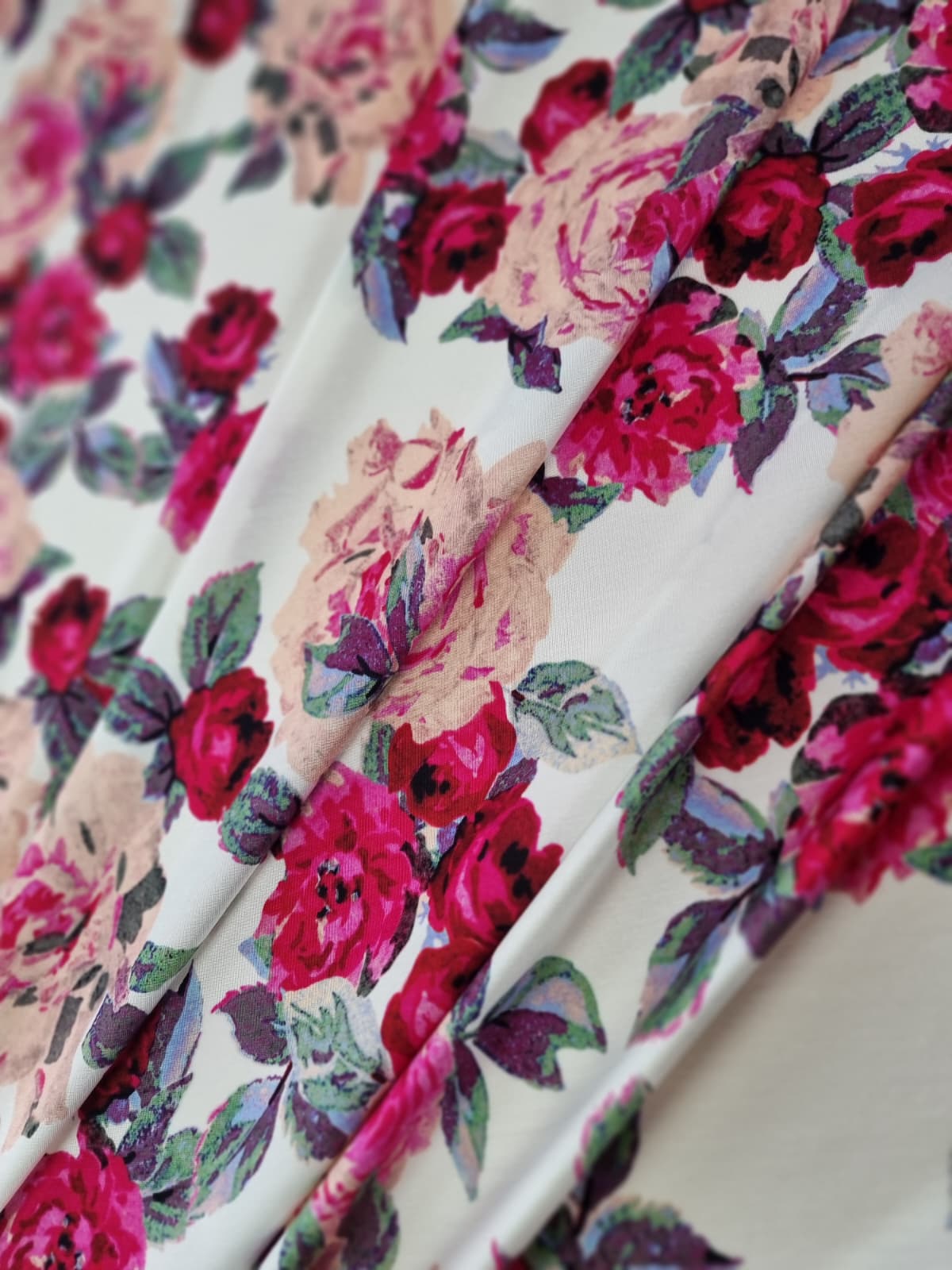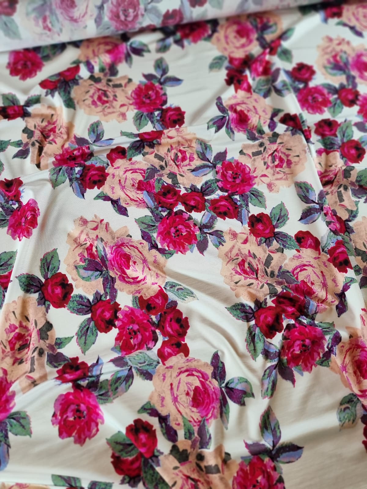 Tesatura jerse din viscoza – Imprimeu cu flori vișinii – piersicii pe fond Ivoire