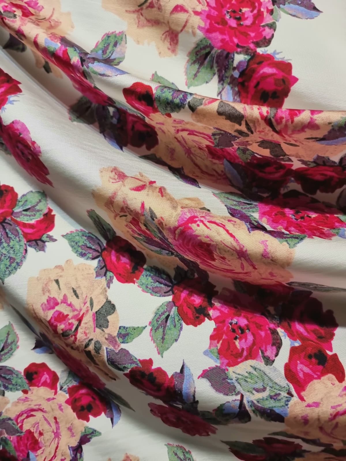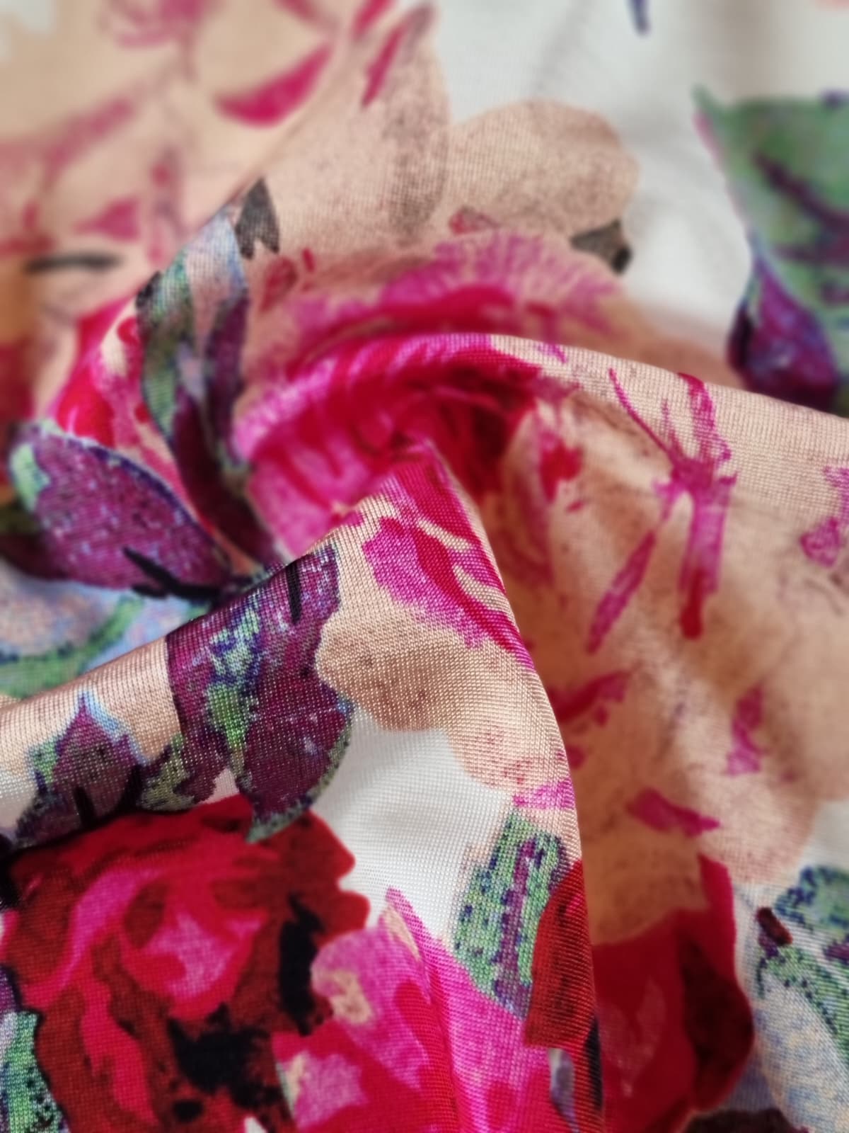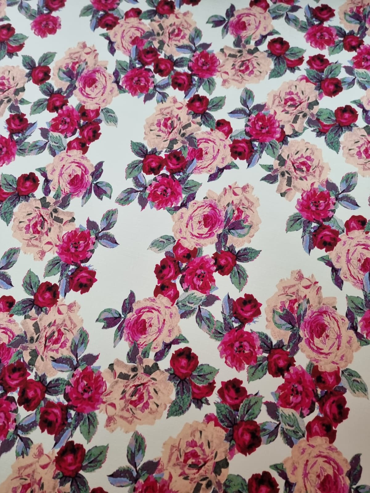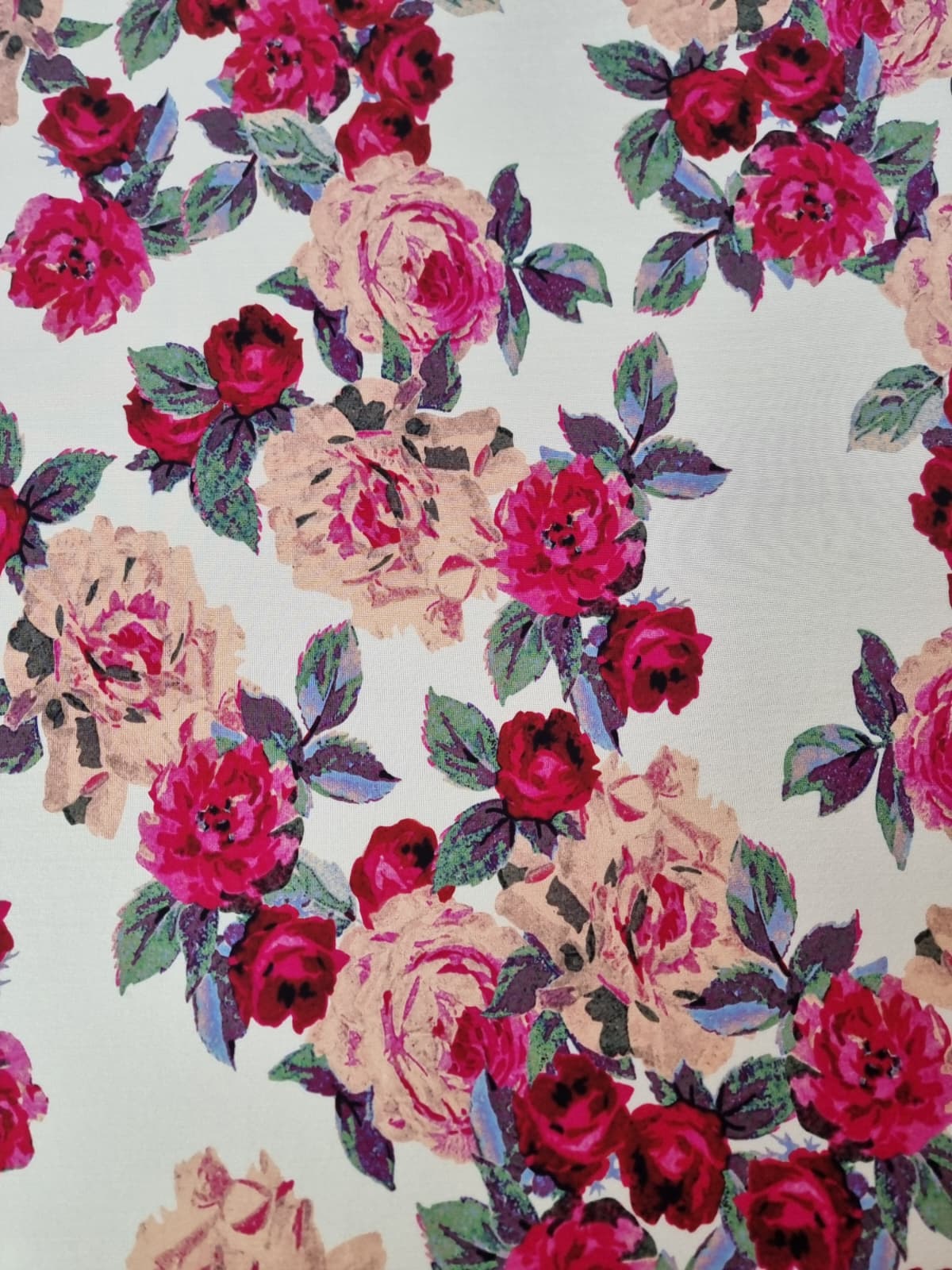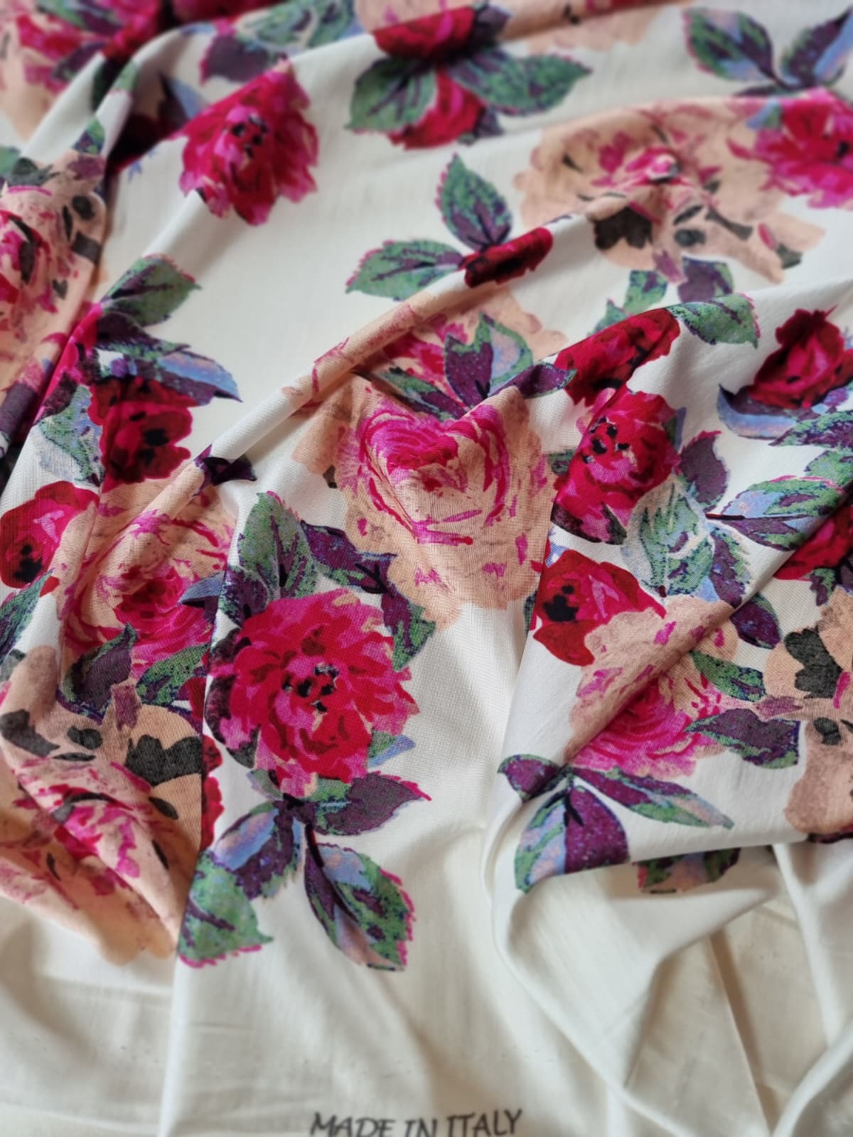 Tesatura jerse din viscoza – Imprimeu cu flori vișinii – piersicii pe fond Ivoire