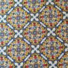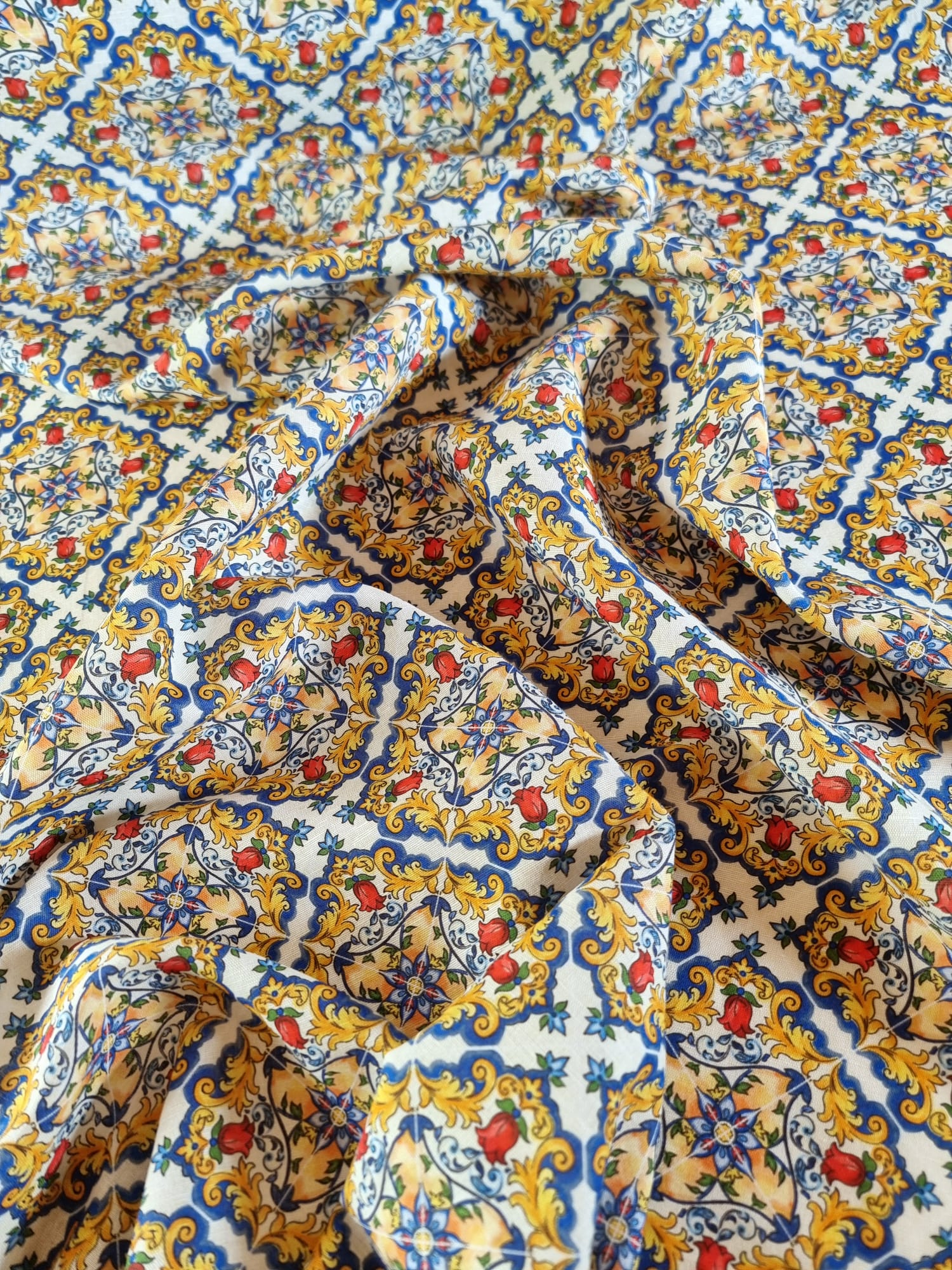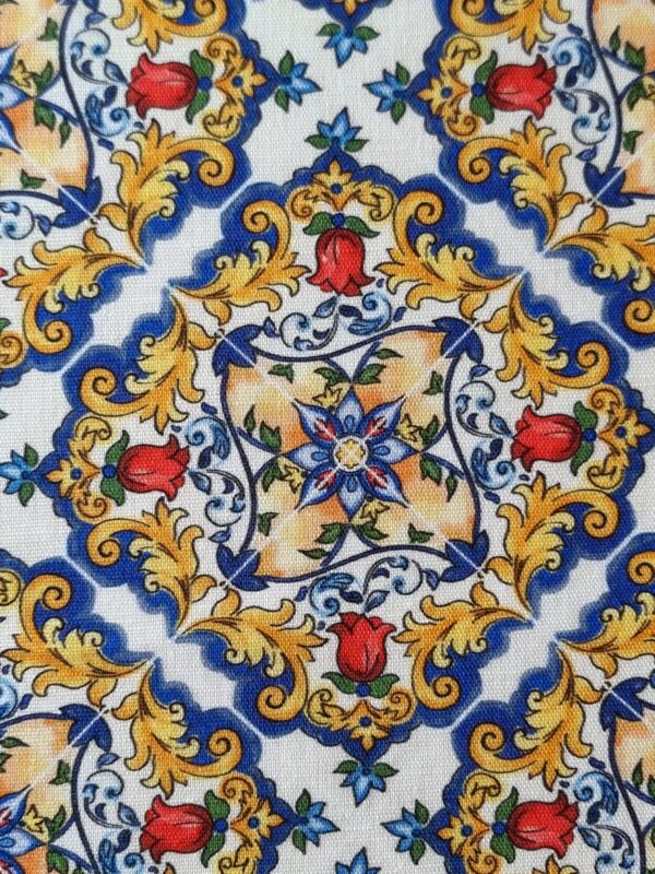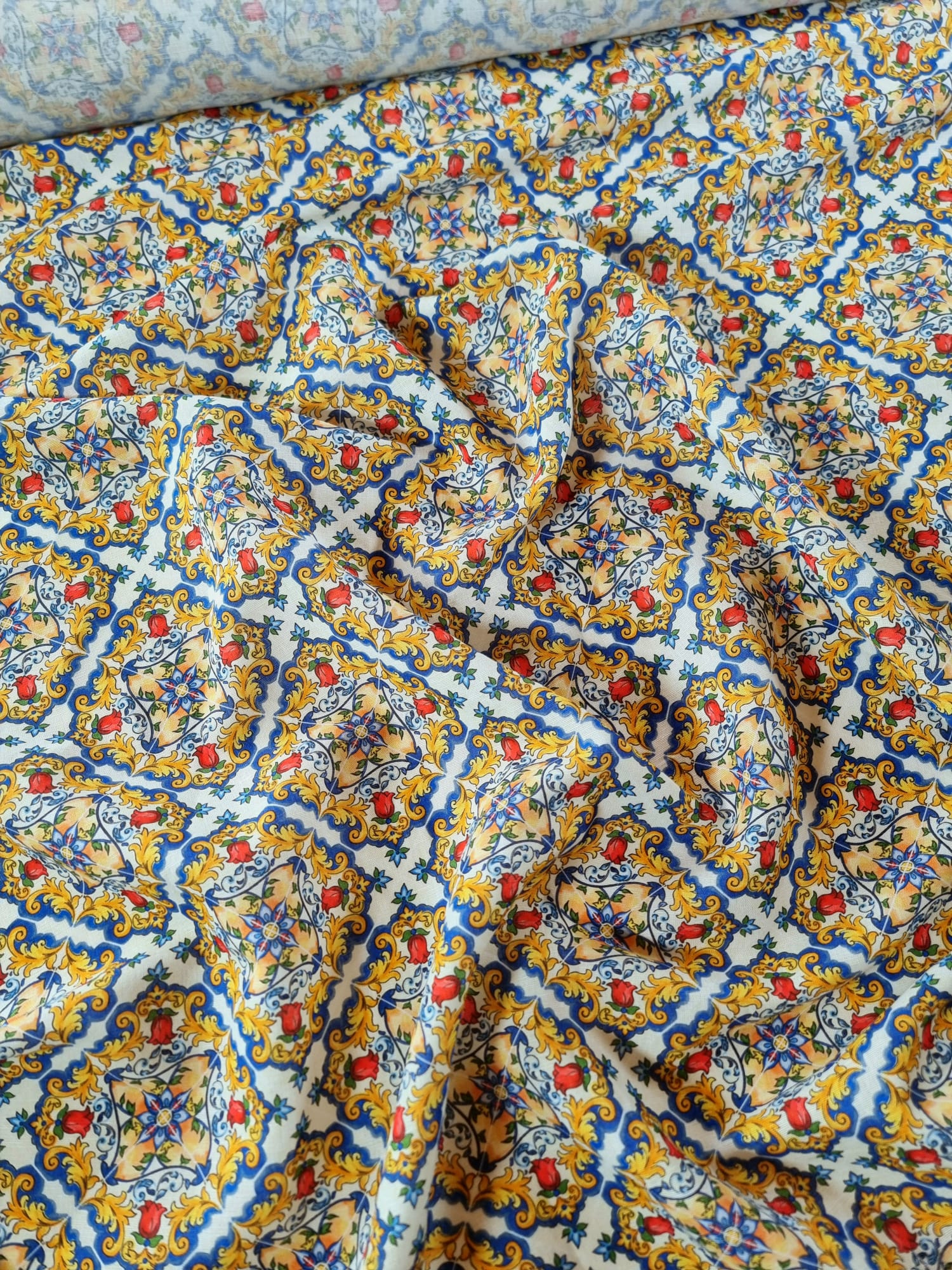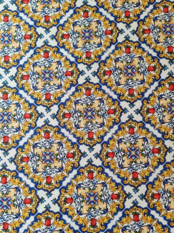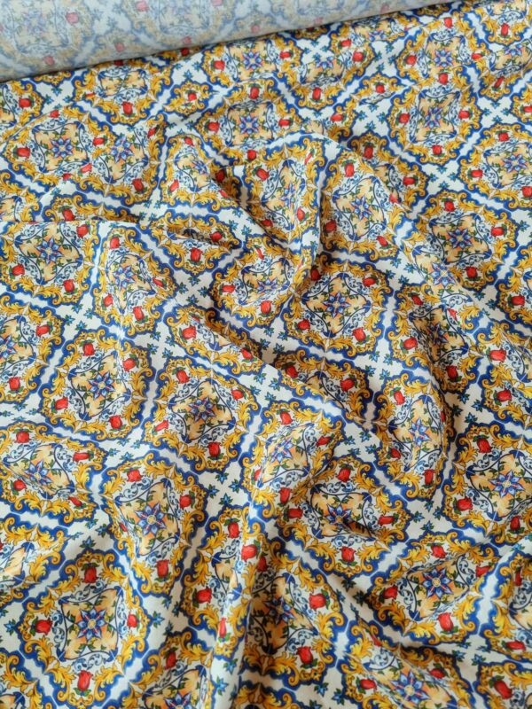 Tesatura mixta de in cu bumbac – Imprimeu etno, Albastru/Galben/Rosu