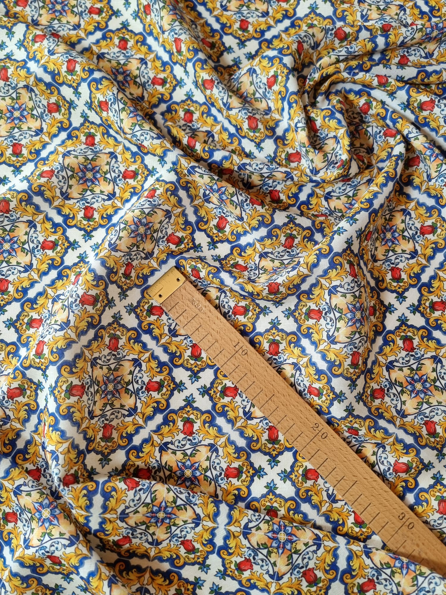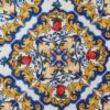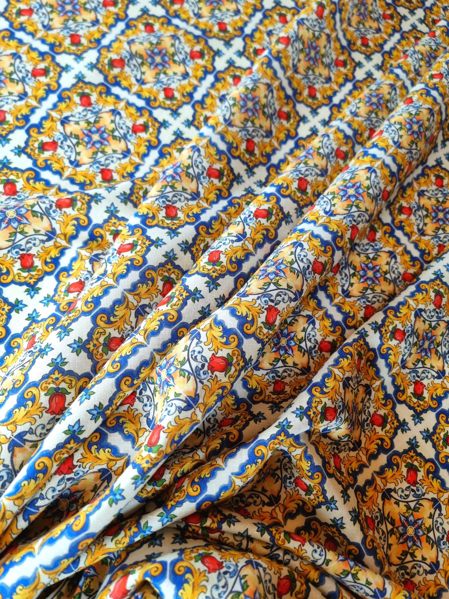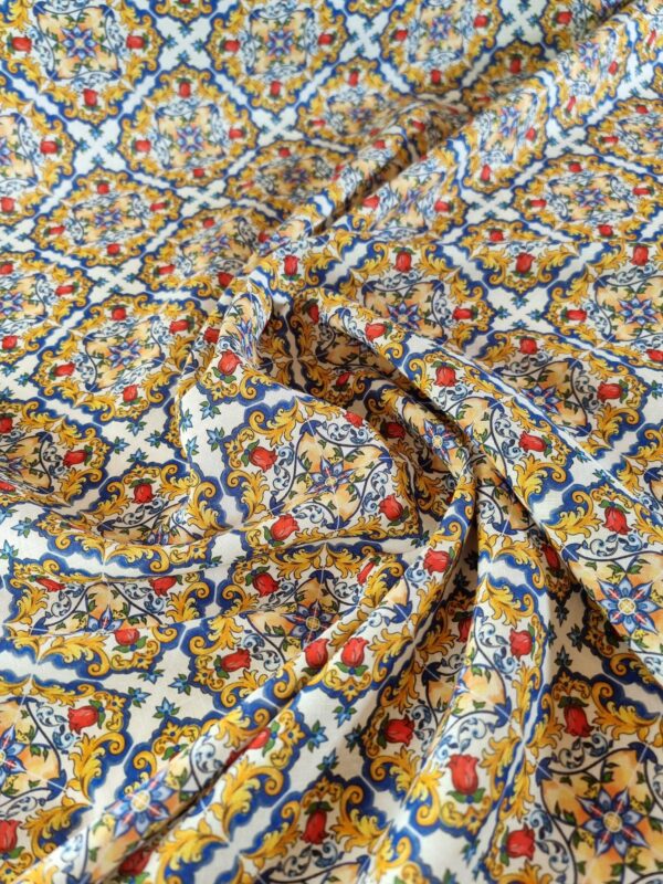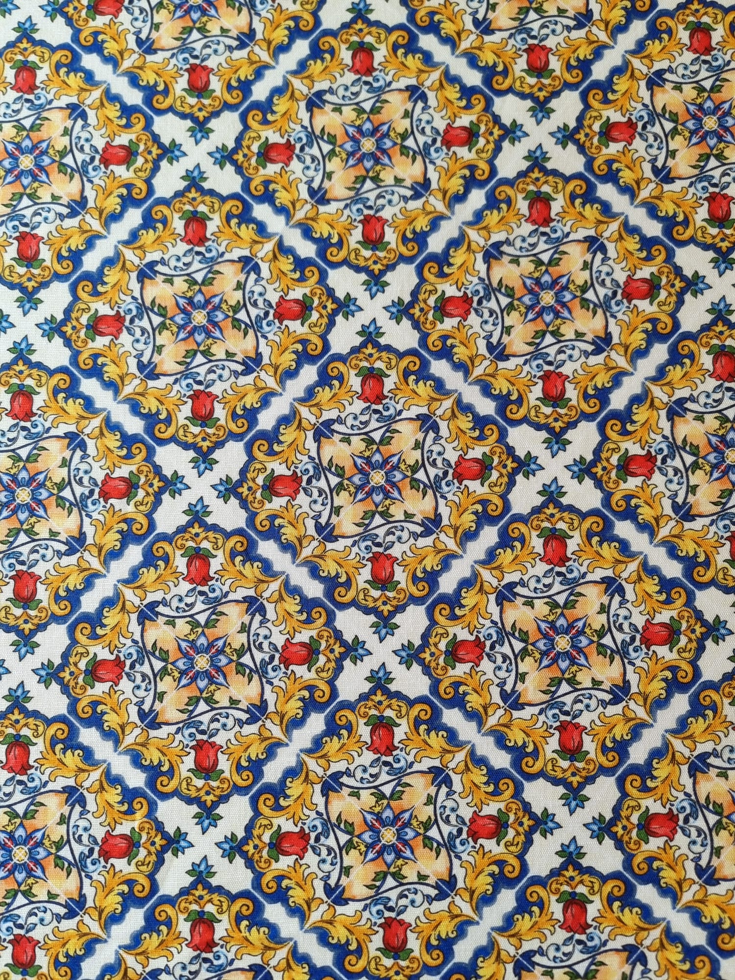 Tesatura mixta de in cu bumbac – Imprimeu etno, Albastru/Galben/Rosu