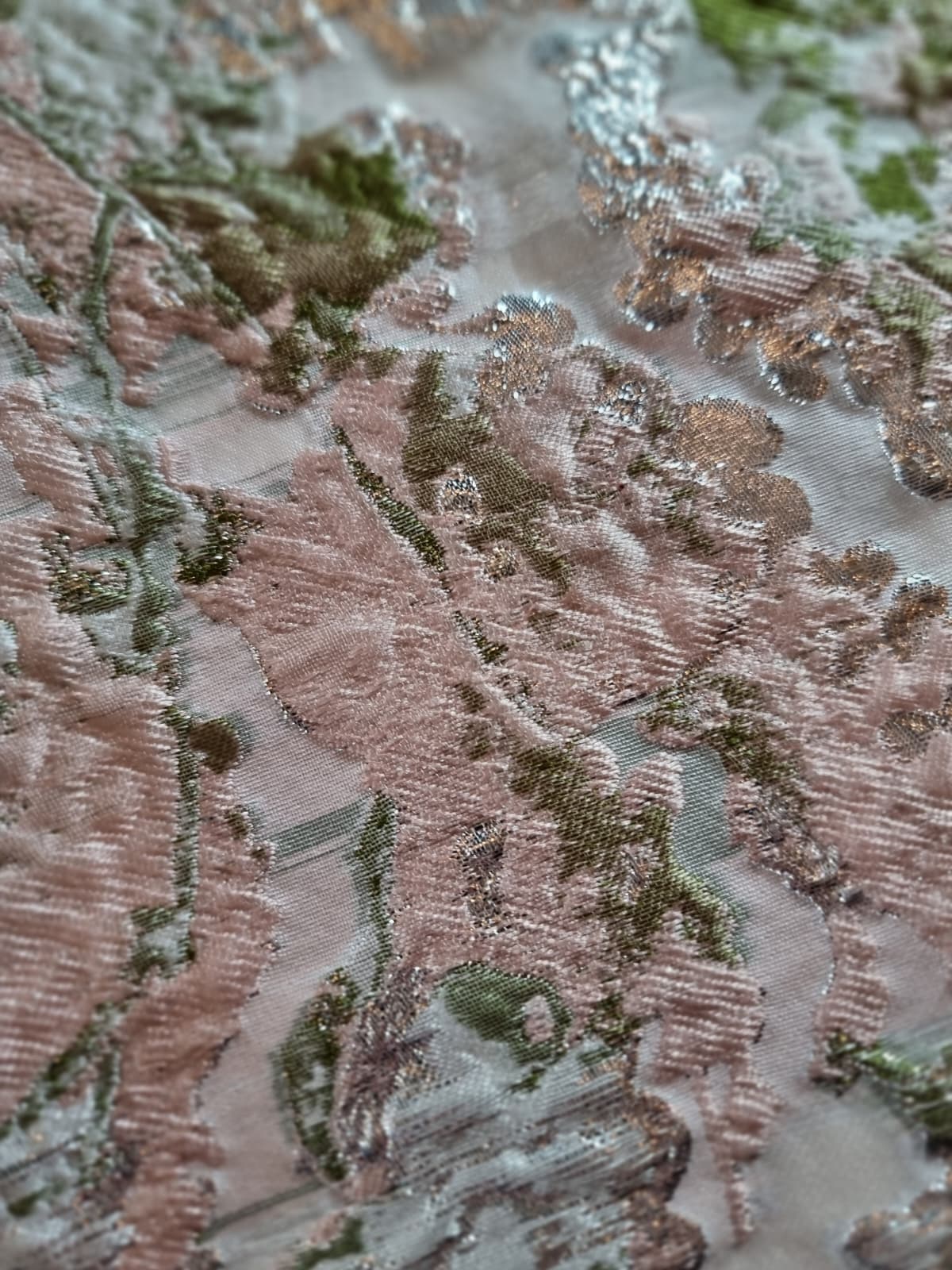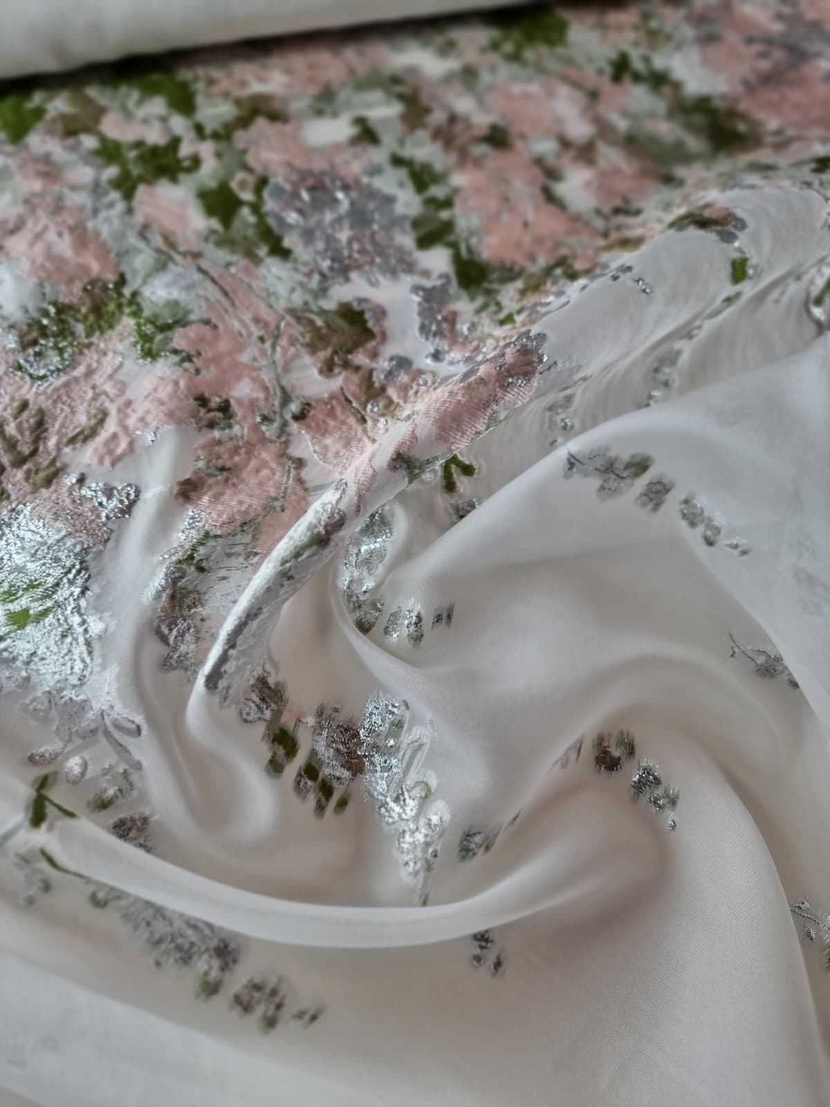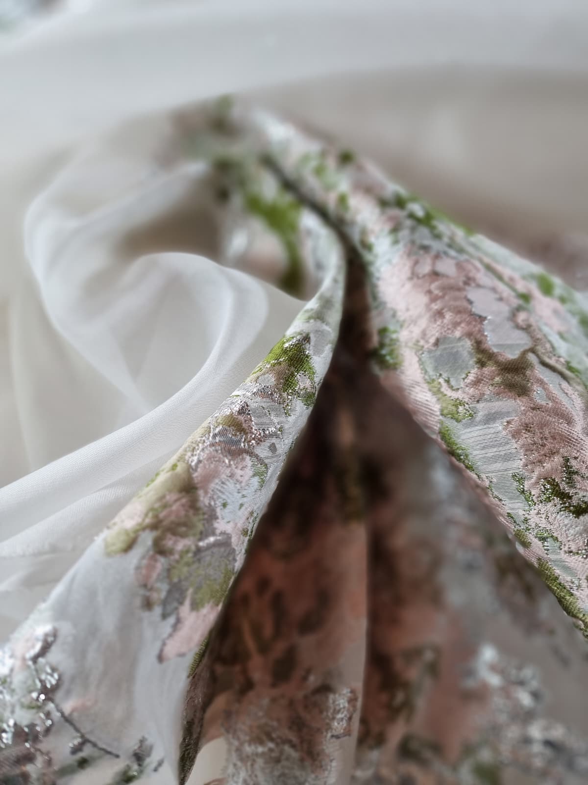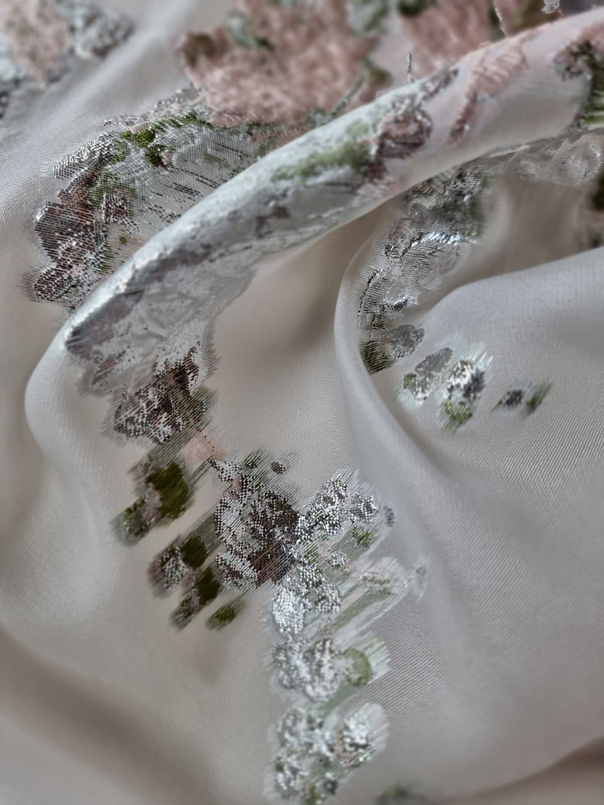 Tesatura Organza cu matase naturala si insertii de fir lurex – tip panou si design floral, cu bordură Roz pal si Verde kaki pe fond Ivoire