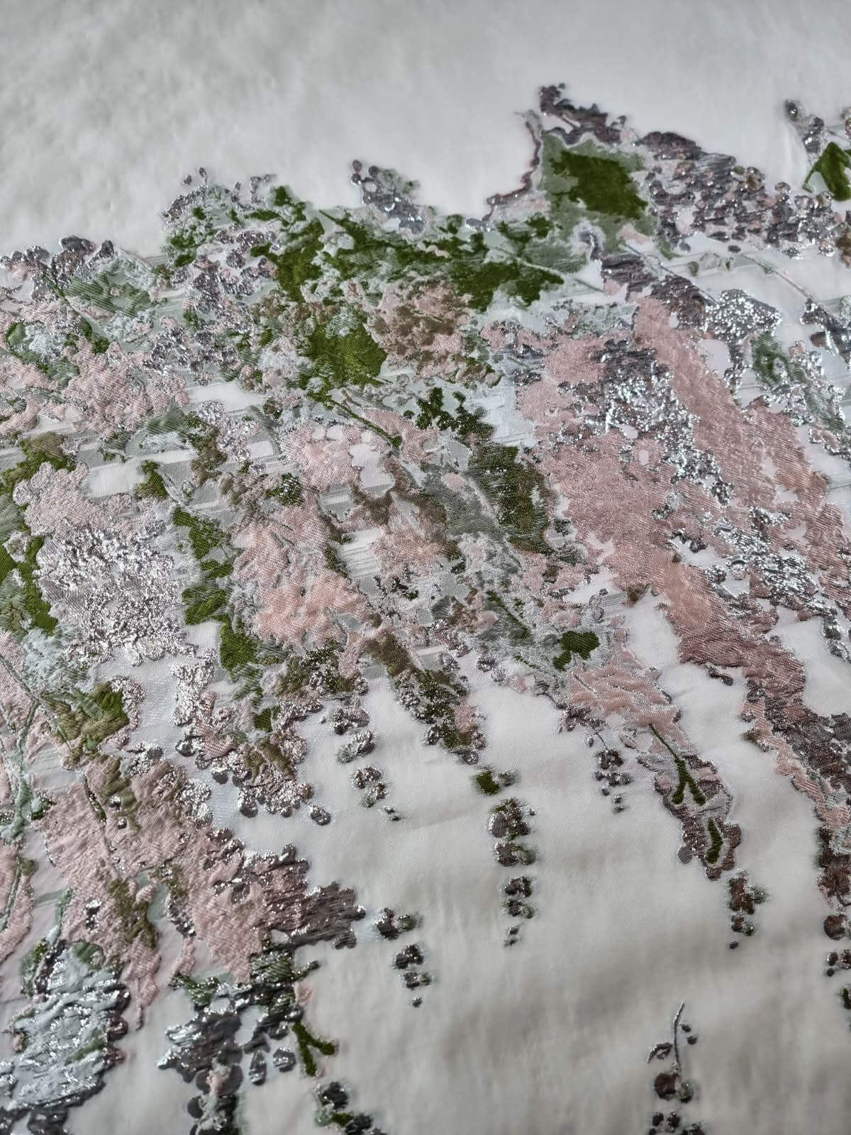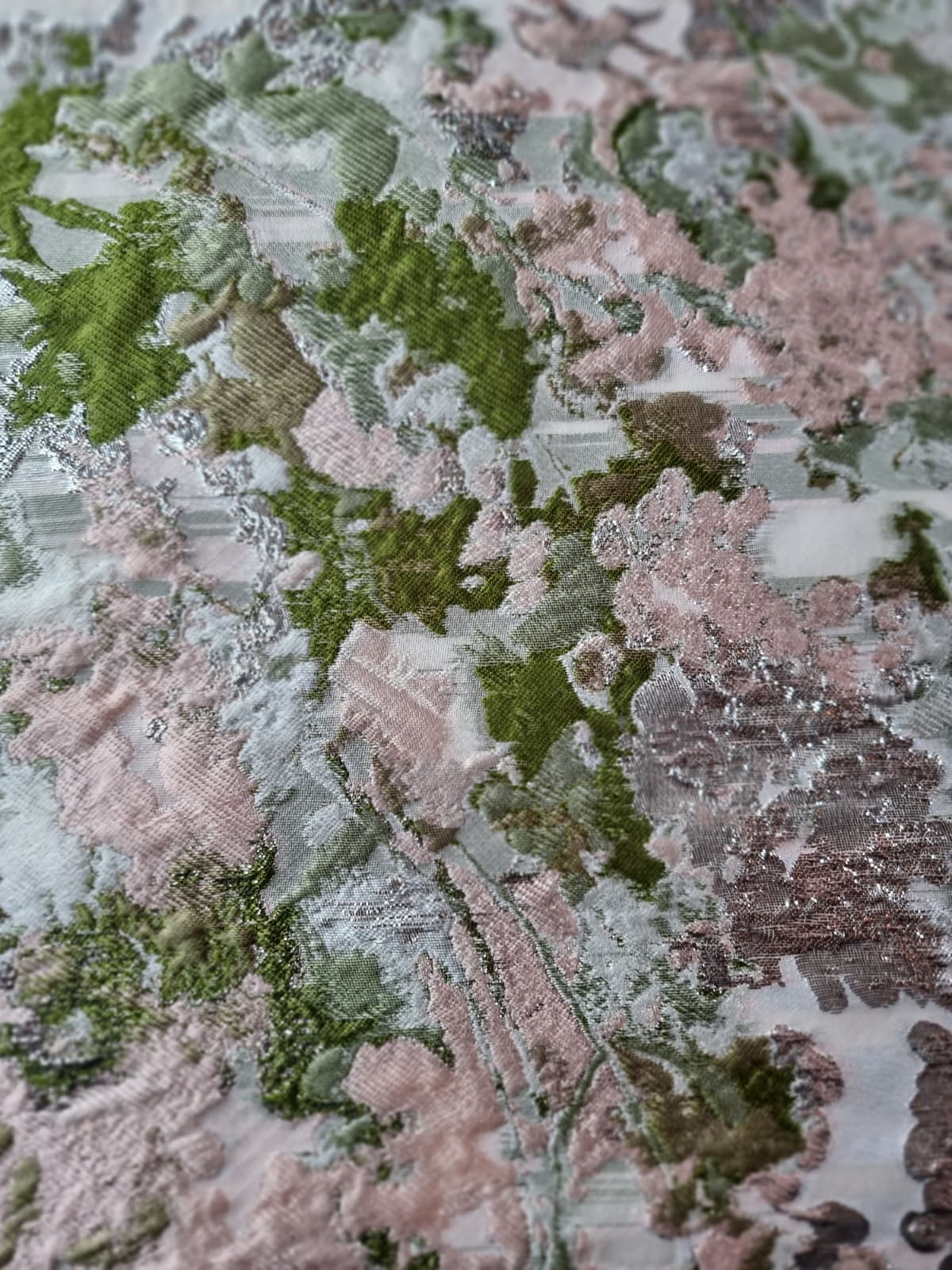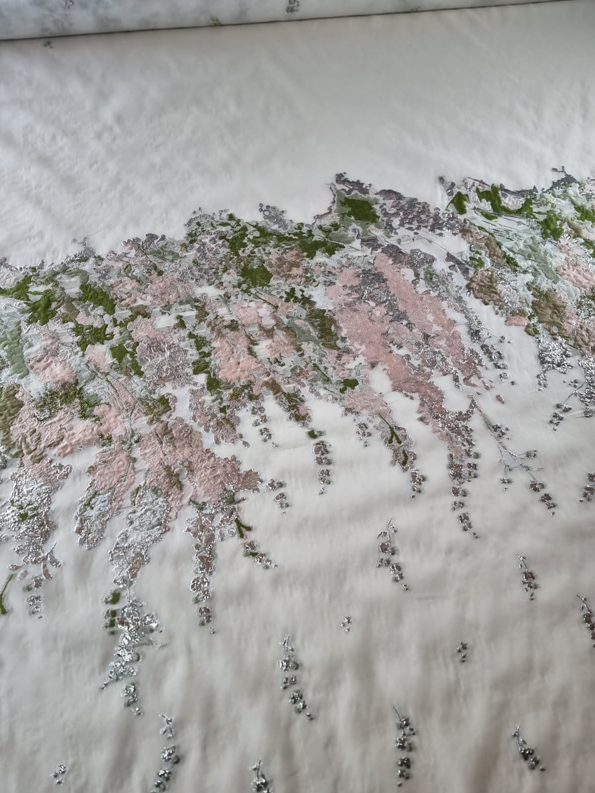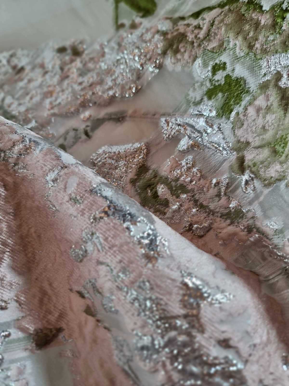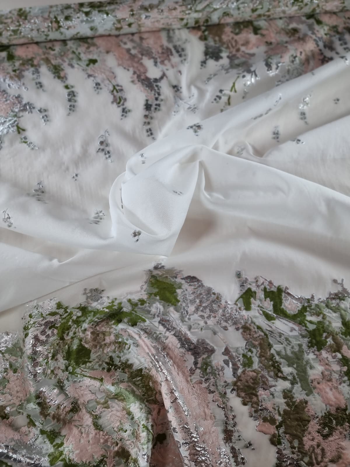 Tesatura Organza cu matase naturala si insertii de fir lurex – tip panou si design floral, cu bordură Roz pal si Verde kaki pe fond Ivoire