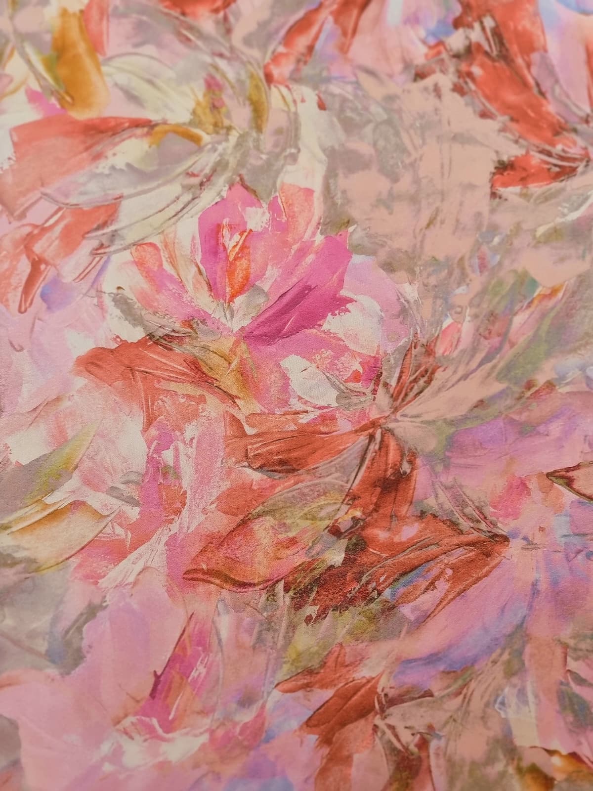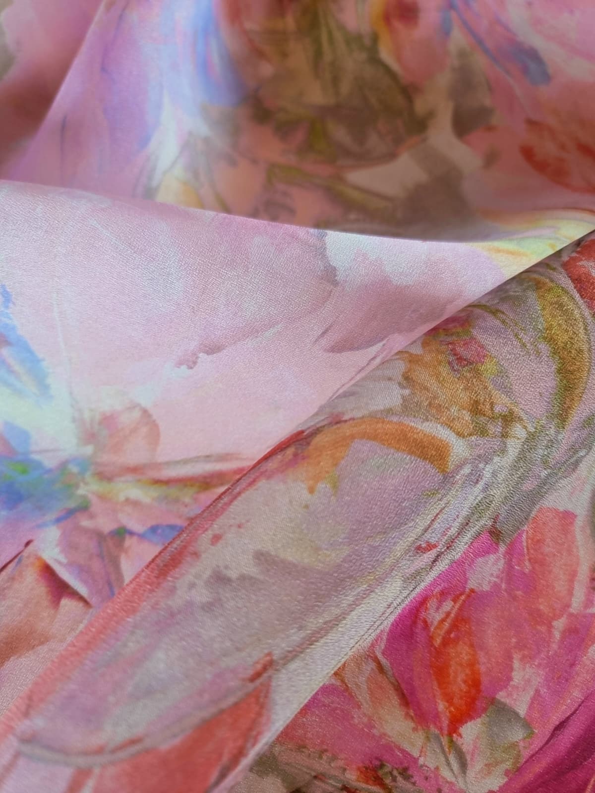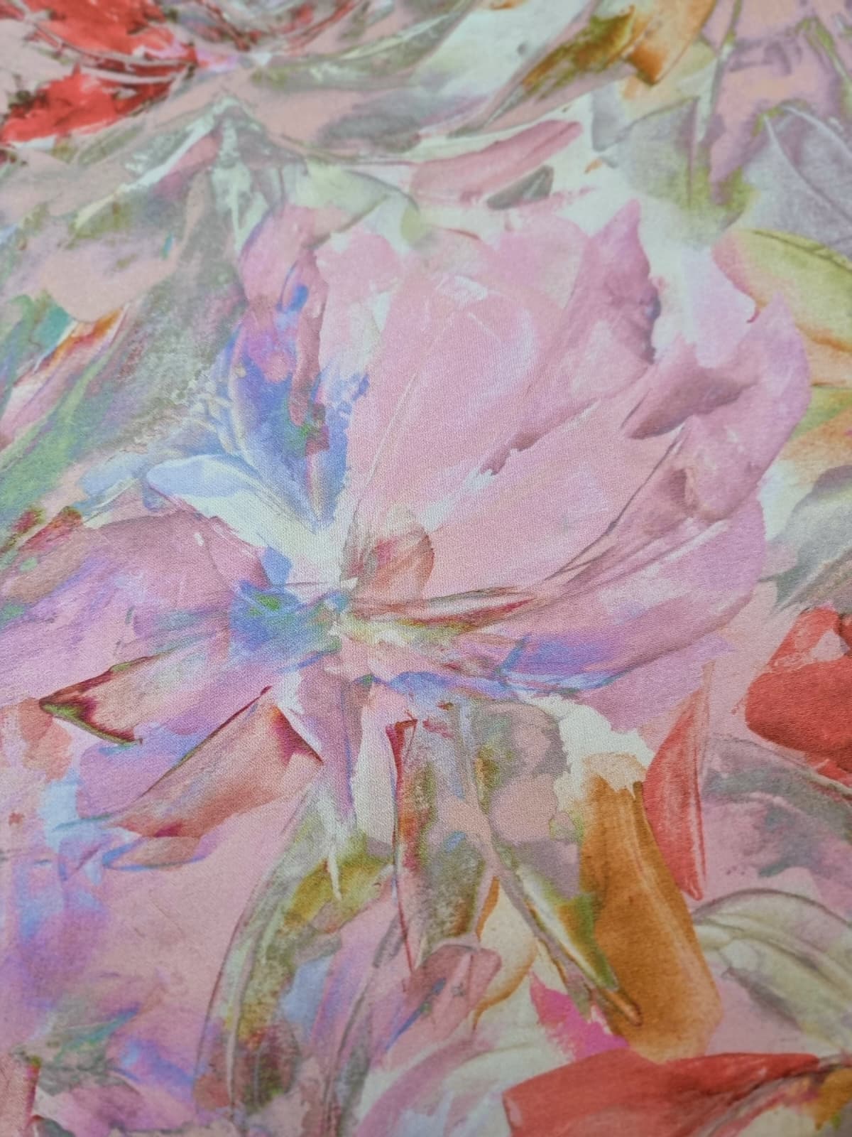 Tesatura Organza din matase naturala – model cu flori picturale pastel, nuanțe de Roz / Verde / Roscat
