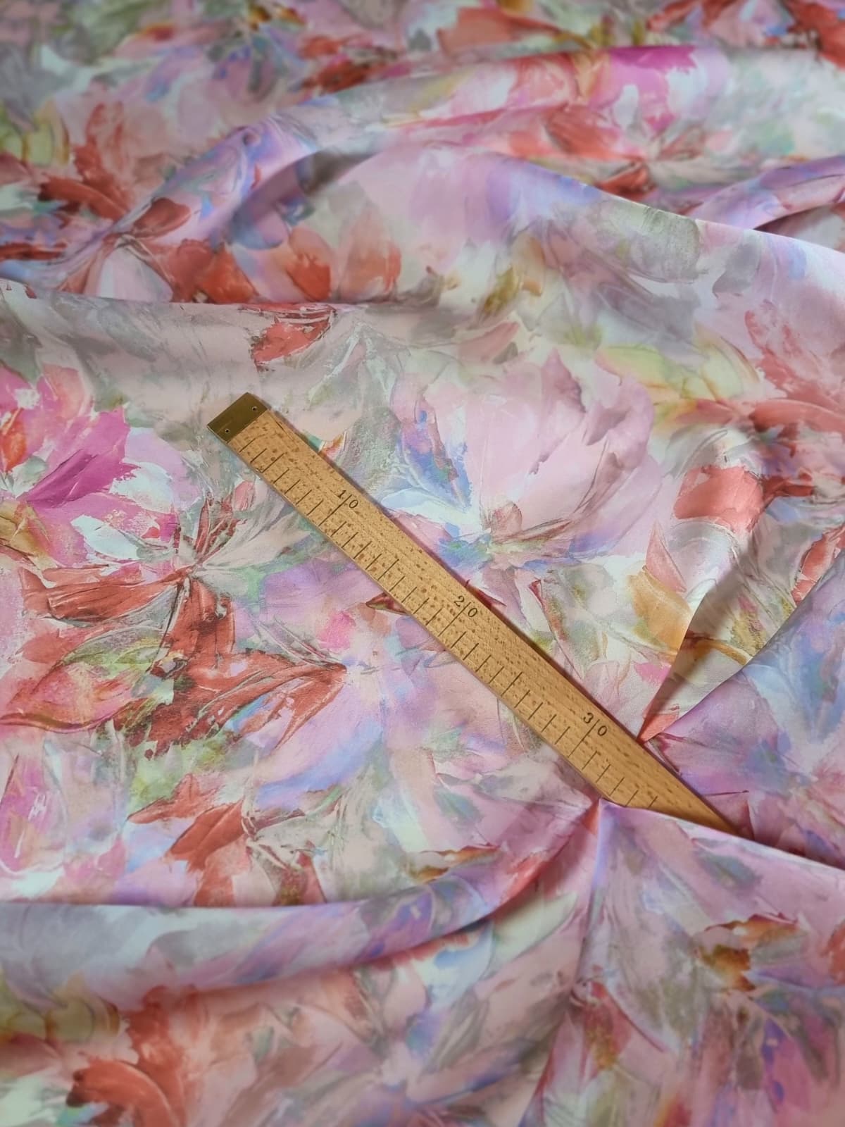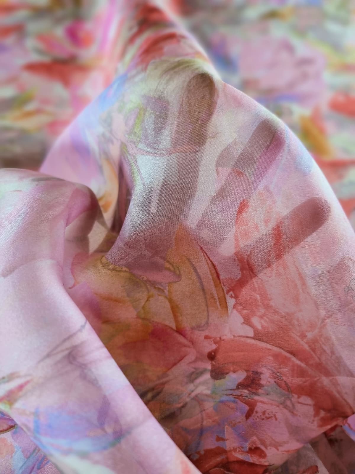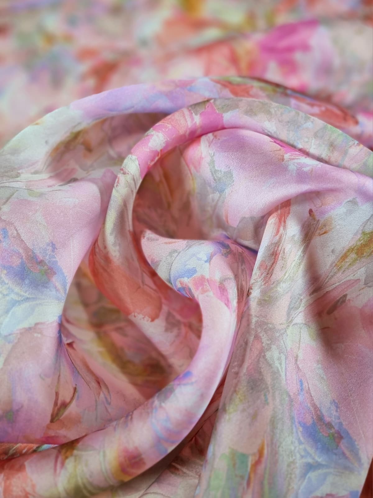 Tesatura Organza din matase naturala – model cu flori picturale pastel, nuanțe de Roz / Verde / Roscat
