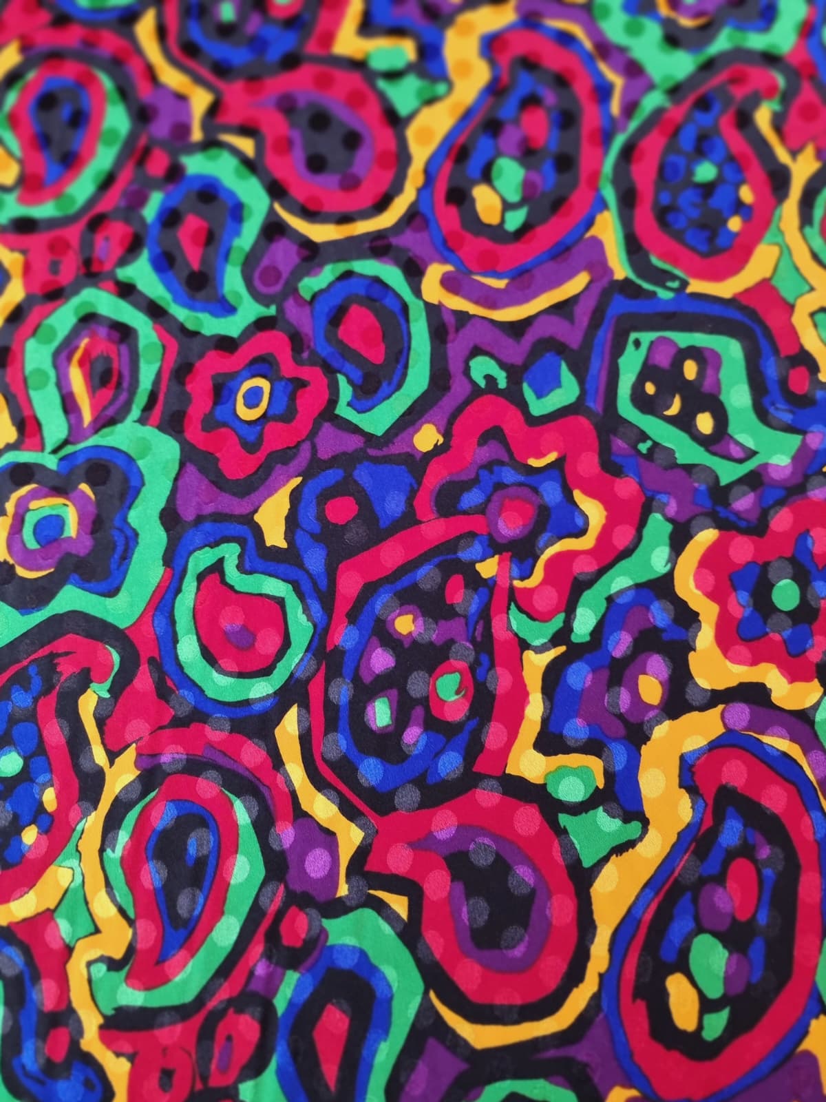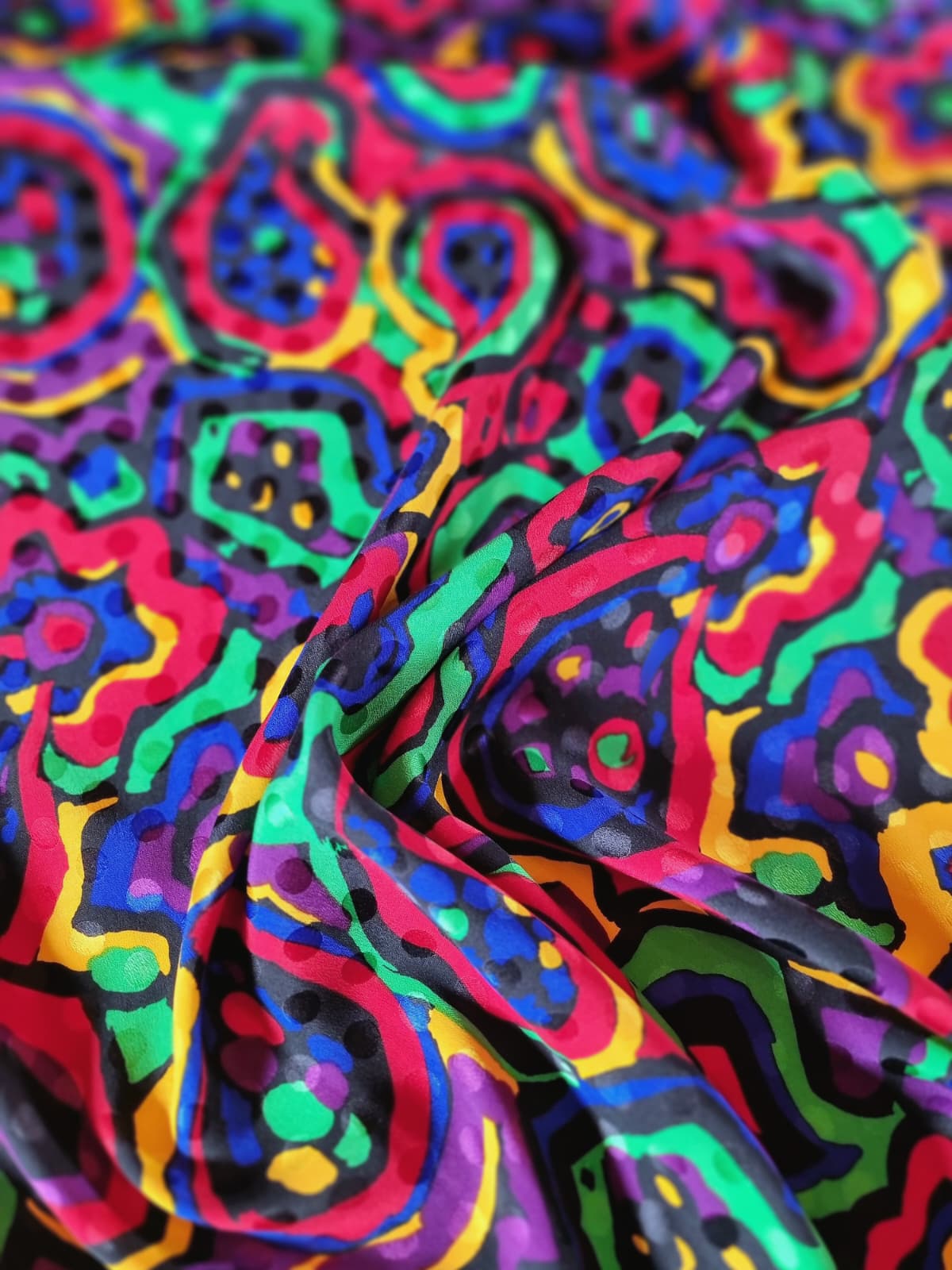 Tesatura premium – crepe din matase naturala tip jacquard – design abstract in culori vii, Rosu / Verde / Galben / Albastru