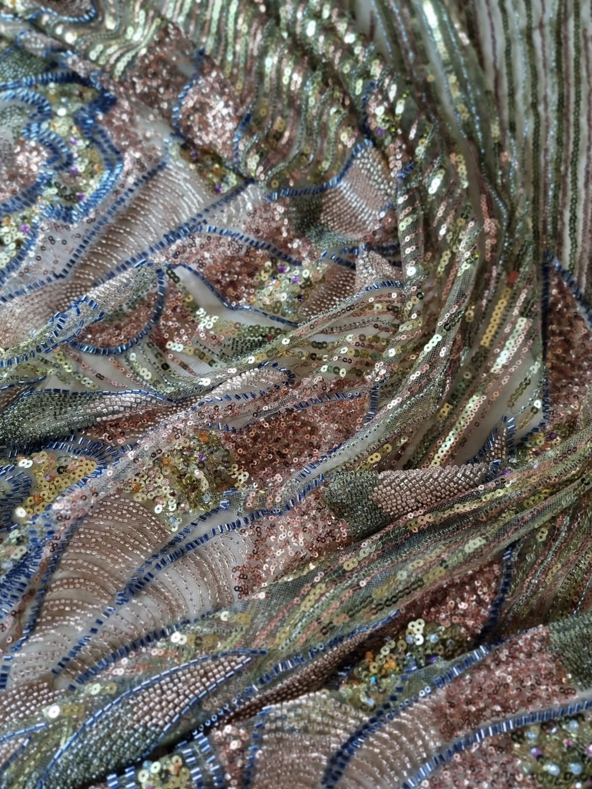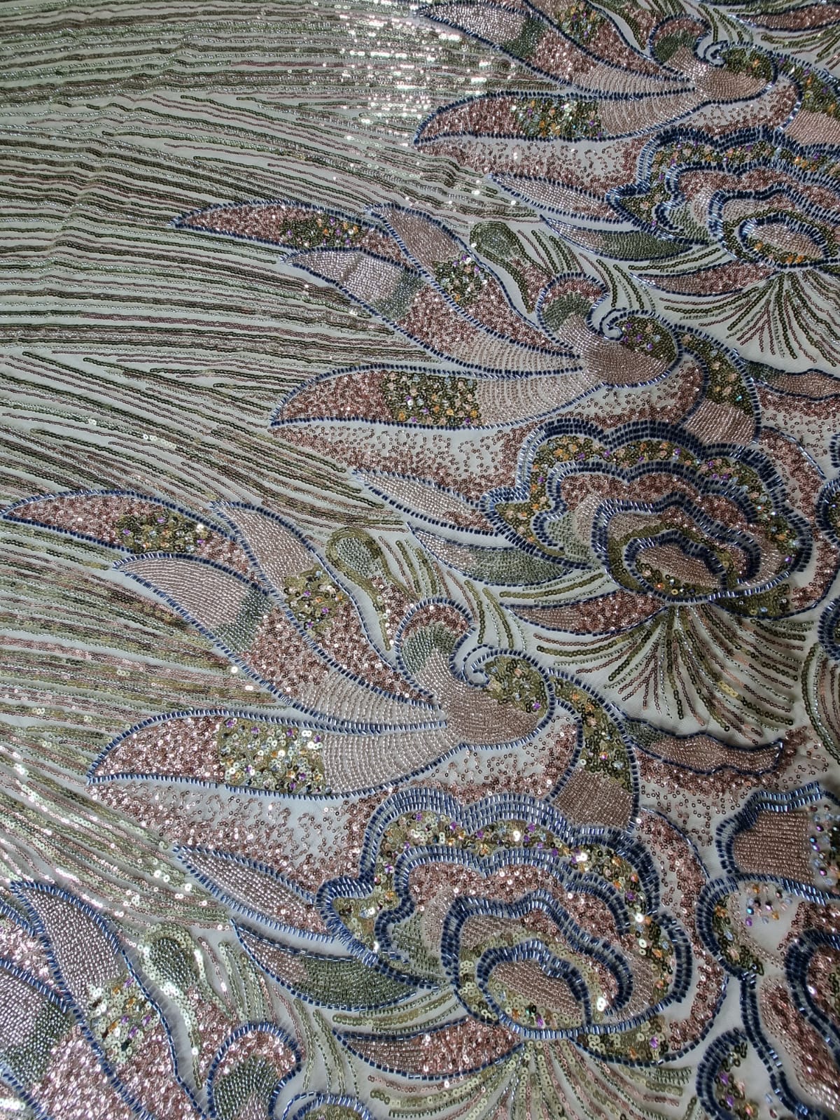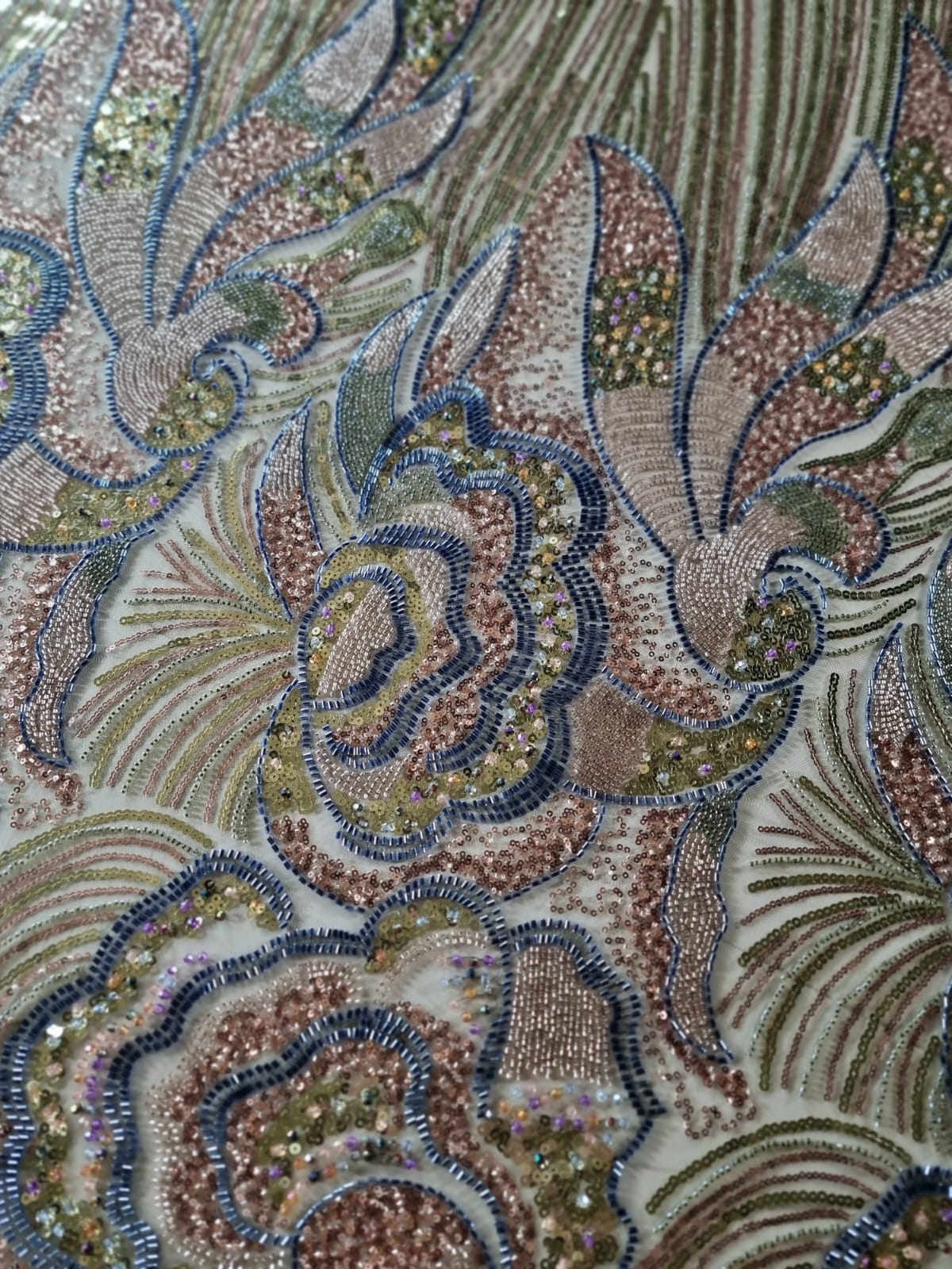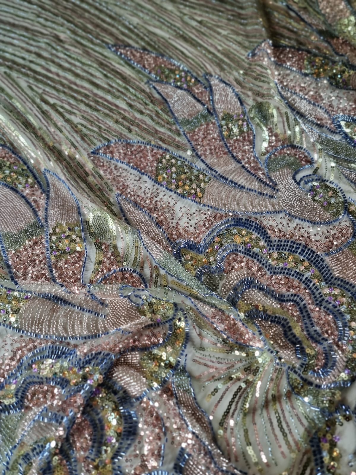 Tesatura premium cu paiete si margele aplicate pe suport de tulle usor elastic, Verde fistic / Grena / Albastru
