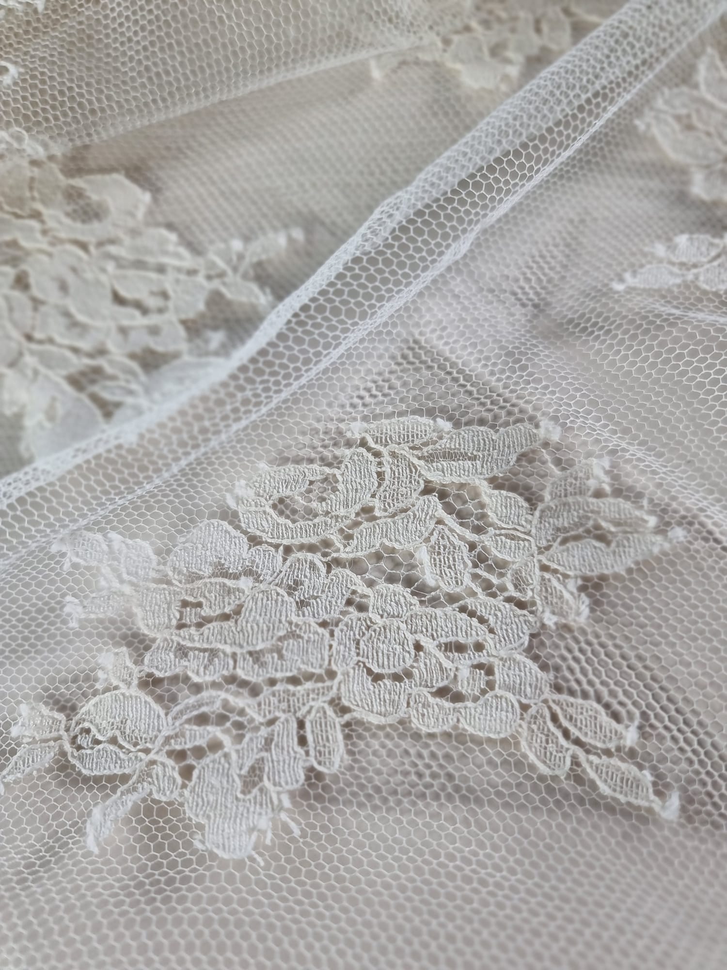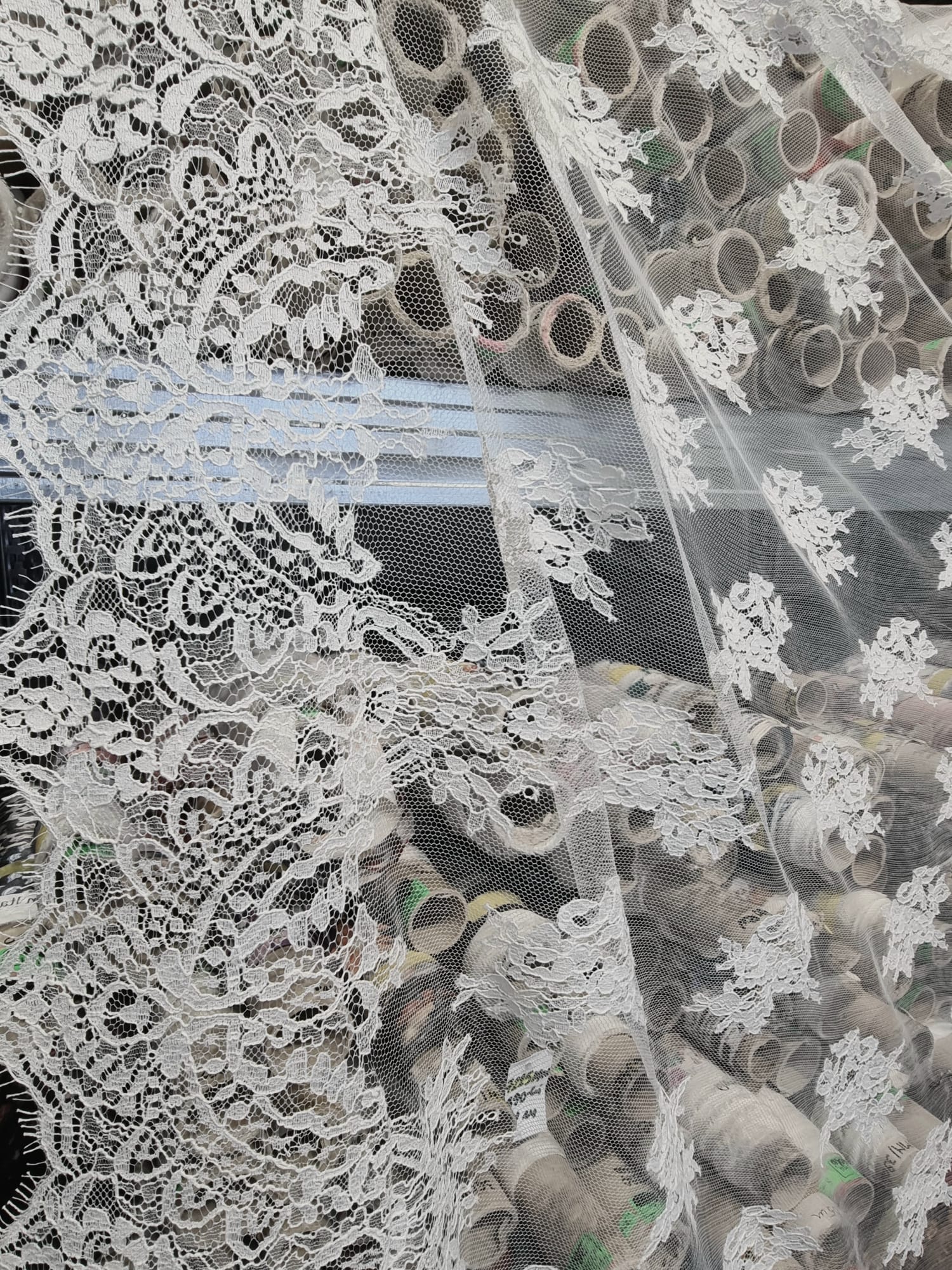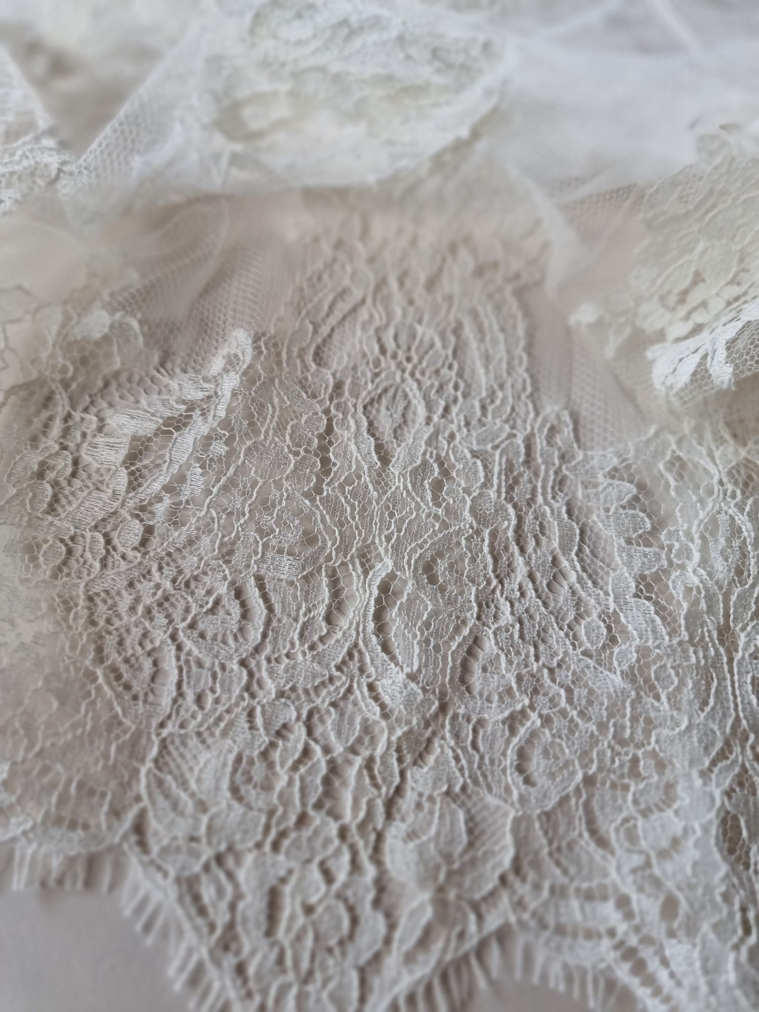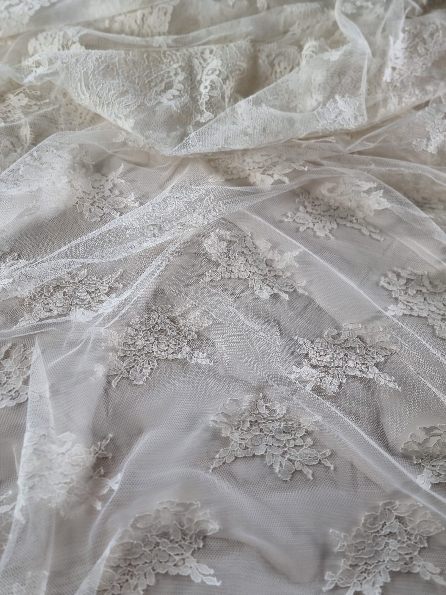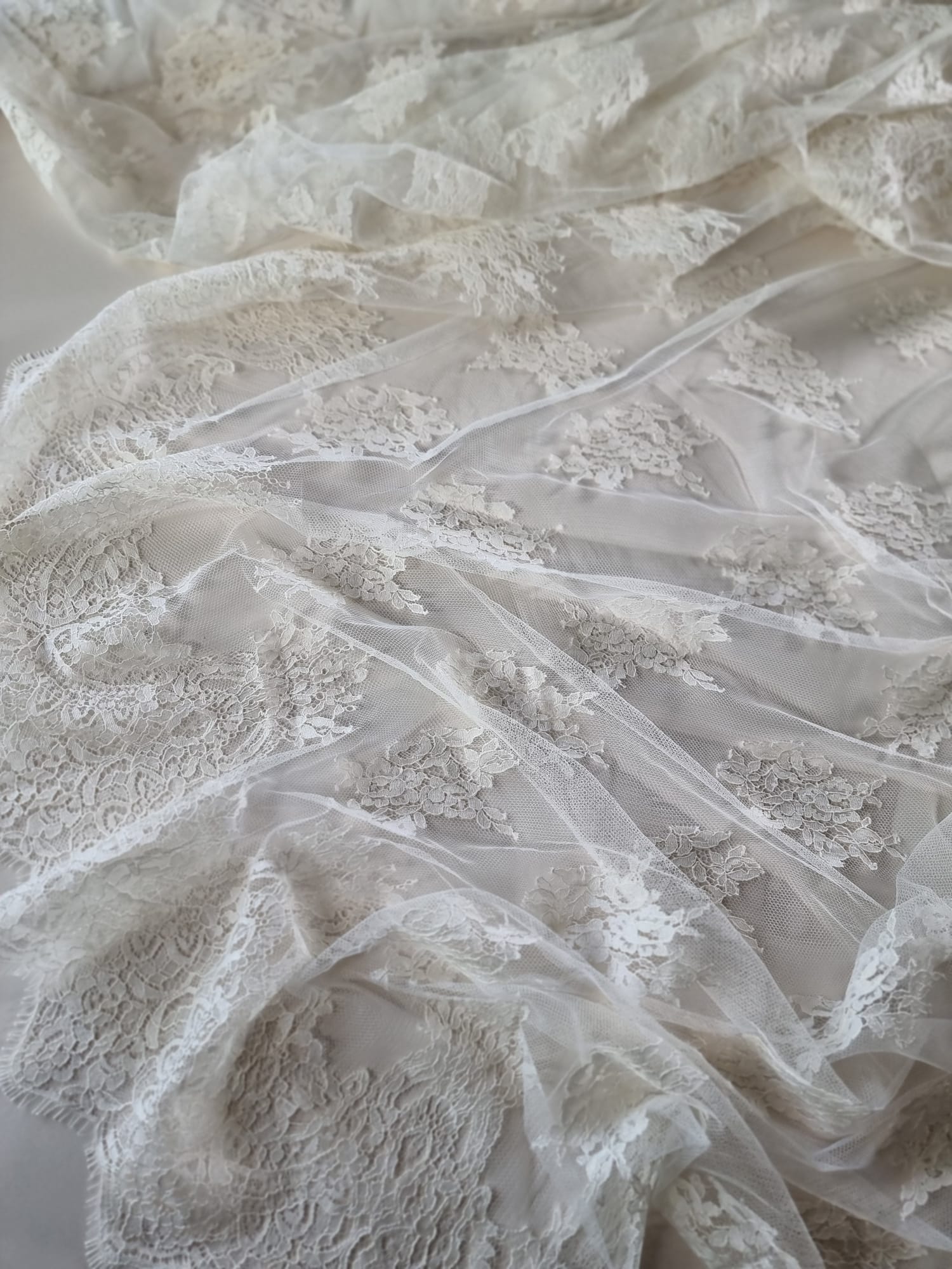 Tesatura premium – Dantela Chantilly design floral cu borduri laterale, Ivoire