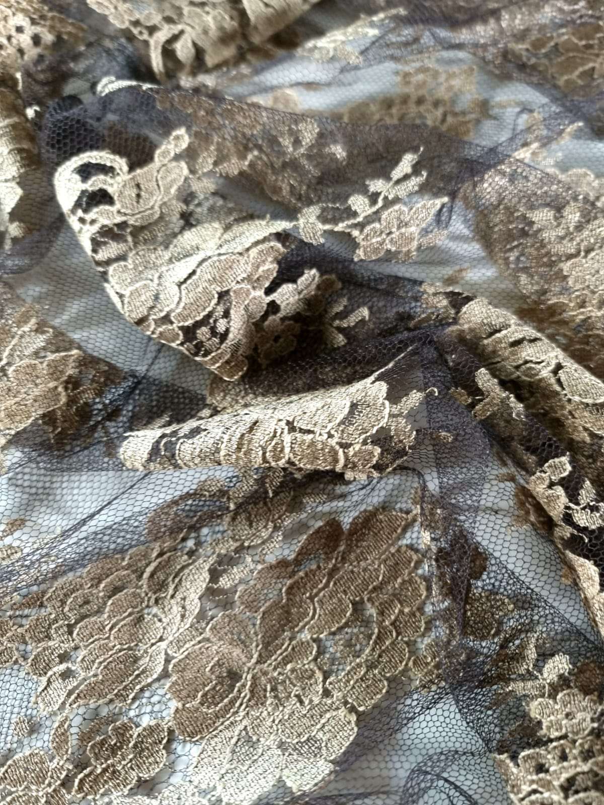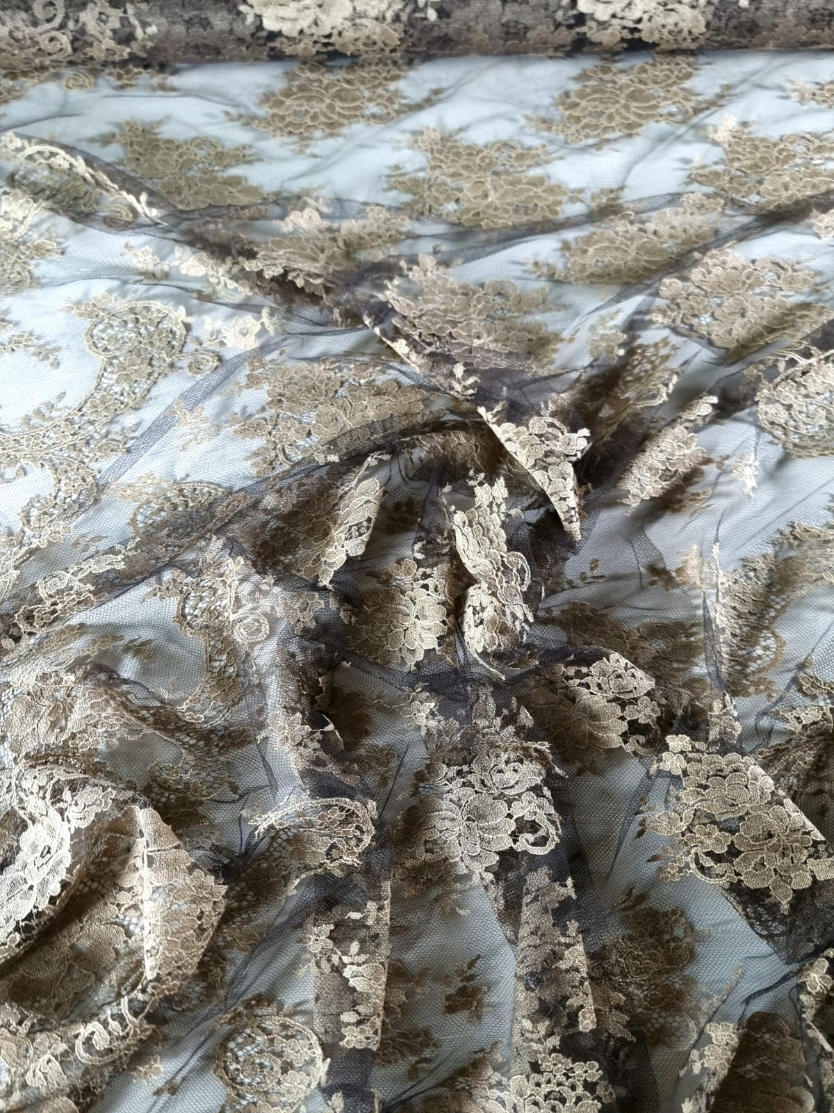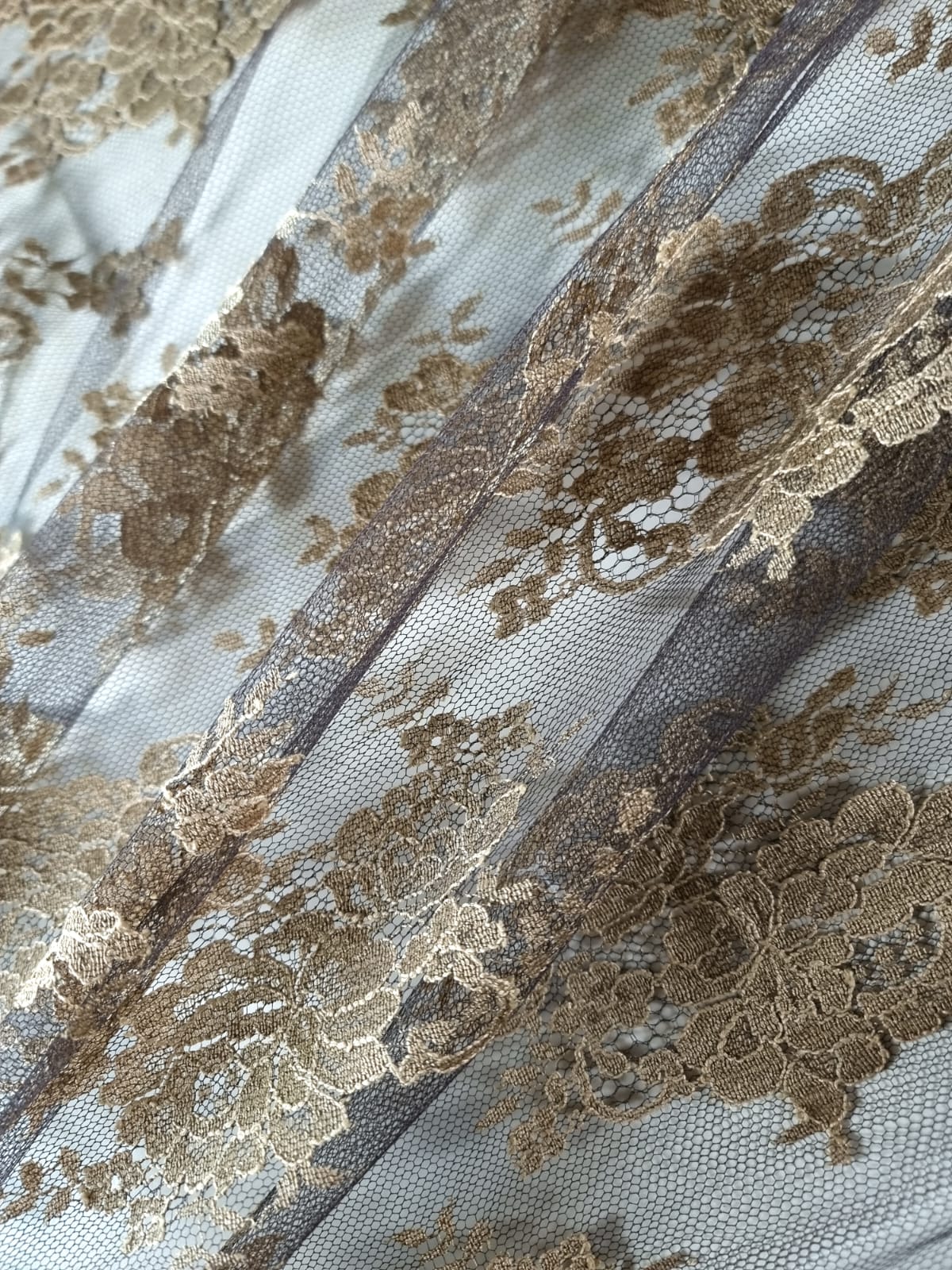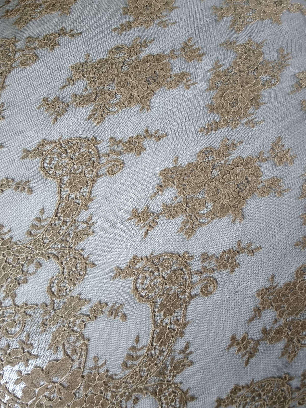Tesatura premium – Dantela Chantilly Maro cu bej si design floral, cu bordură bilaterală