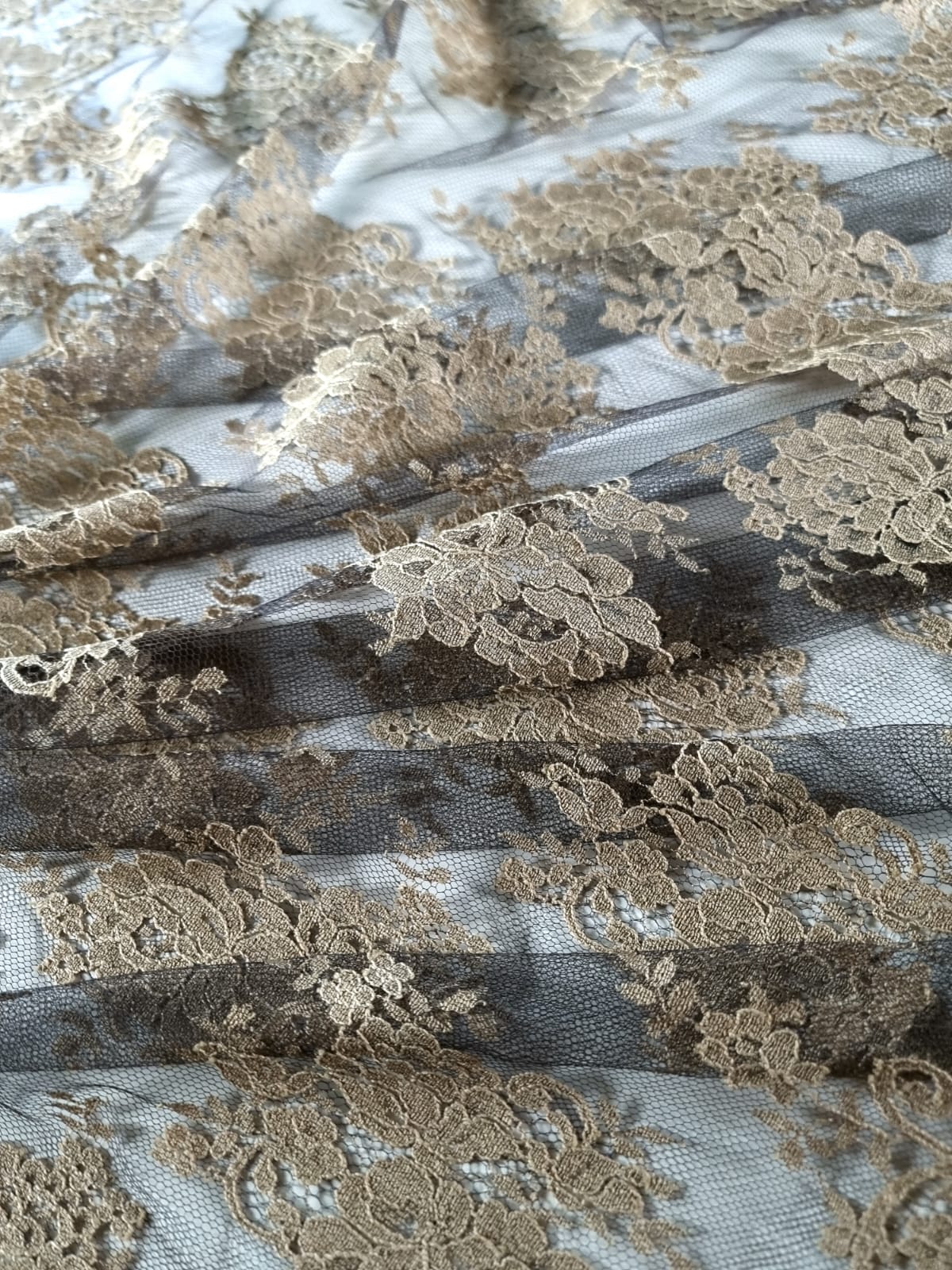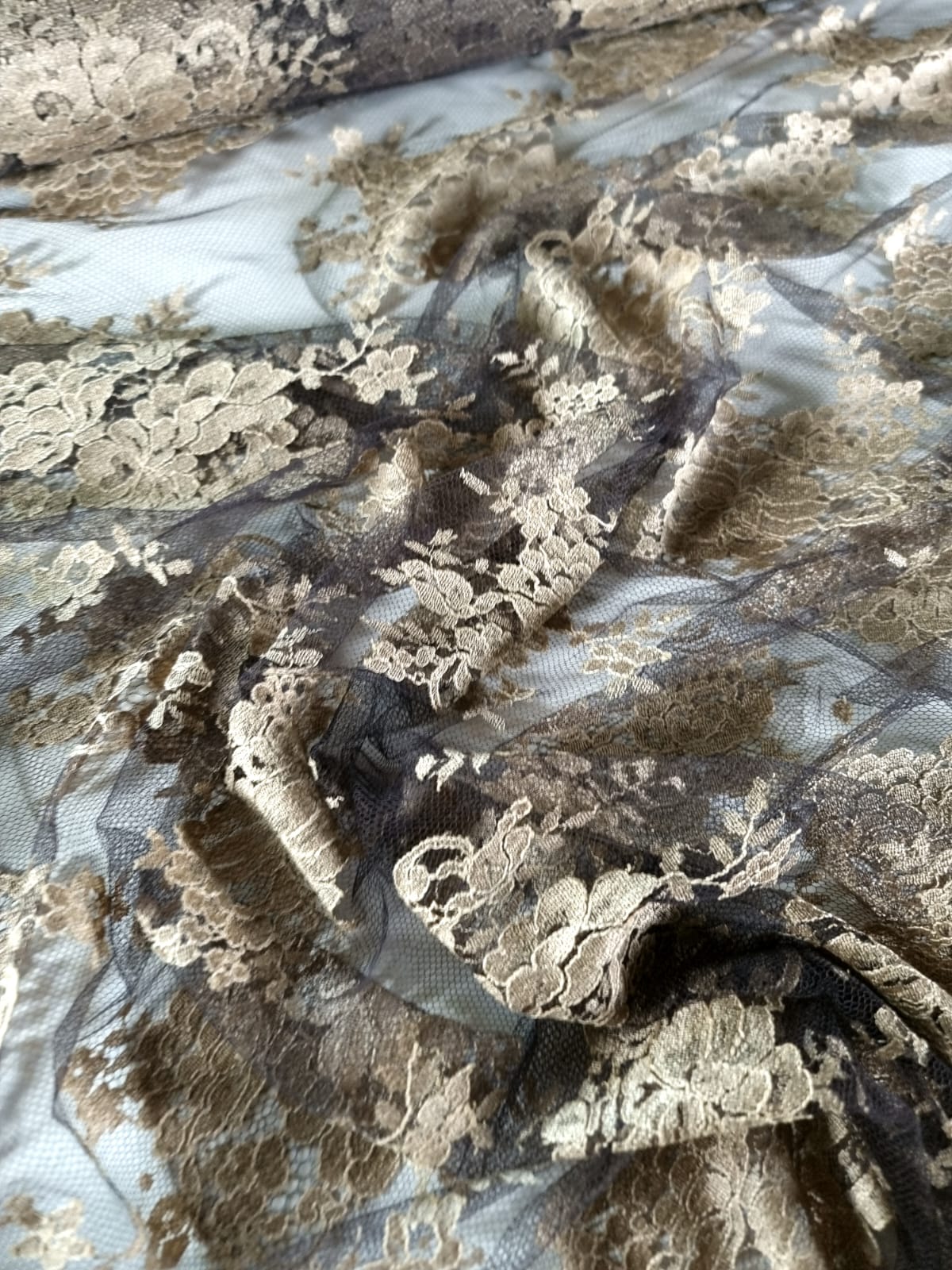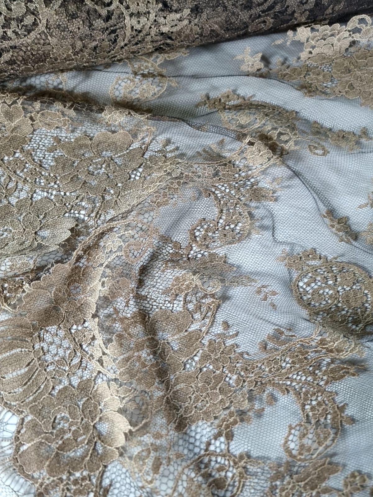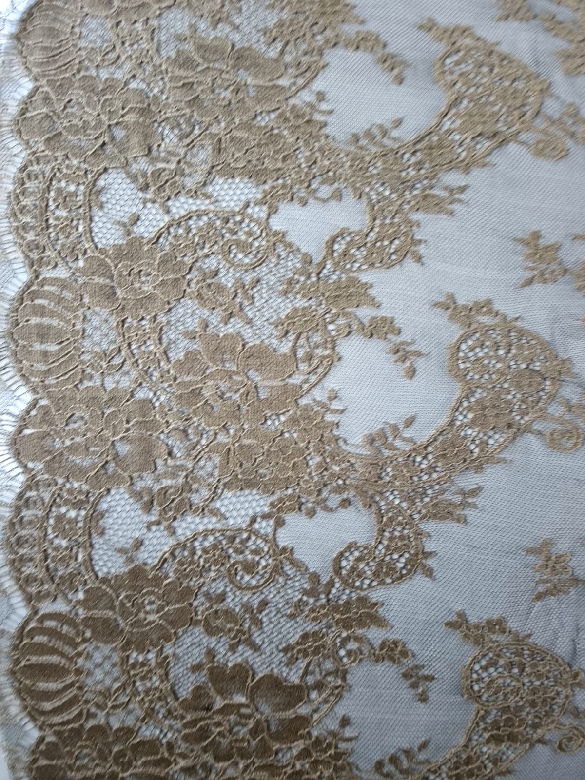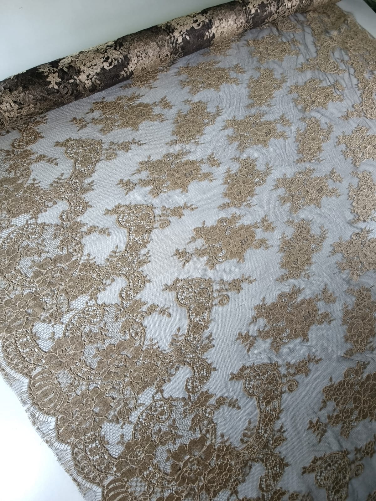 Tesatura premium – Dantela Chantilly Maro cu bej si design floral, cu bordură bilaterală