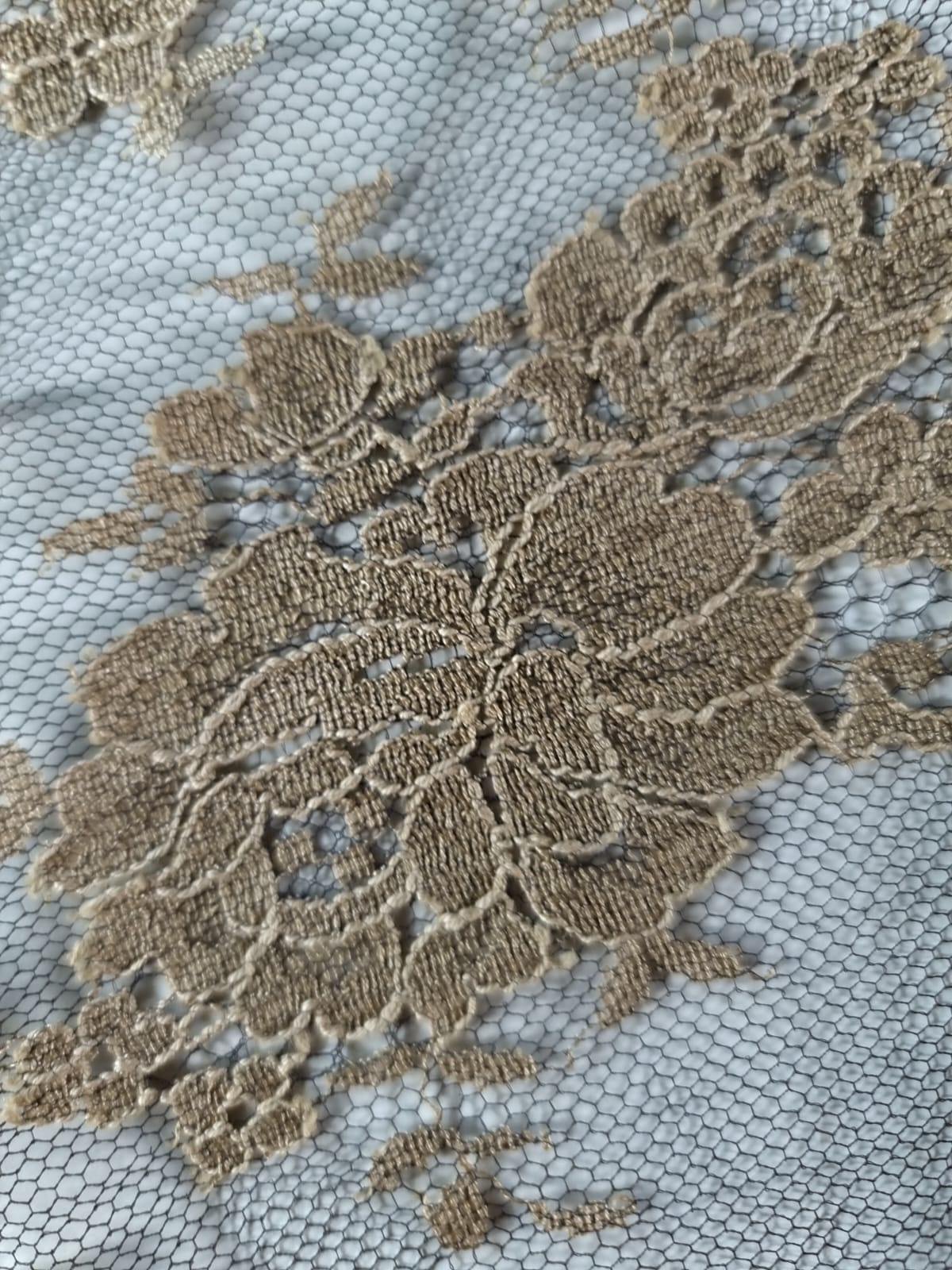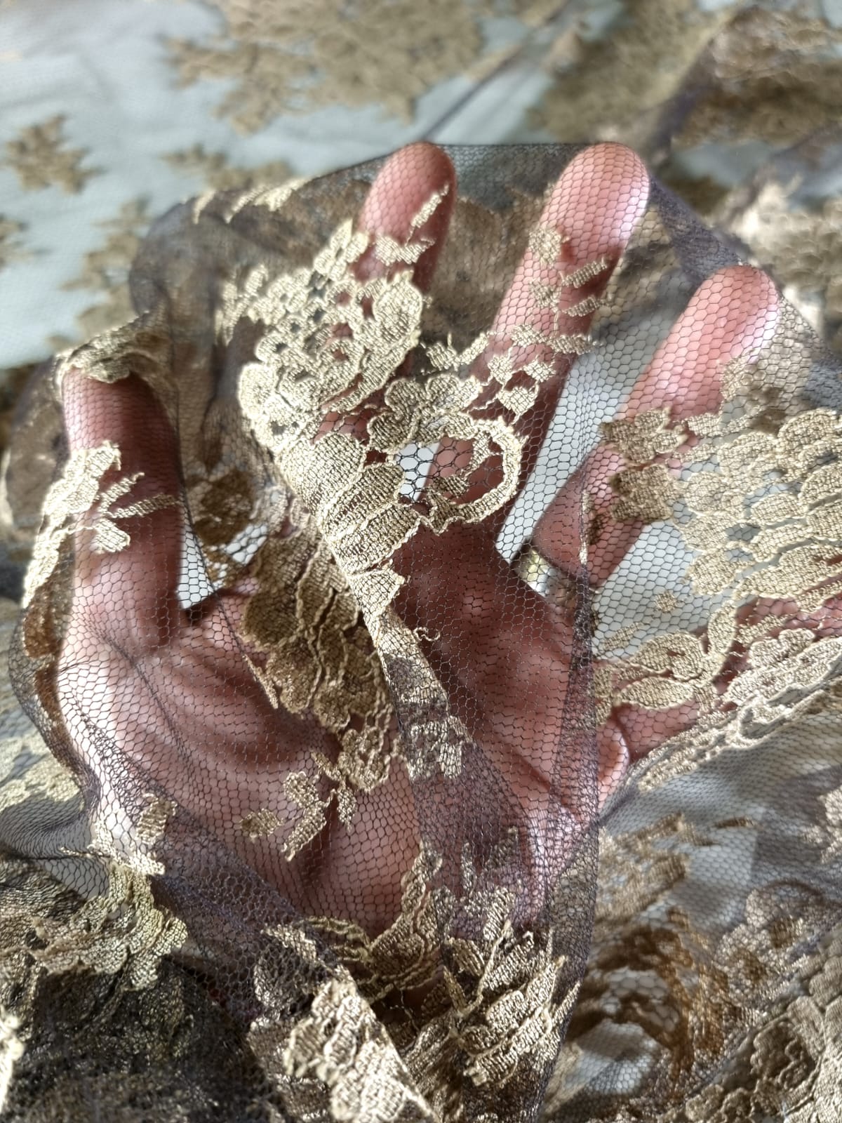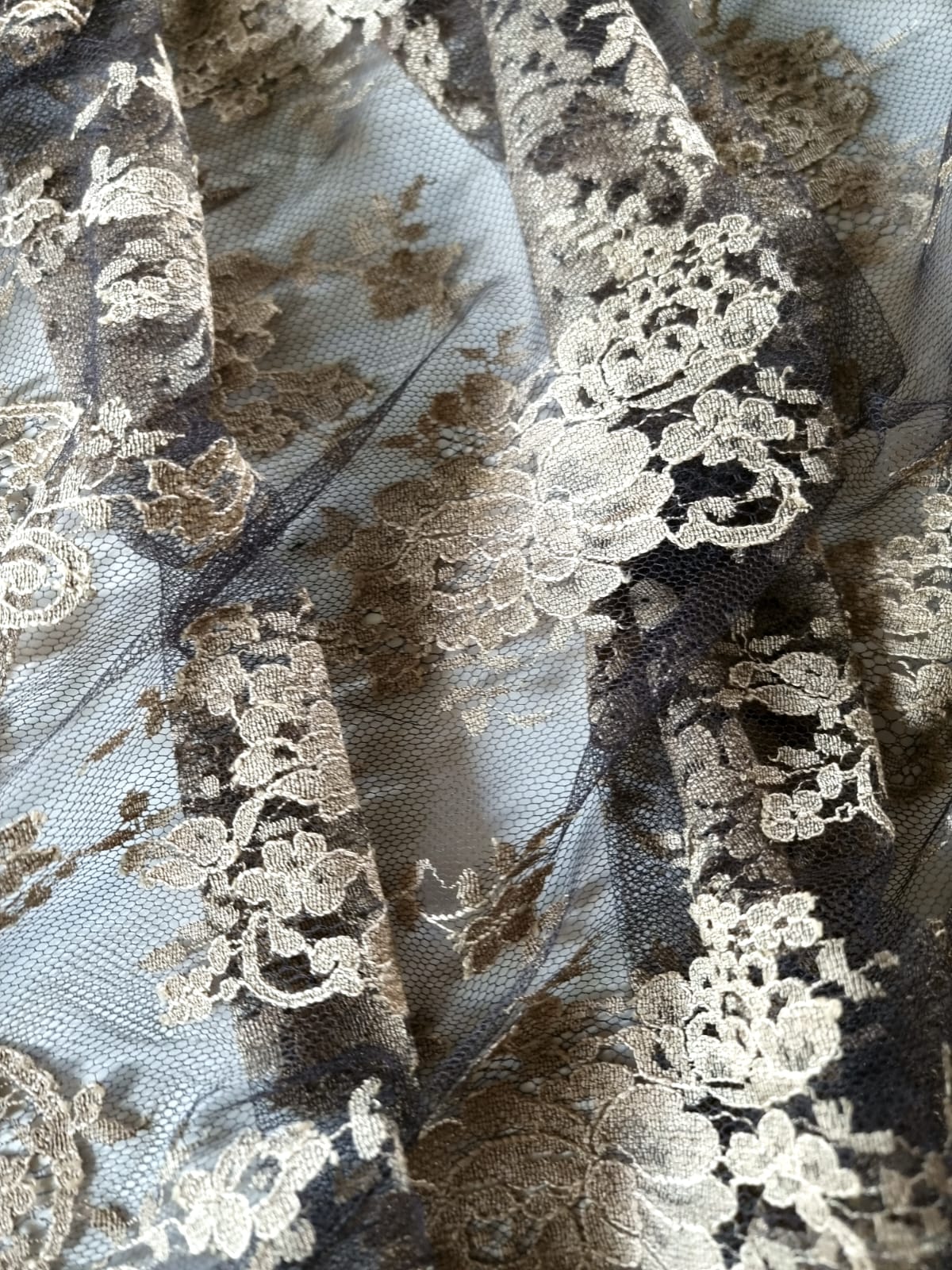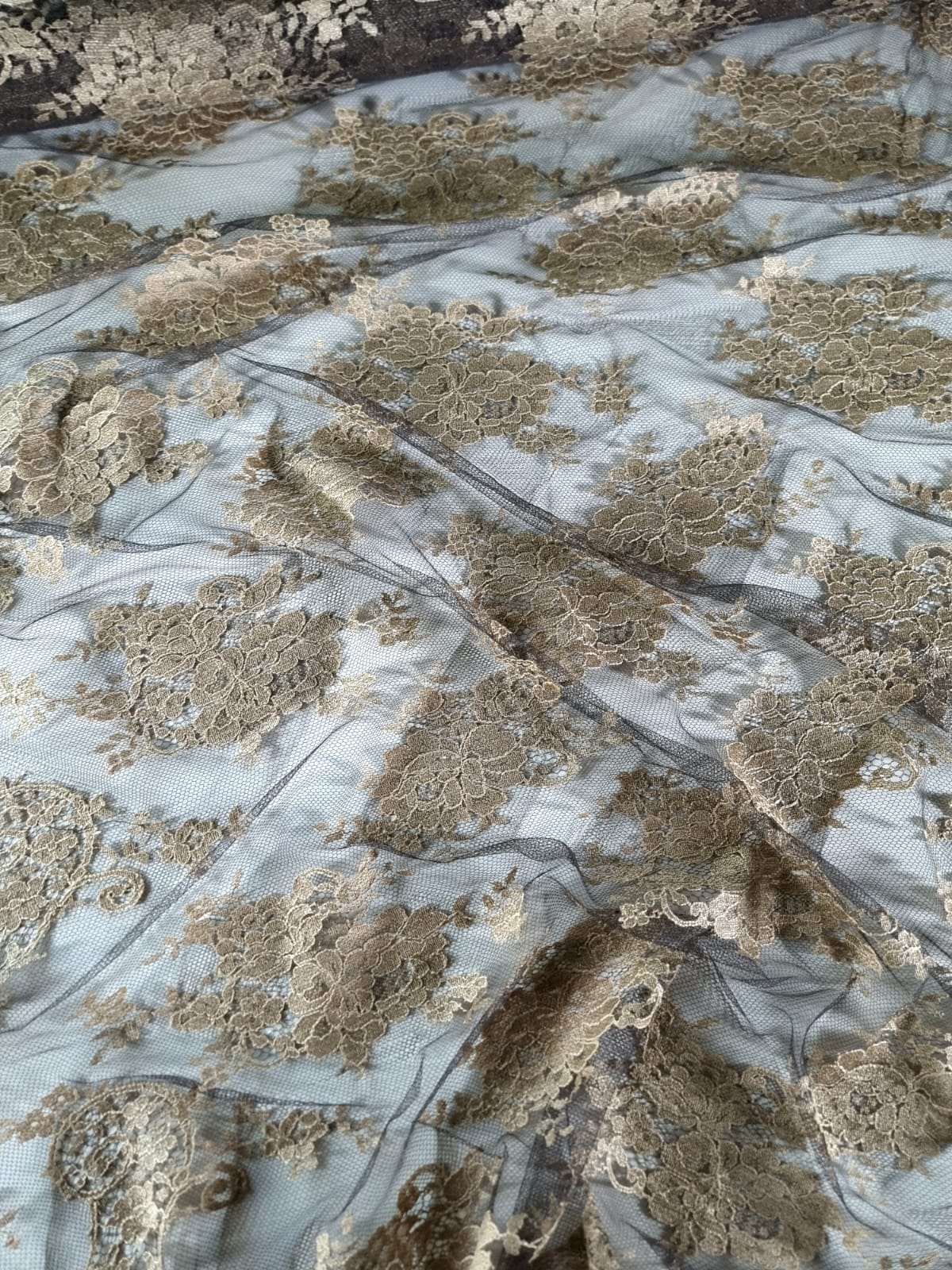 Tesatura premium – Dantela Chantilly Maro cu bej si design floral, cu bordură bilaterală