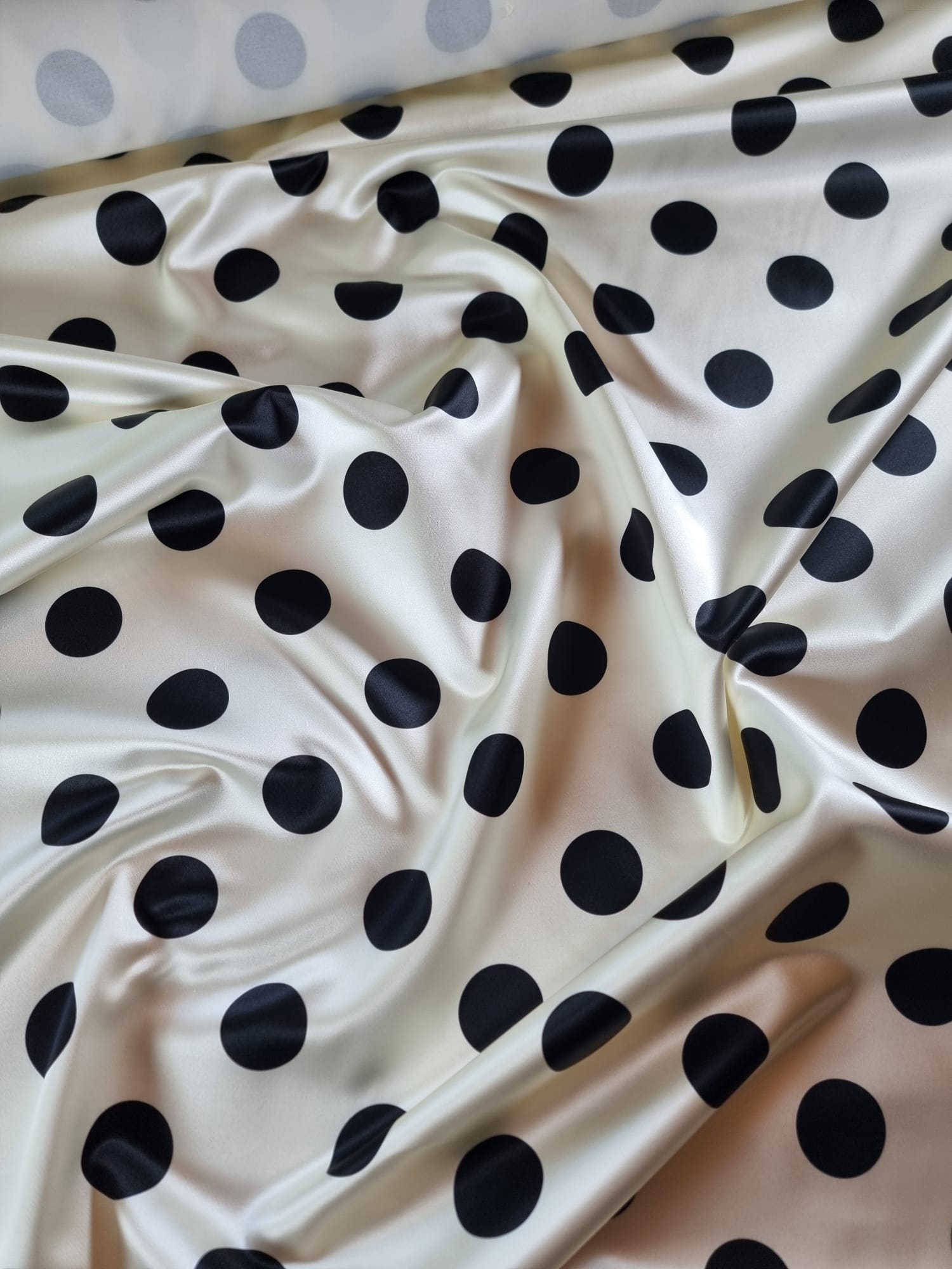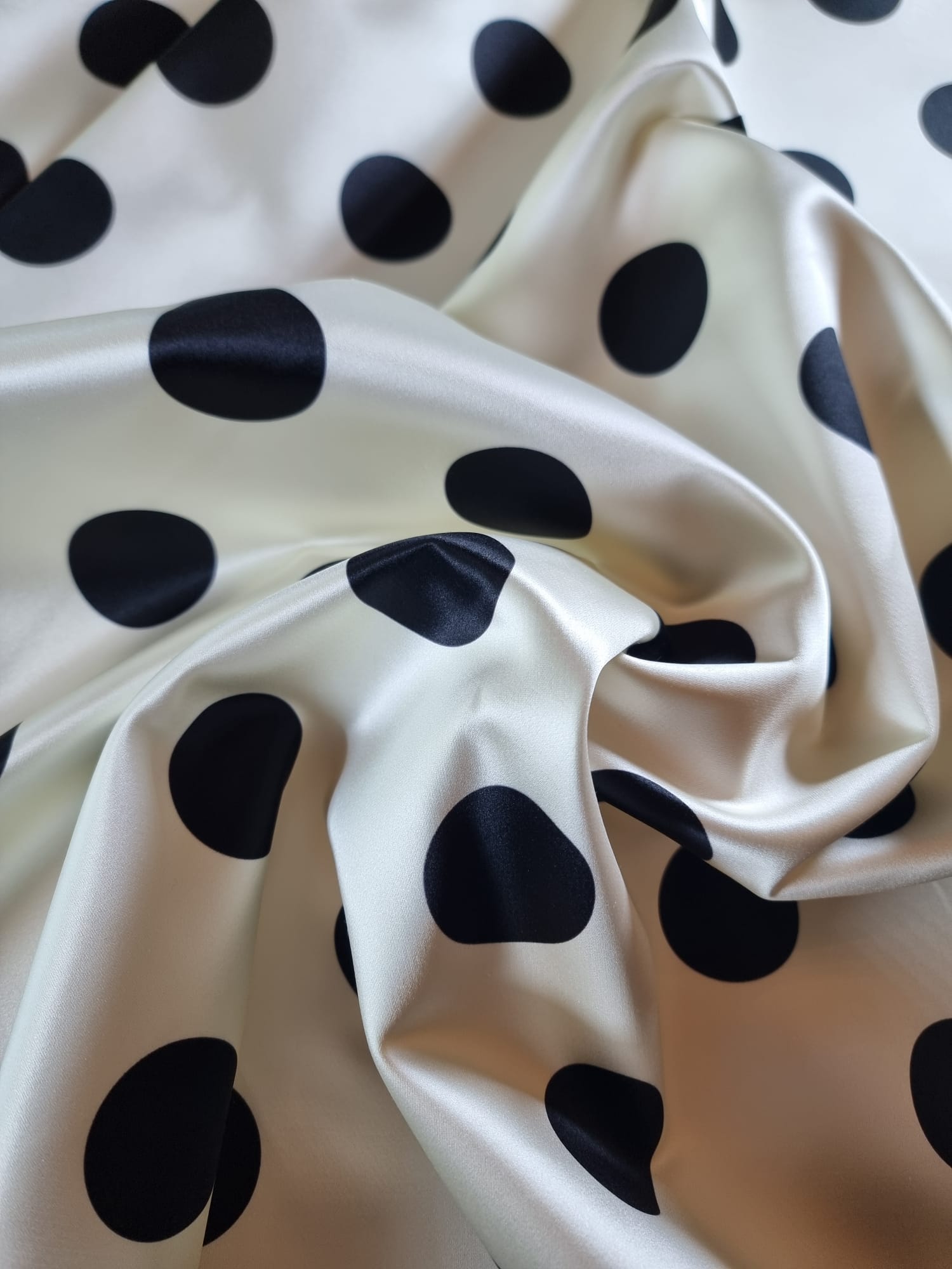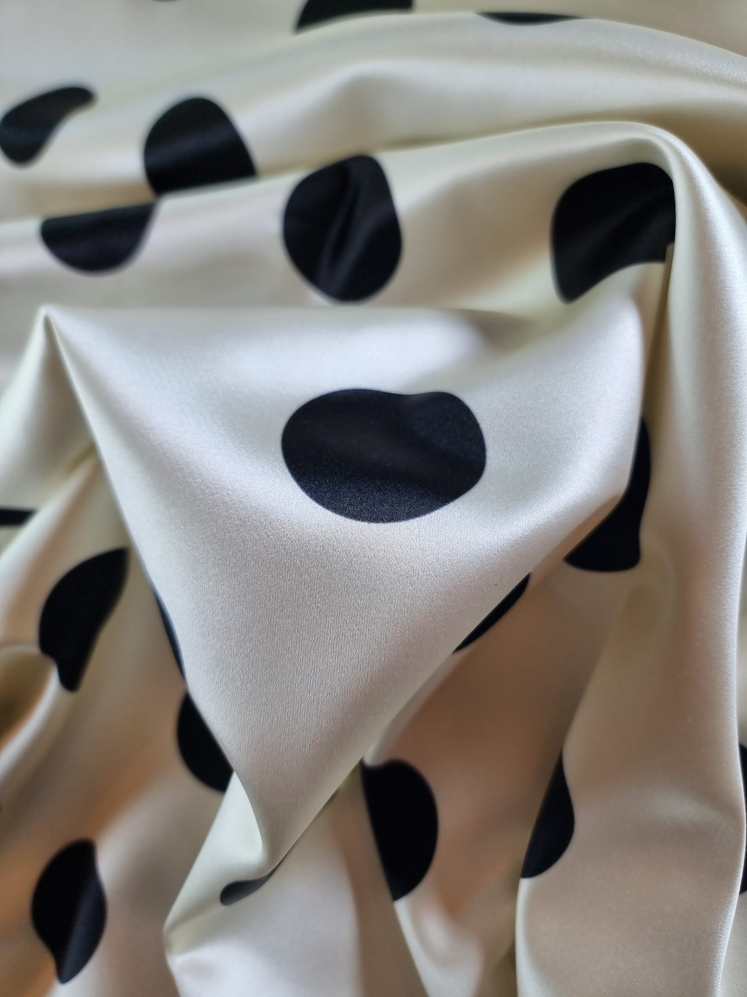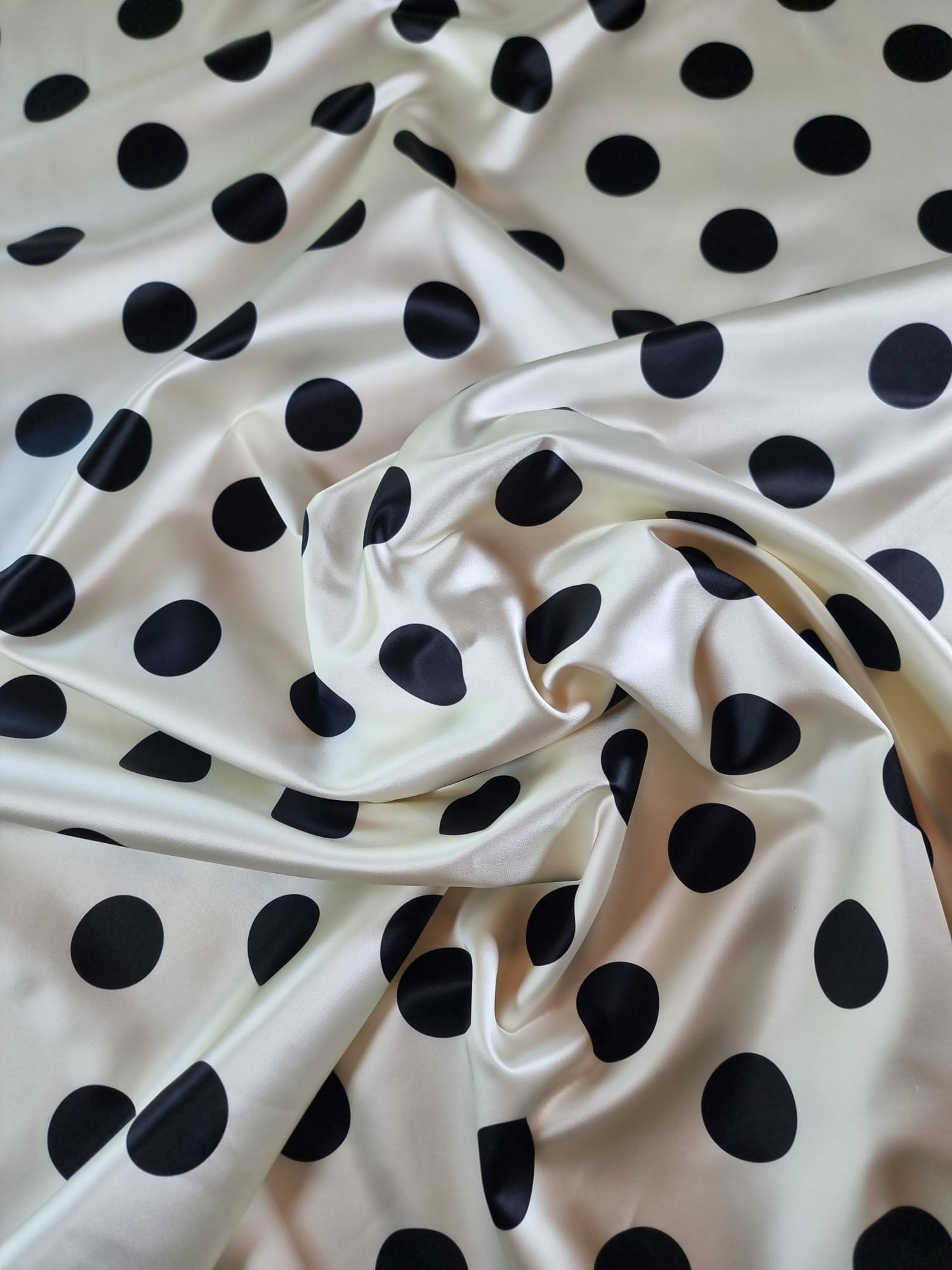 Tesatura tip tafta duchesse din fibre naturale, design buline Negre pe fond Ivoire