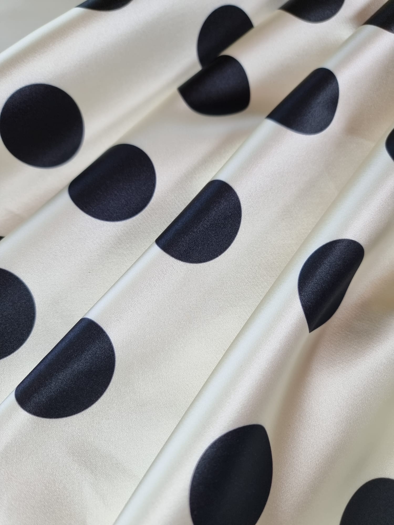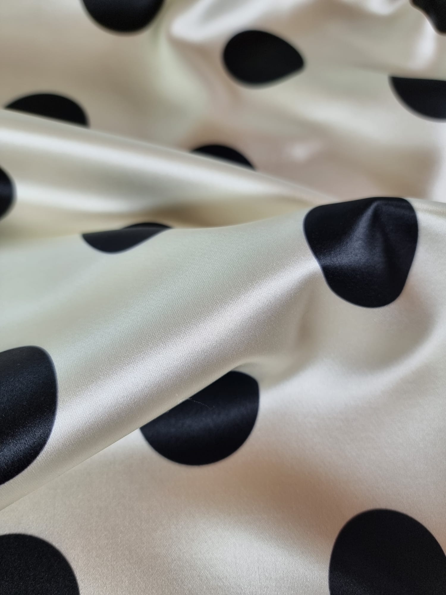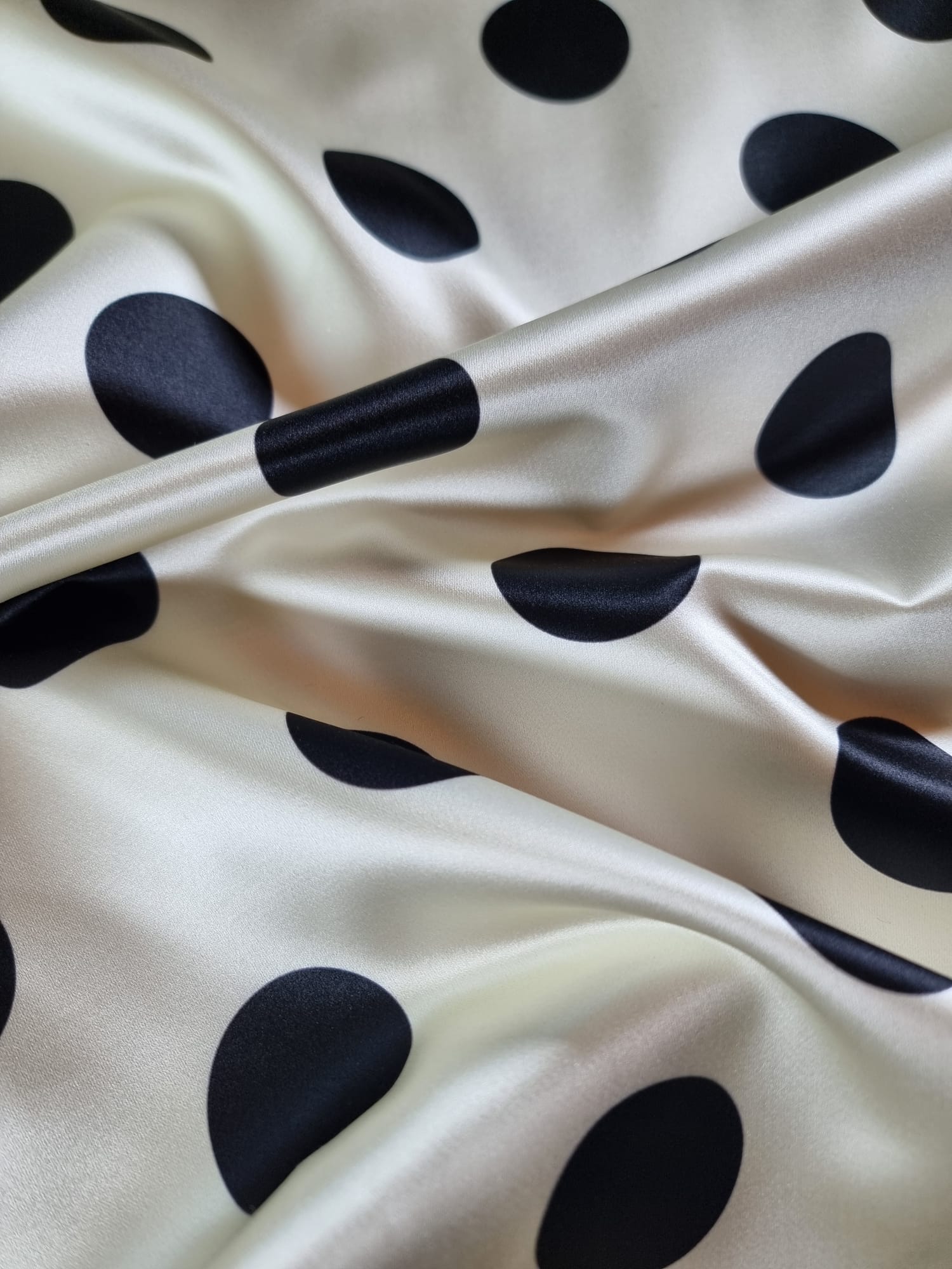 Tesatura tip tafta duchesse din fibre naturale, design buline Negre pe fond Ivoire