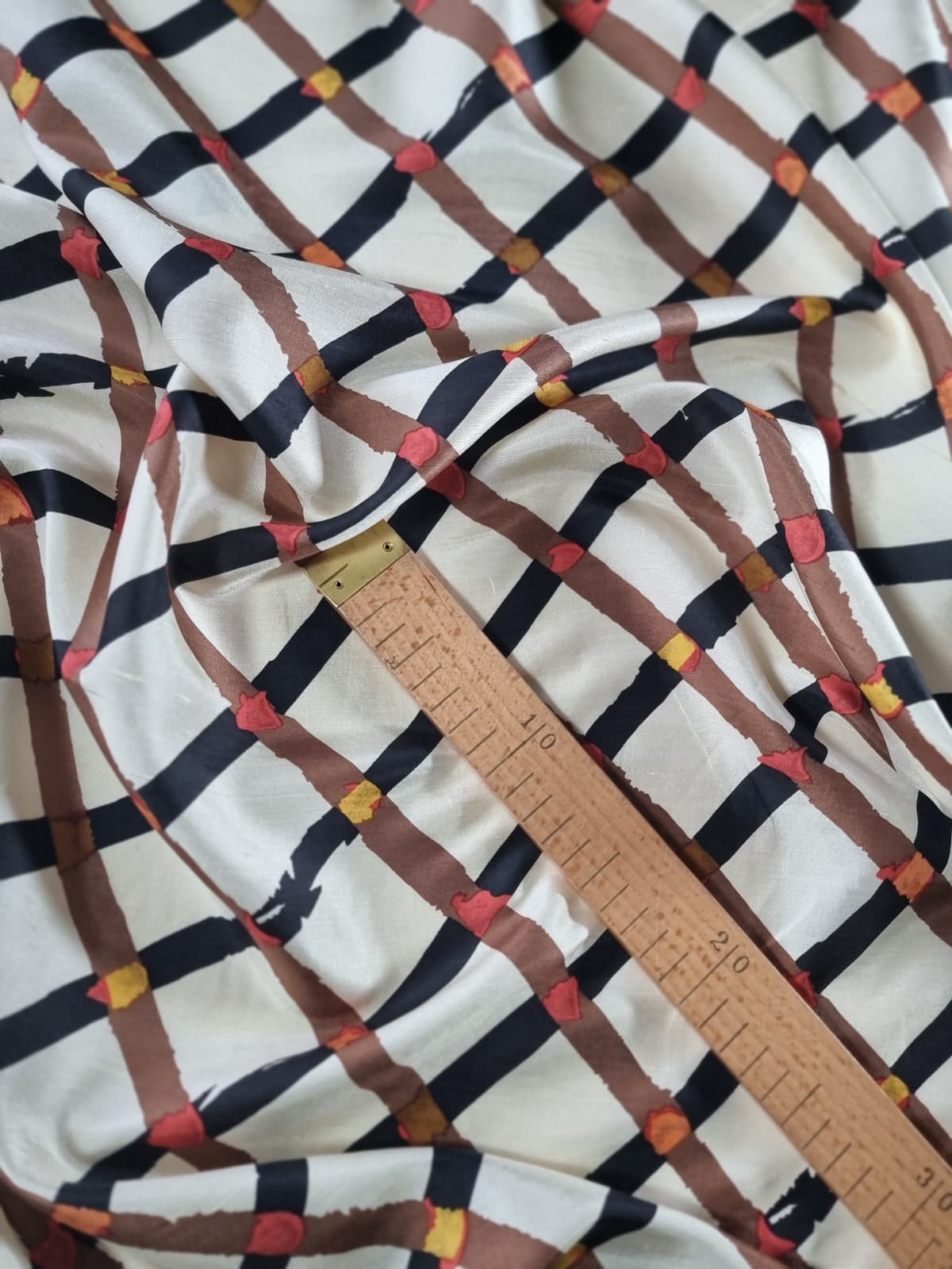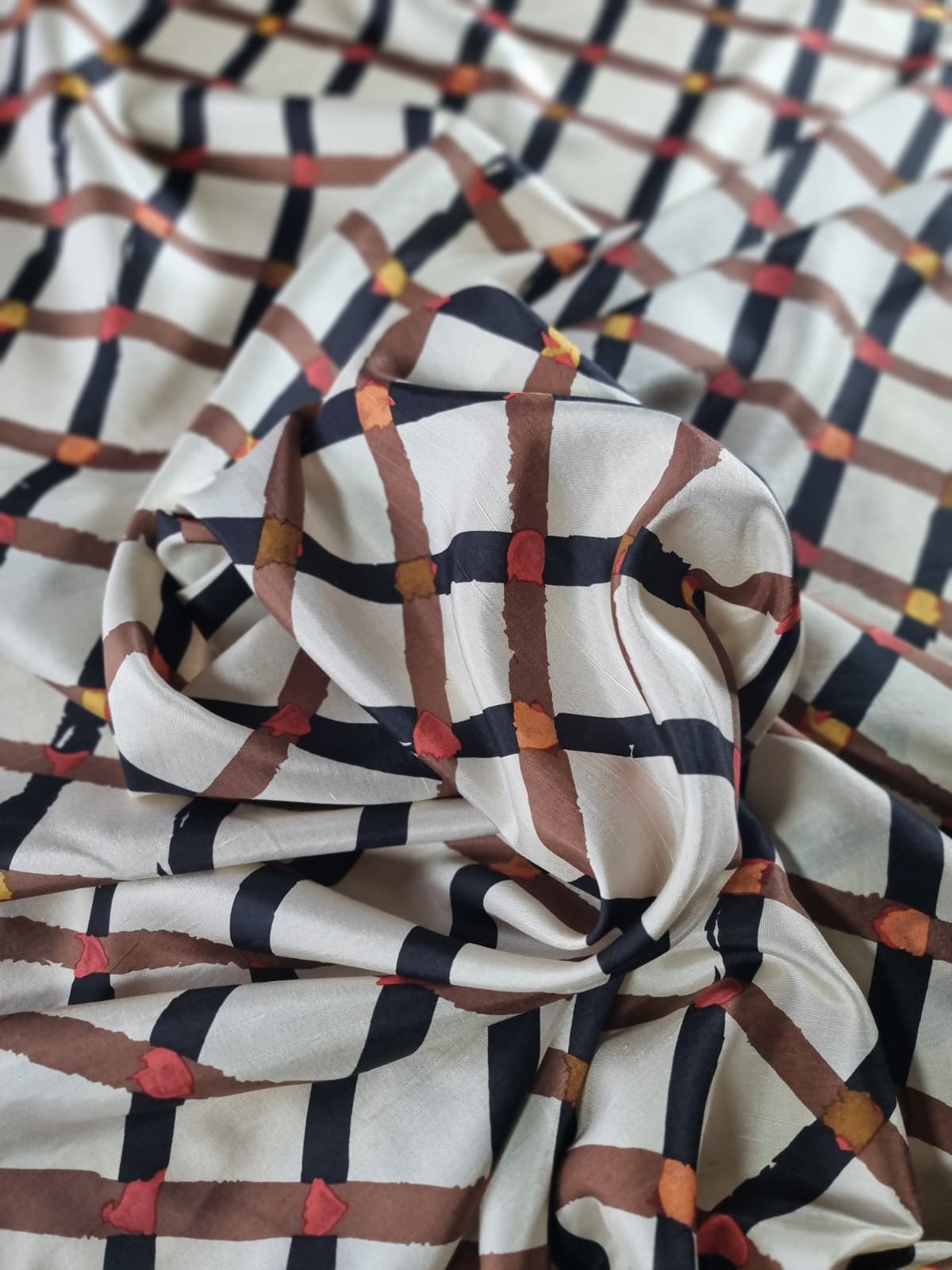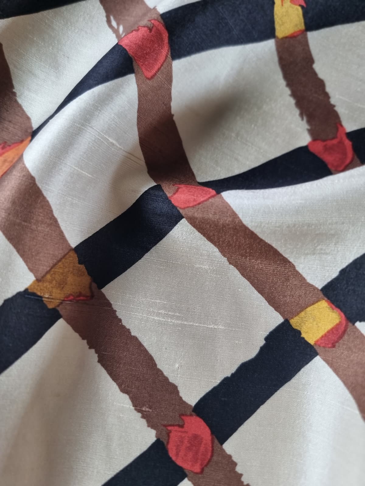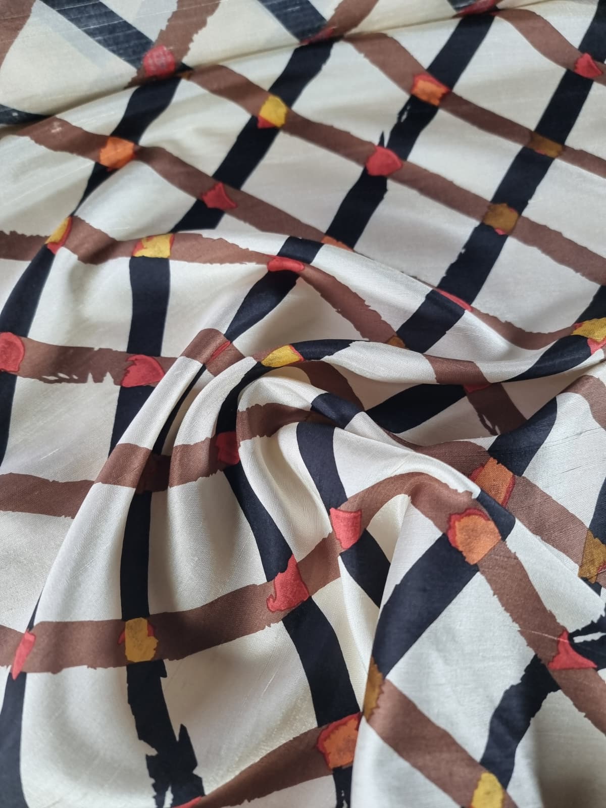 Tesatura shantung din matase naturala cu imprimeu caroiat, Negru / Maro / Ivoire