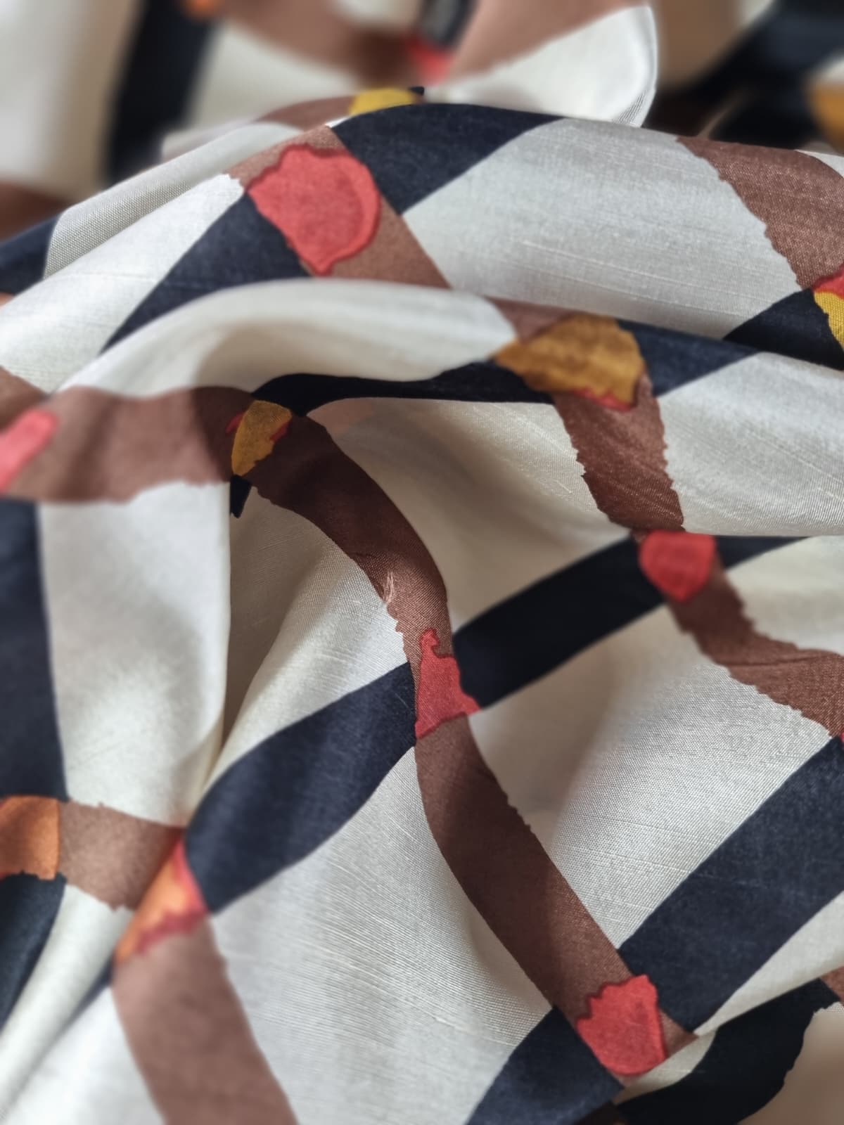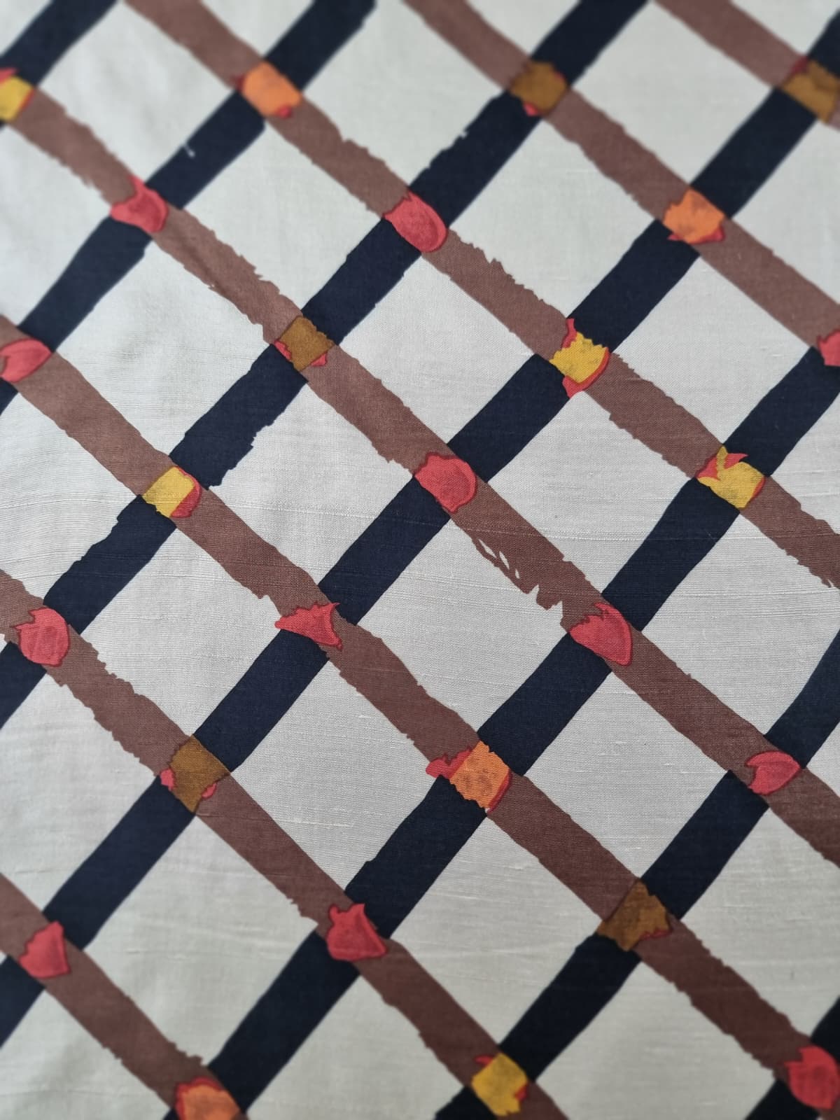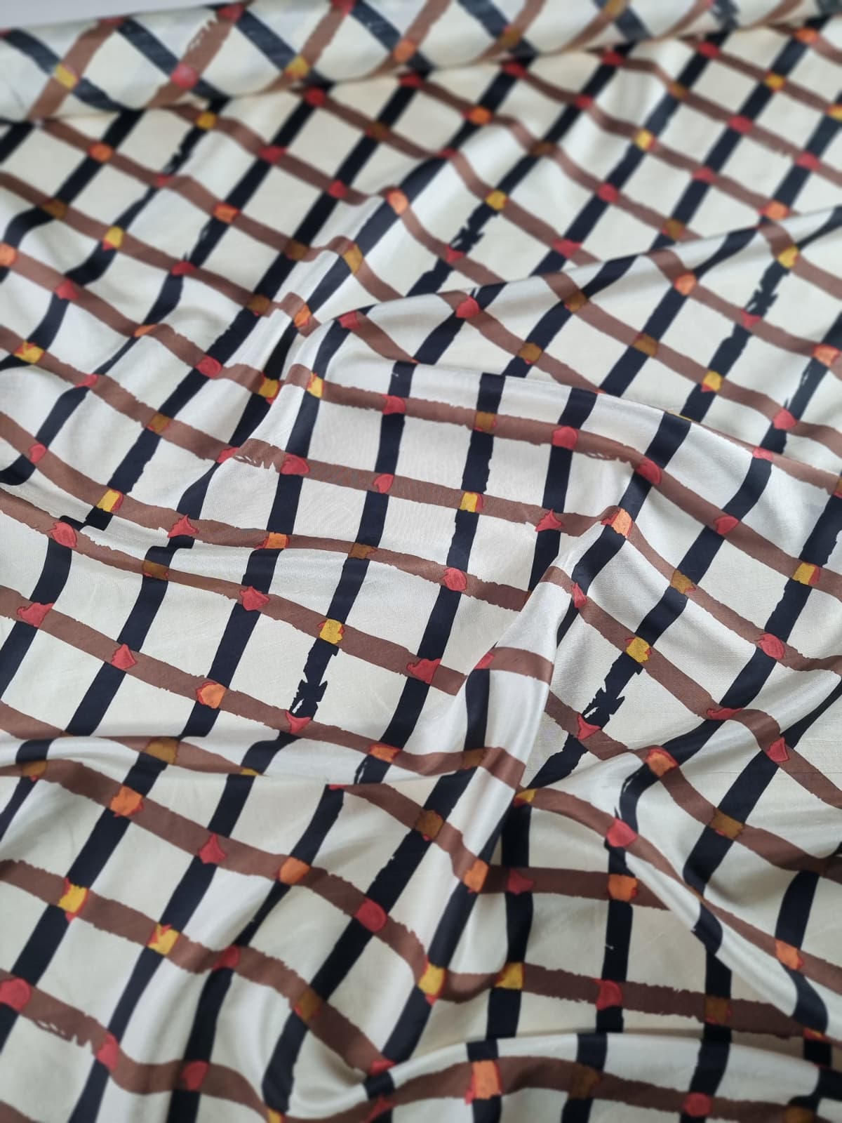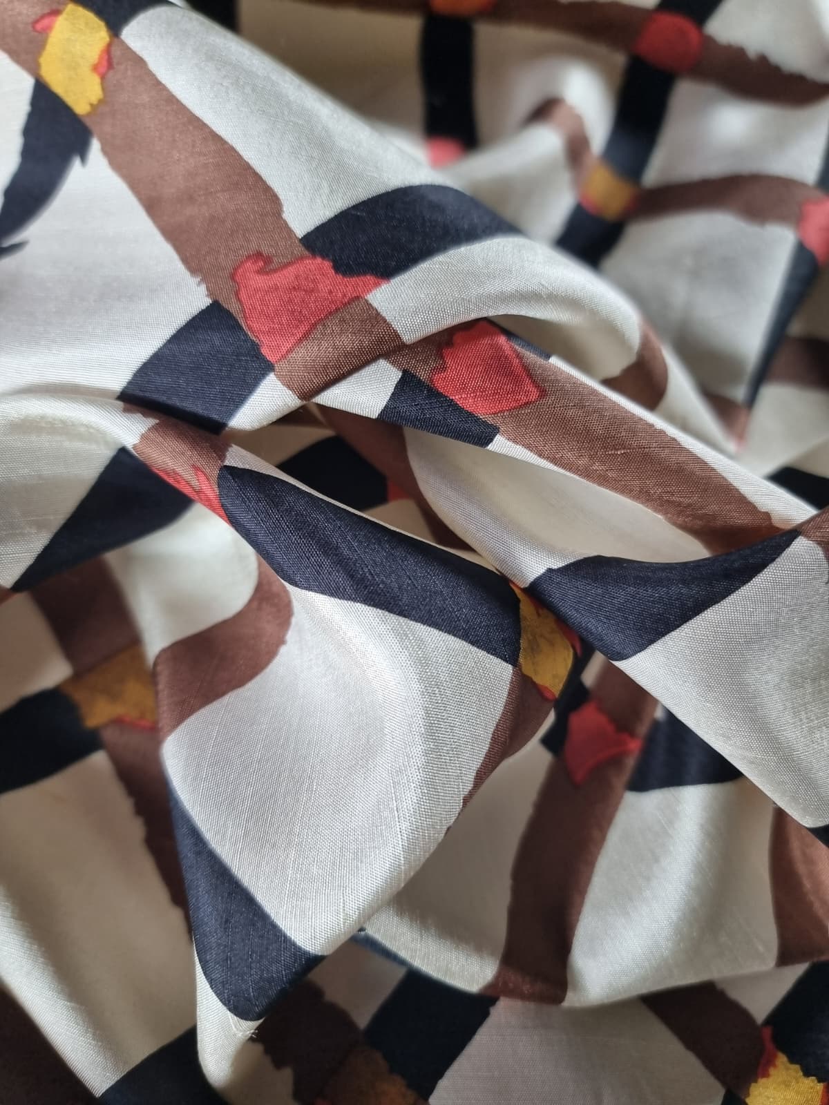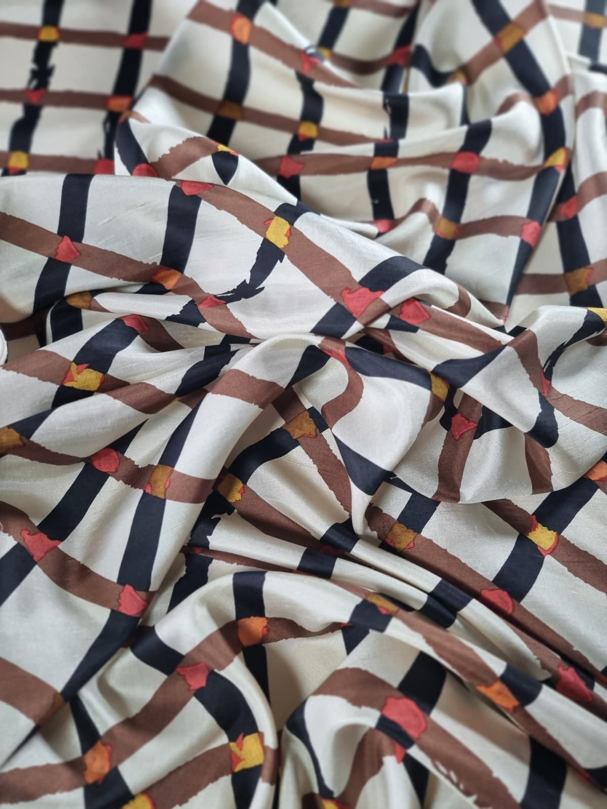 Tesatura shantung din matase naturala cu imprimeu caroiat, Negru / Maro / Ivoire