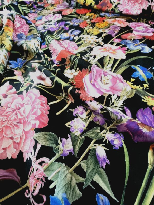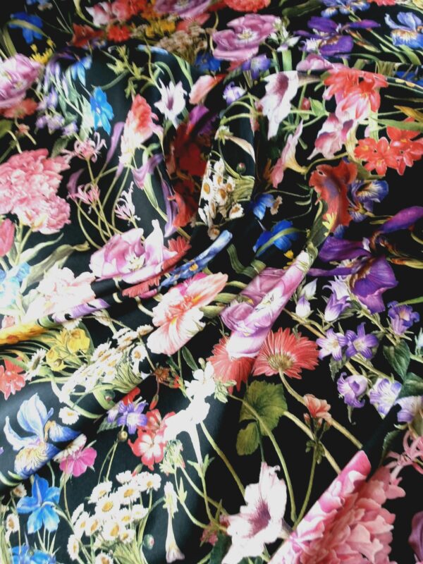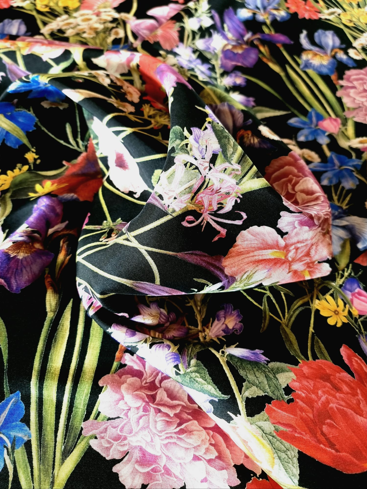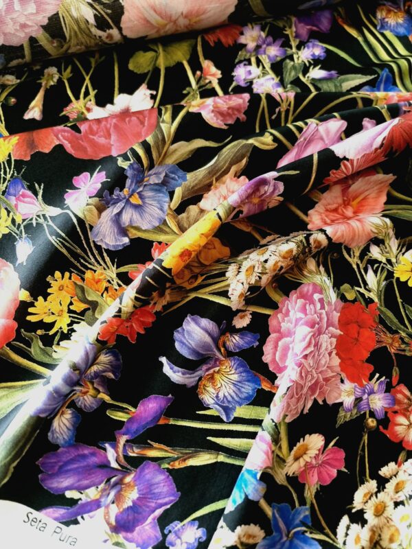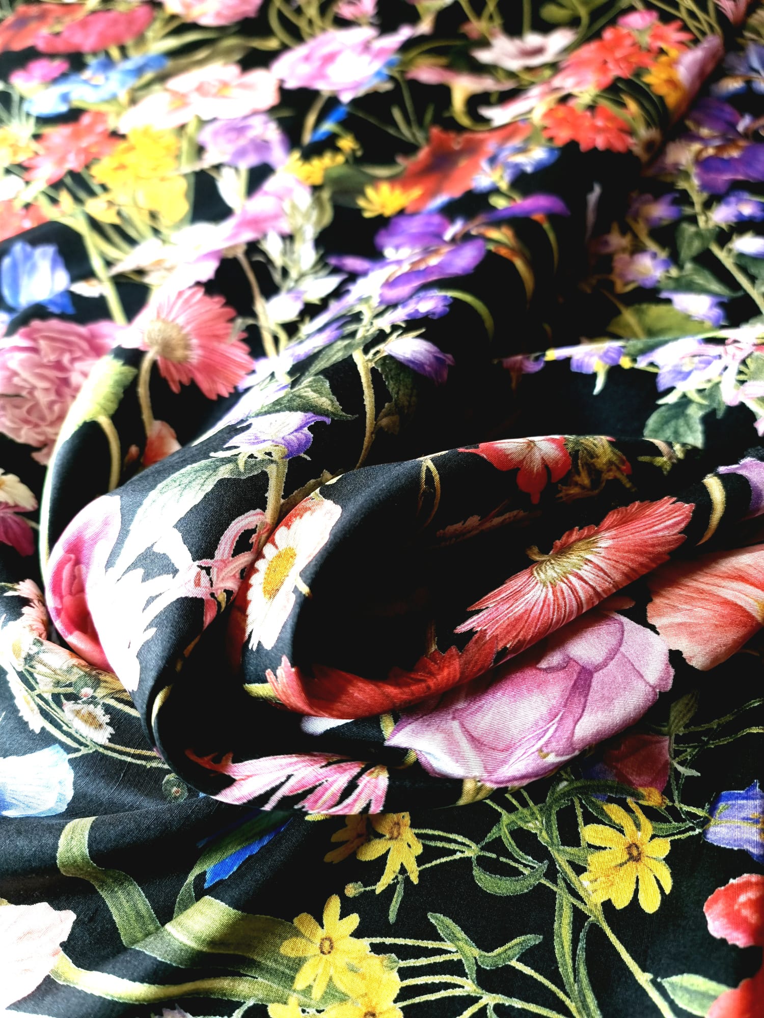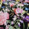 Tesatura shantung fin din matase naturala cu flori de gradina Multicolore pe fond Negru