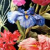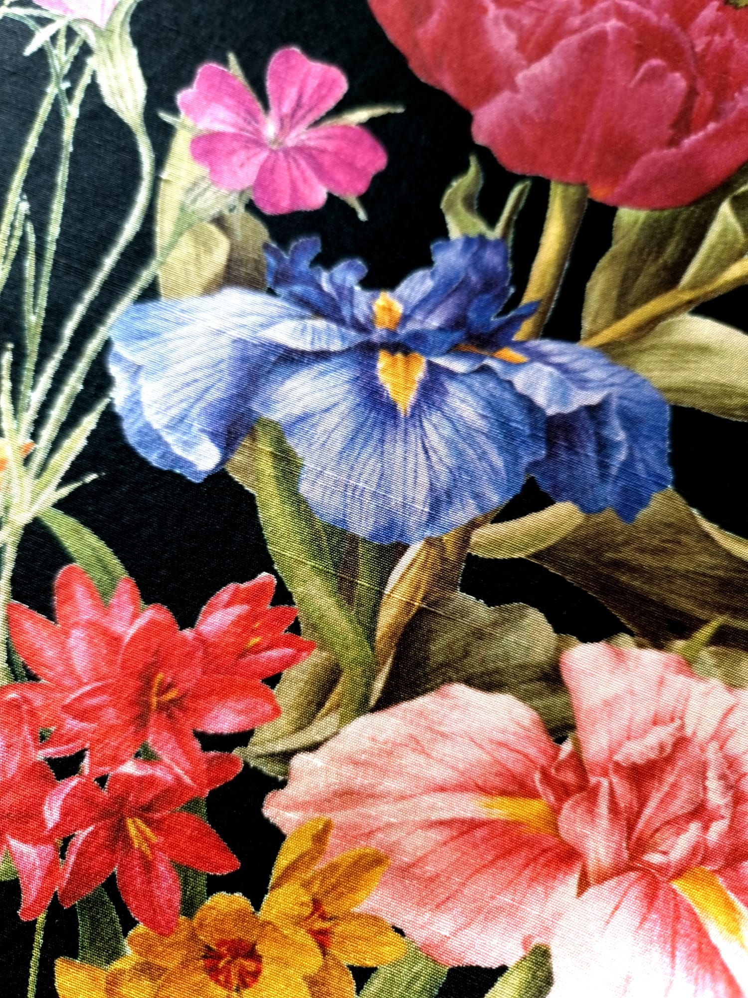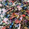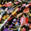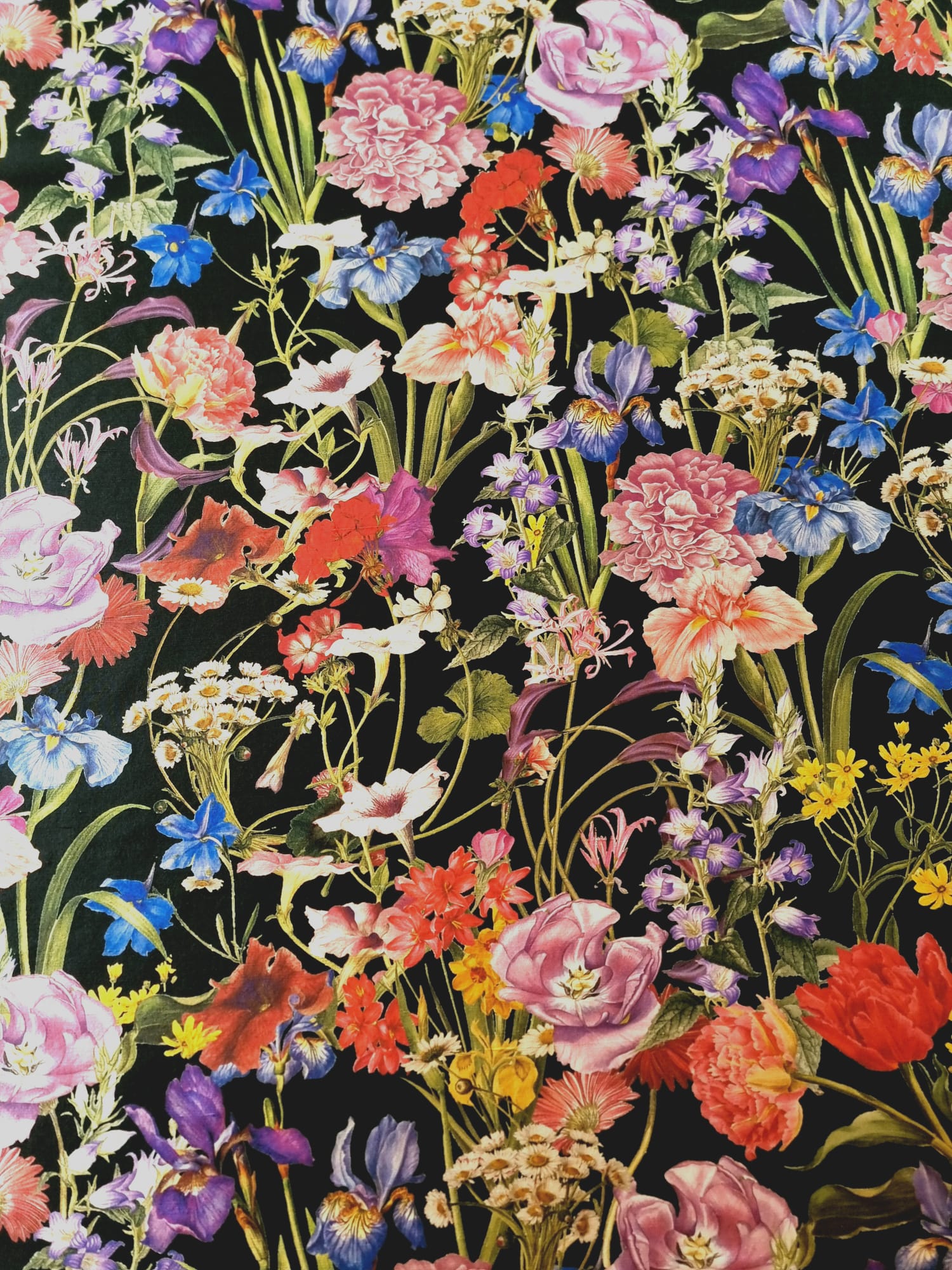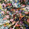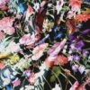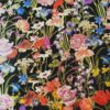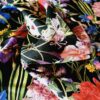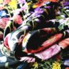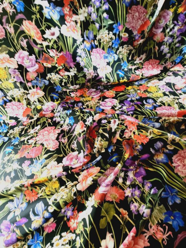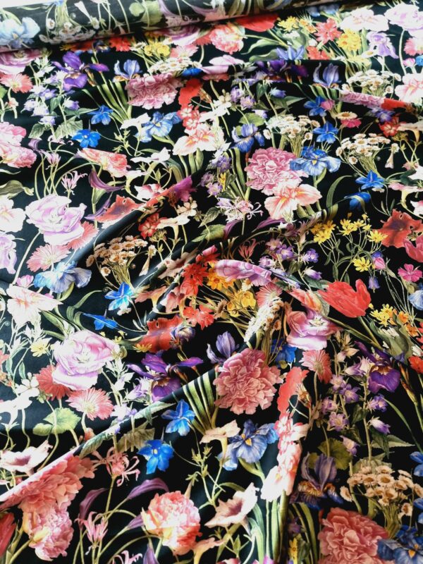 Tesatura shantung fin din matase naturala cu flori de gradina Multicolore pe fond Negru