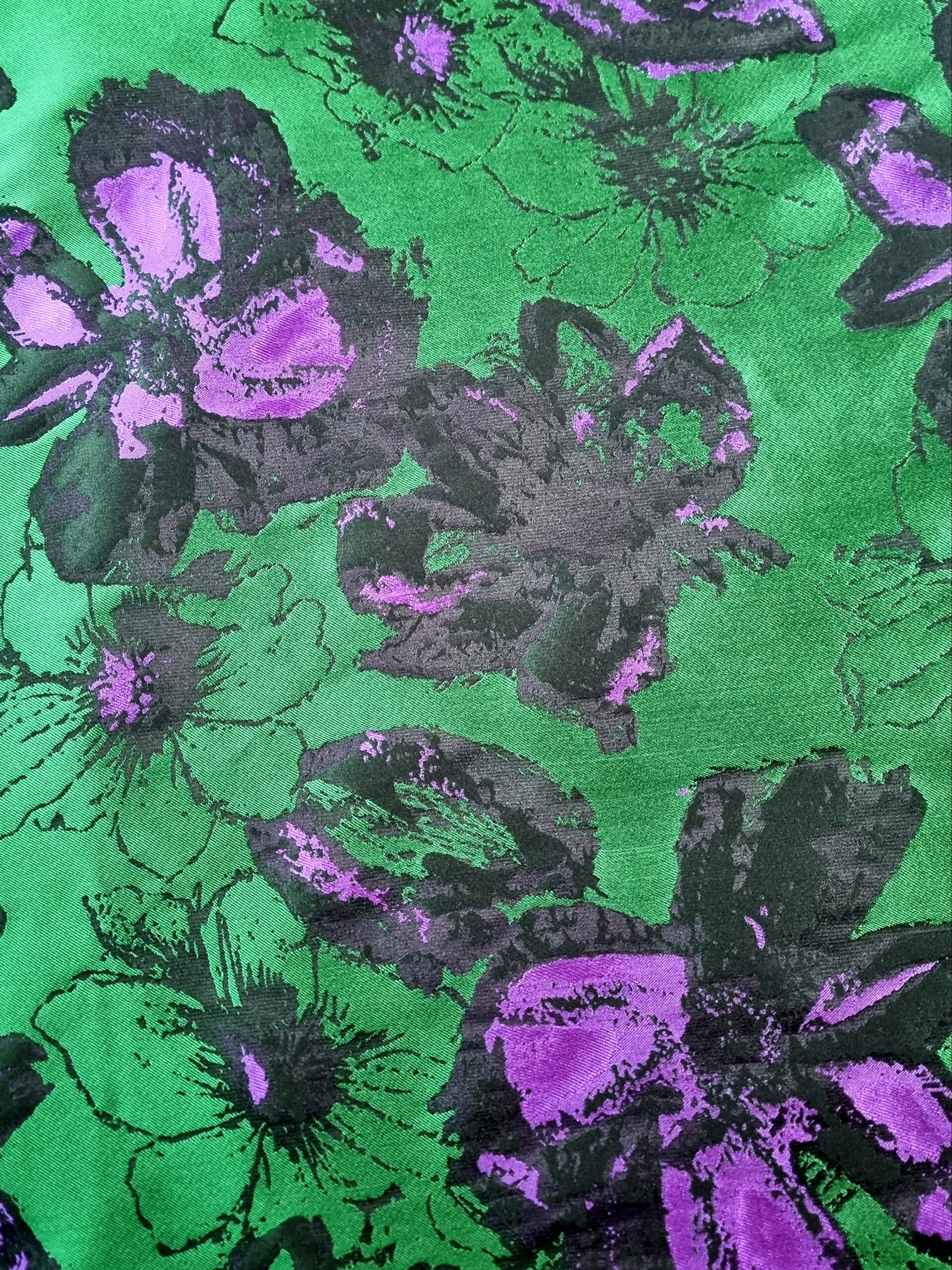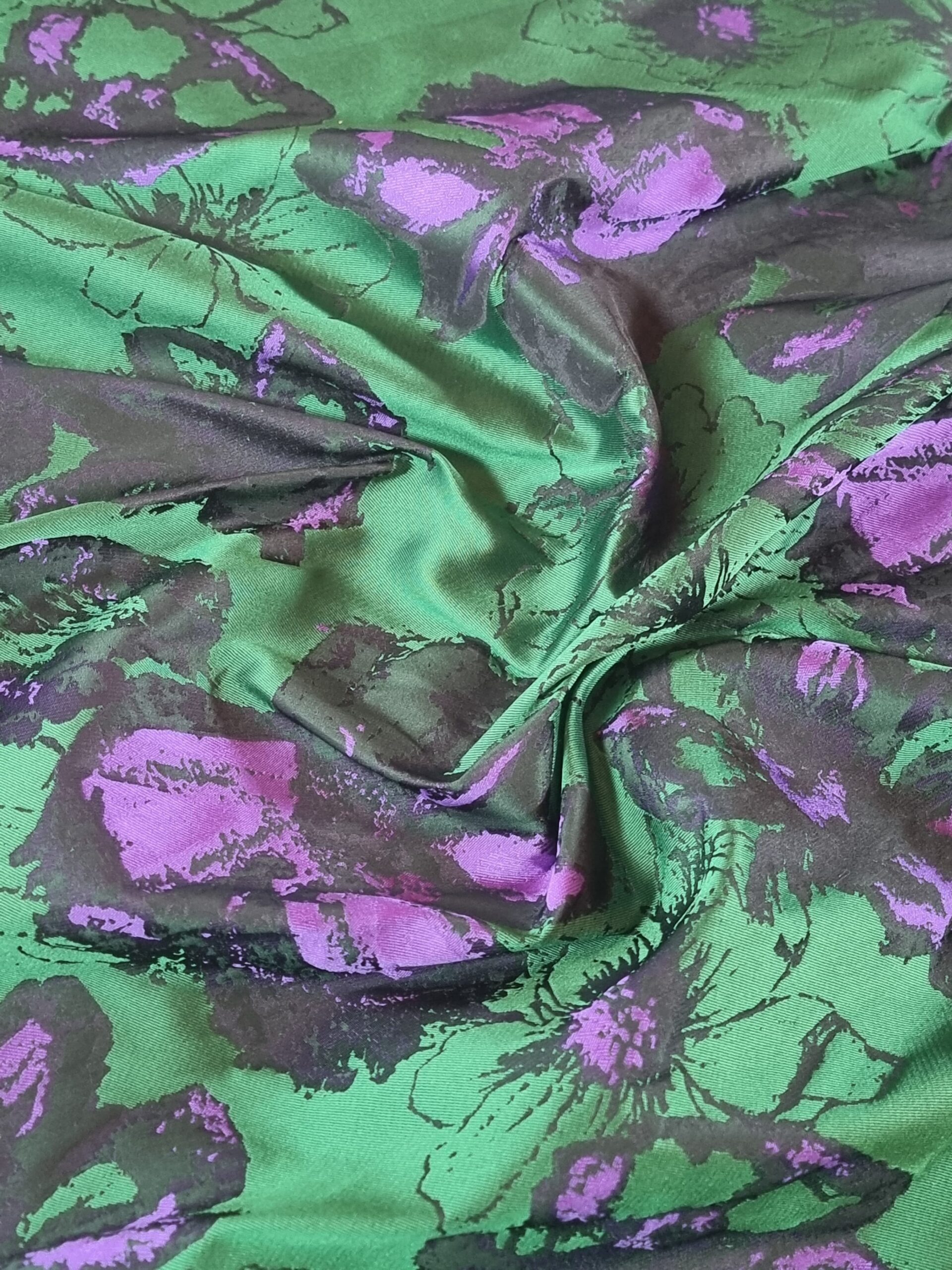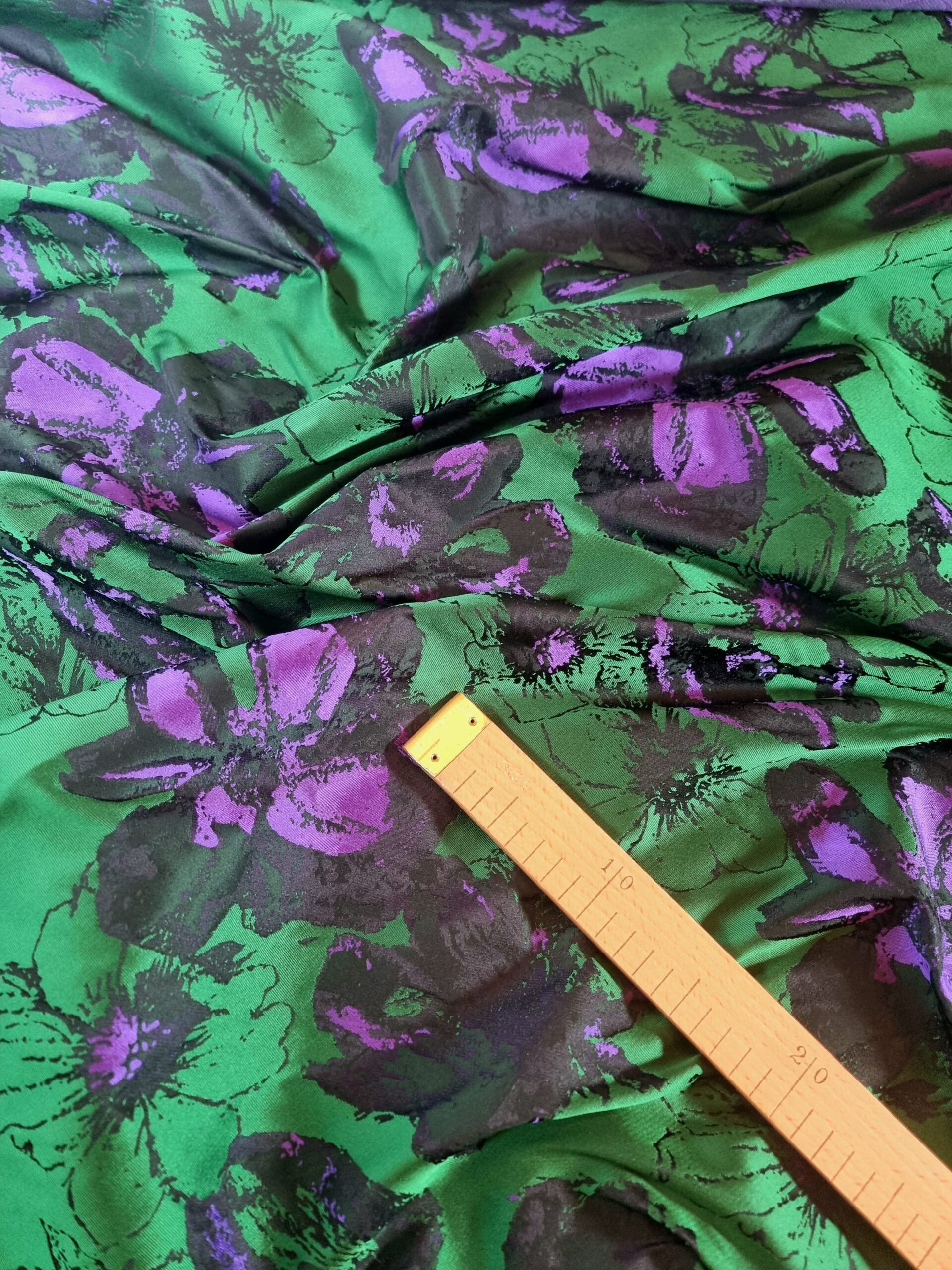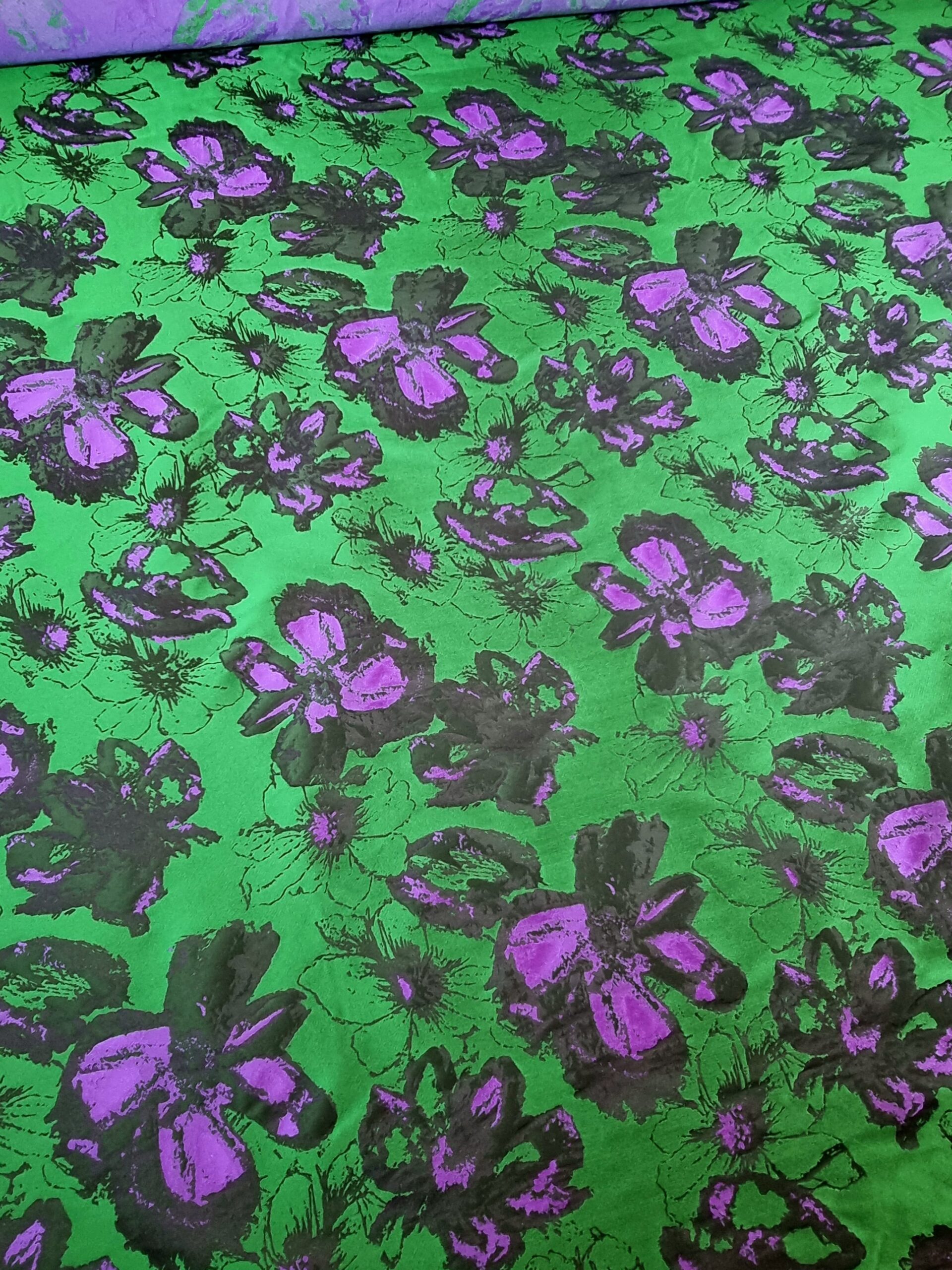 Tesatura tafta tip Jacquard cu flori mari mov pe fond Verde