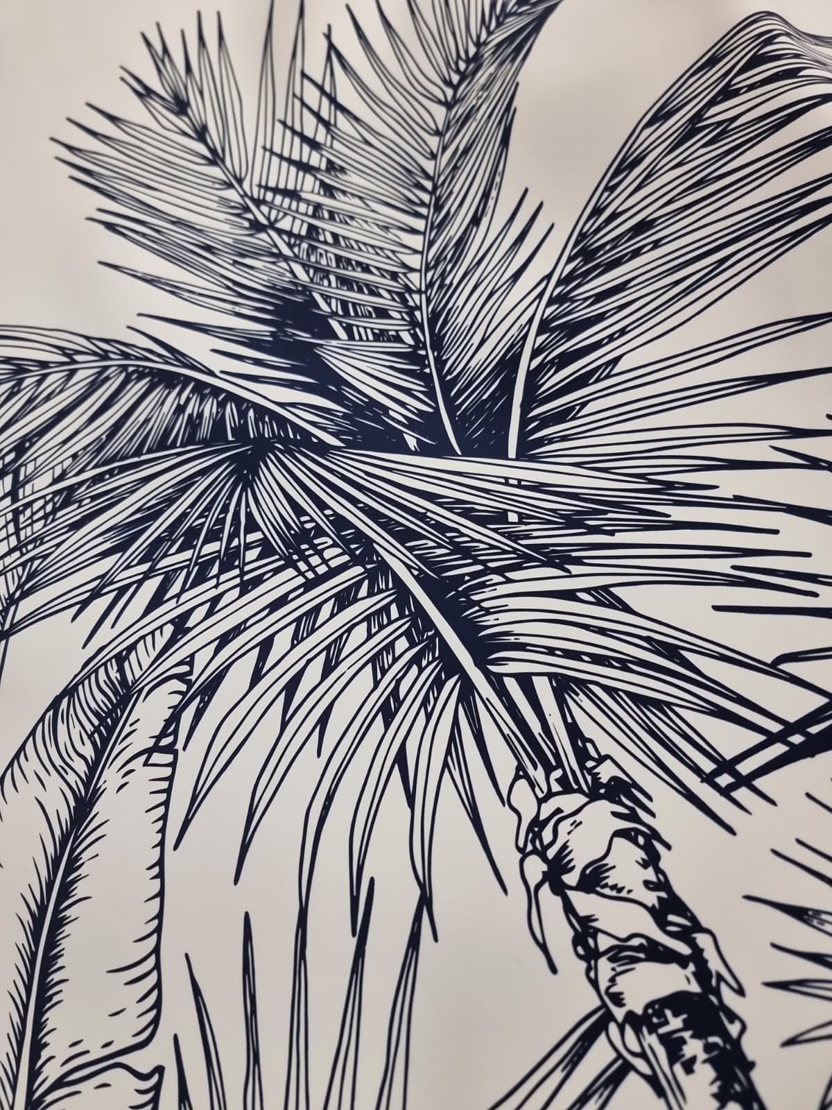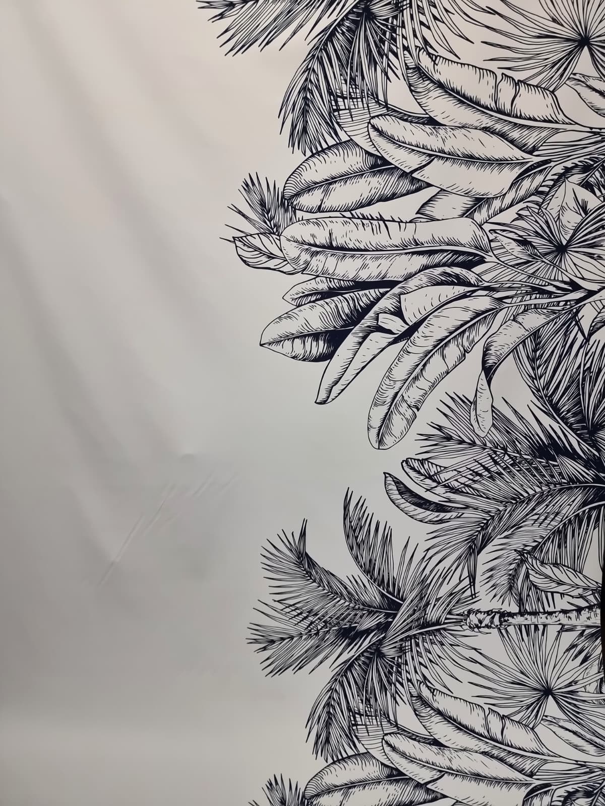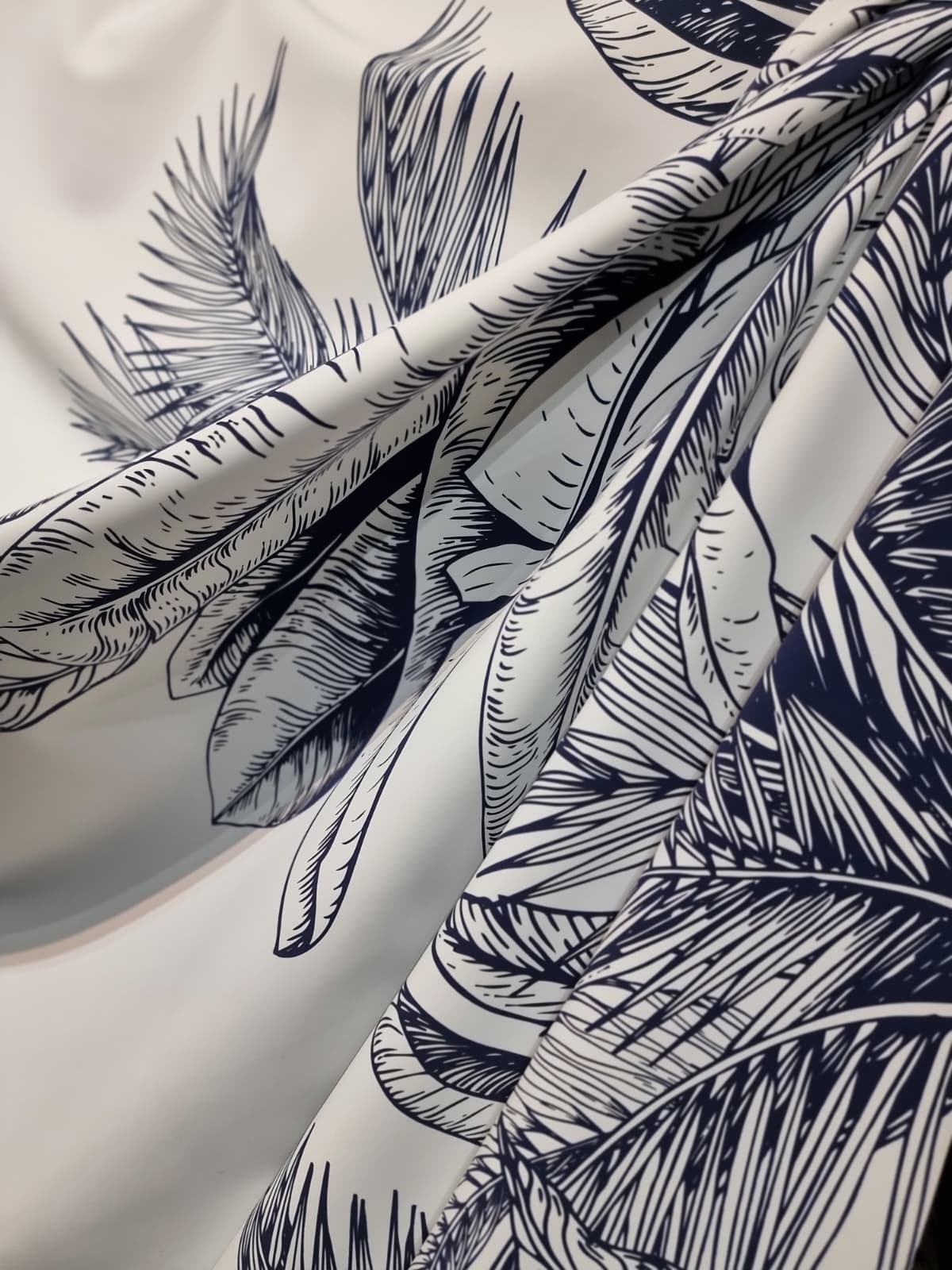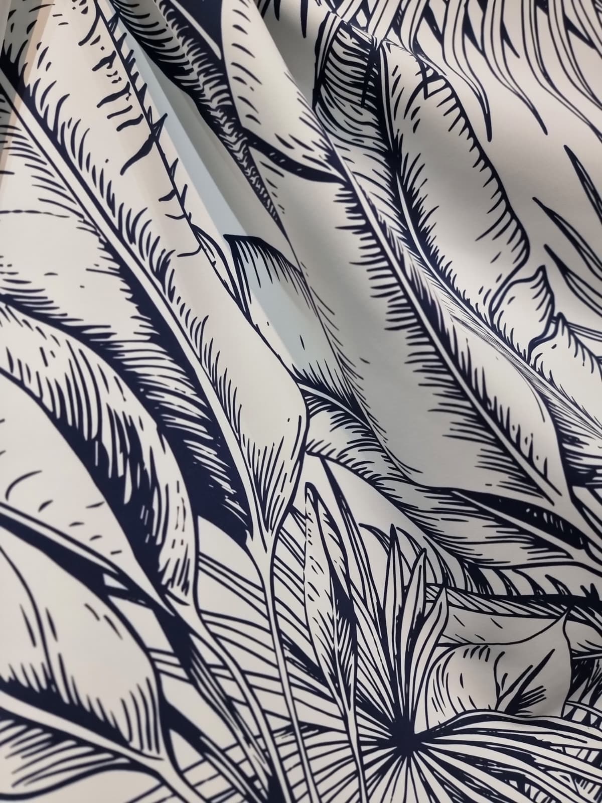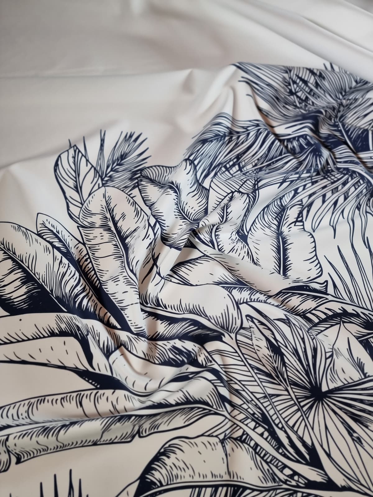 Tesatura tip lycra cu model exotic – bordură laterala cu frunze Bleumarin pe fond Alb