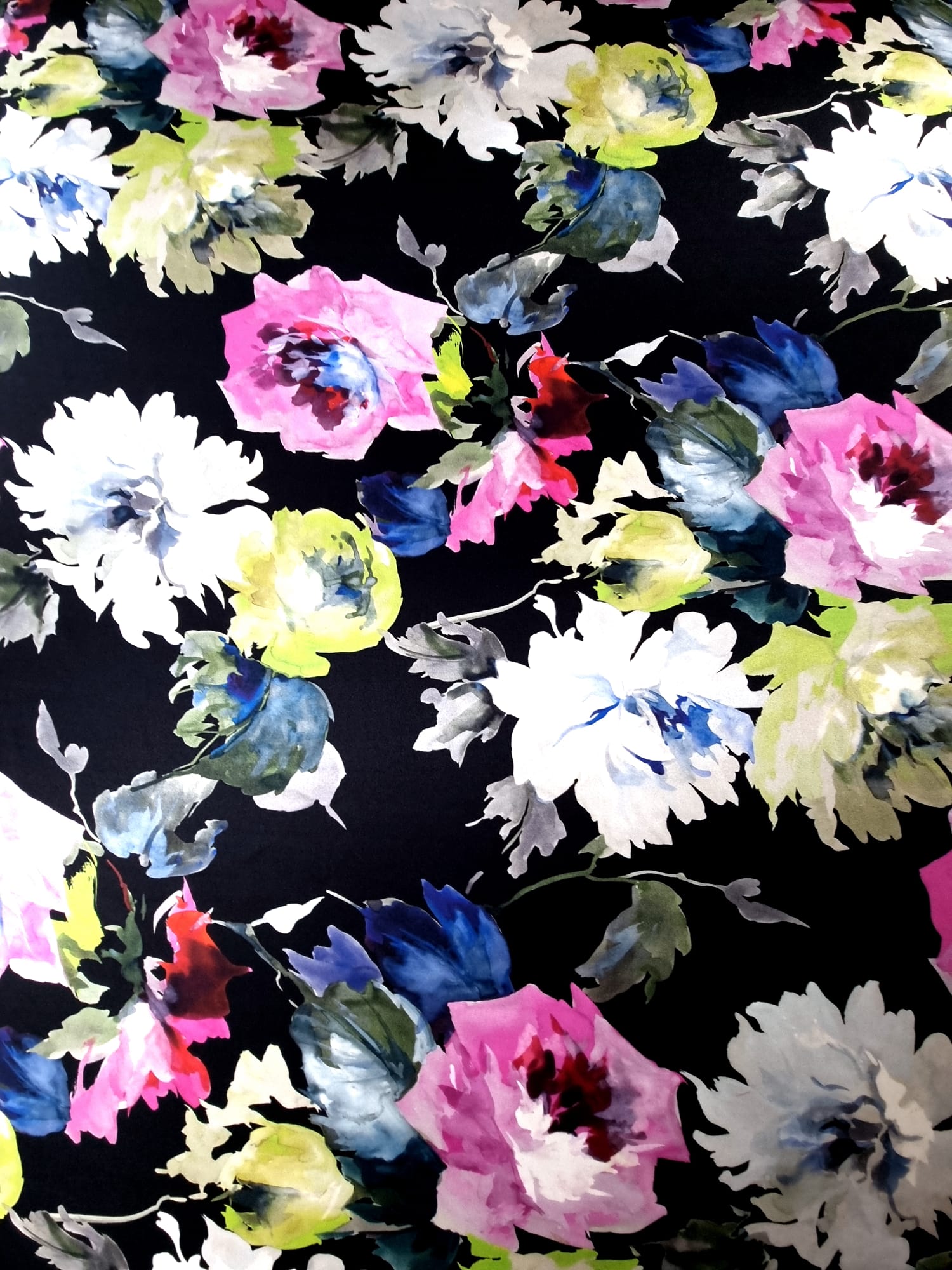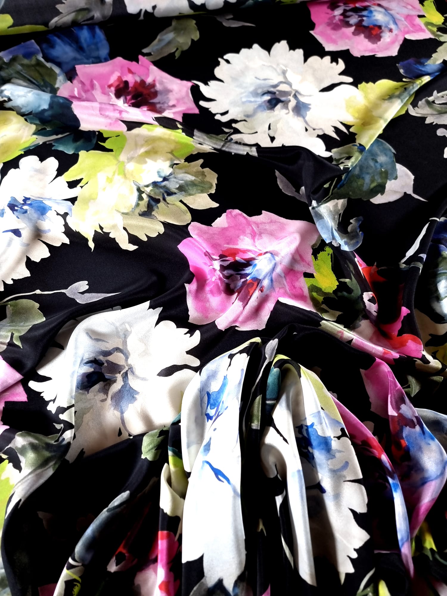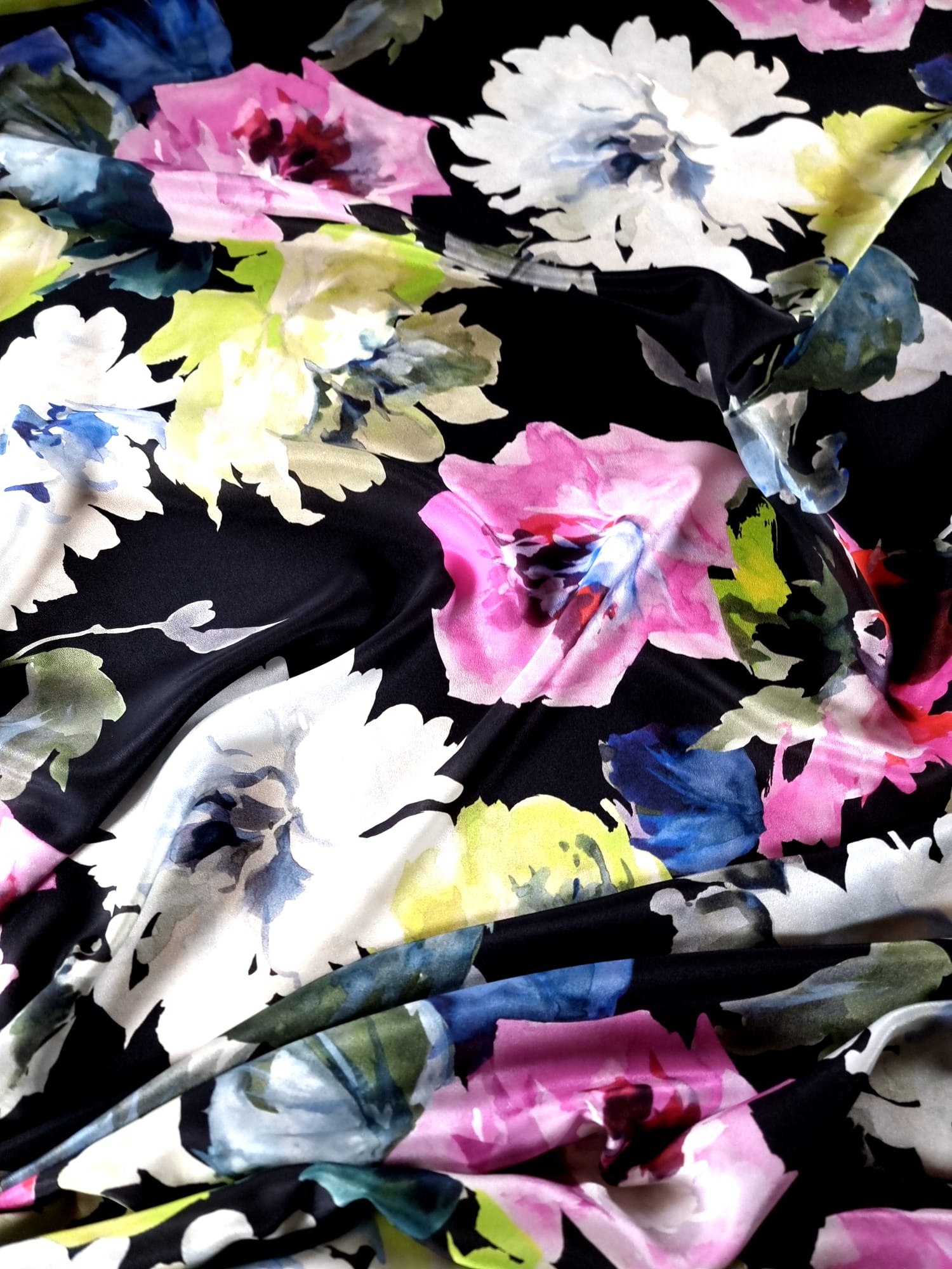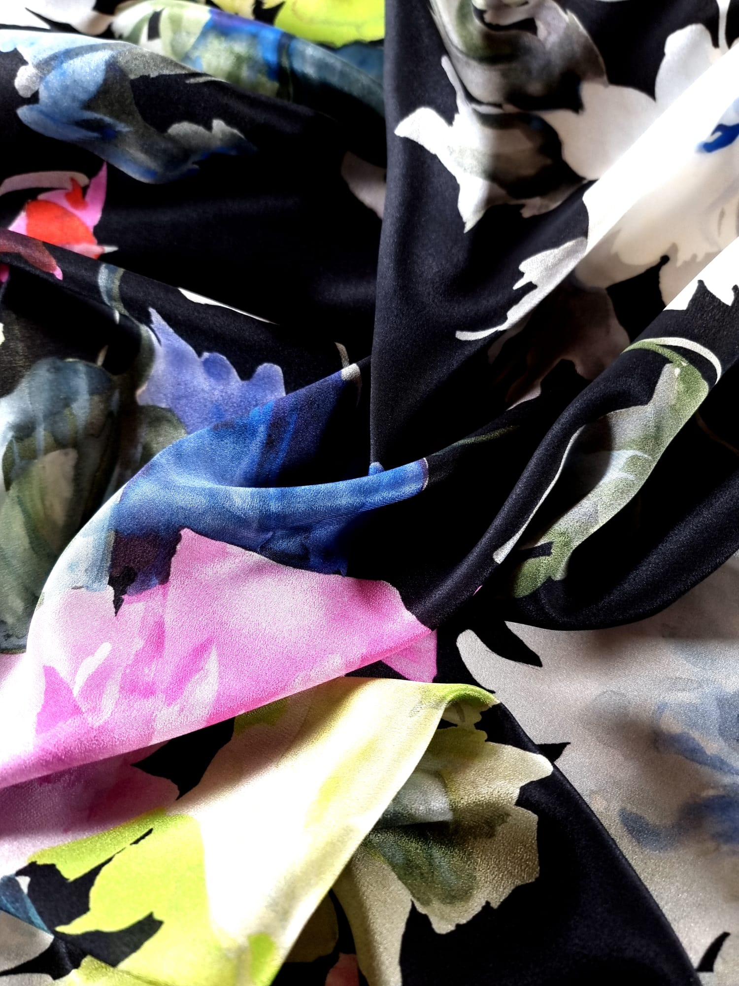 Voal din Matase Naturala – Imprimeu cu flori multicolore pe fond Negru