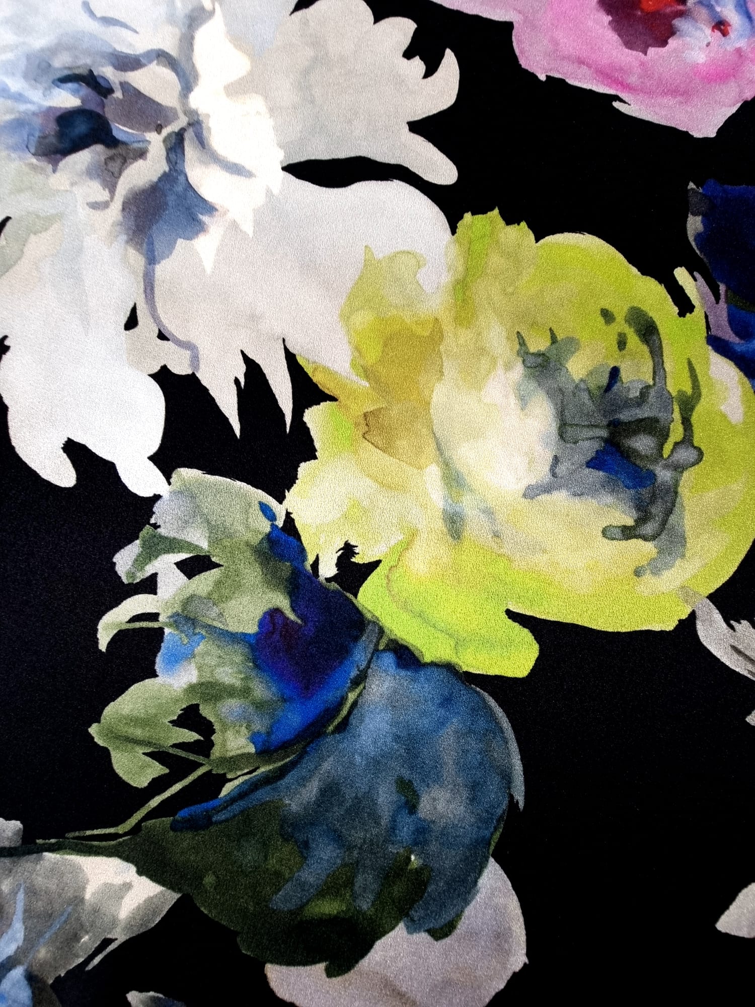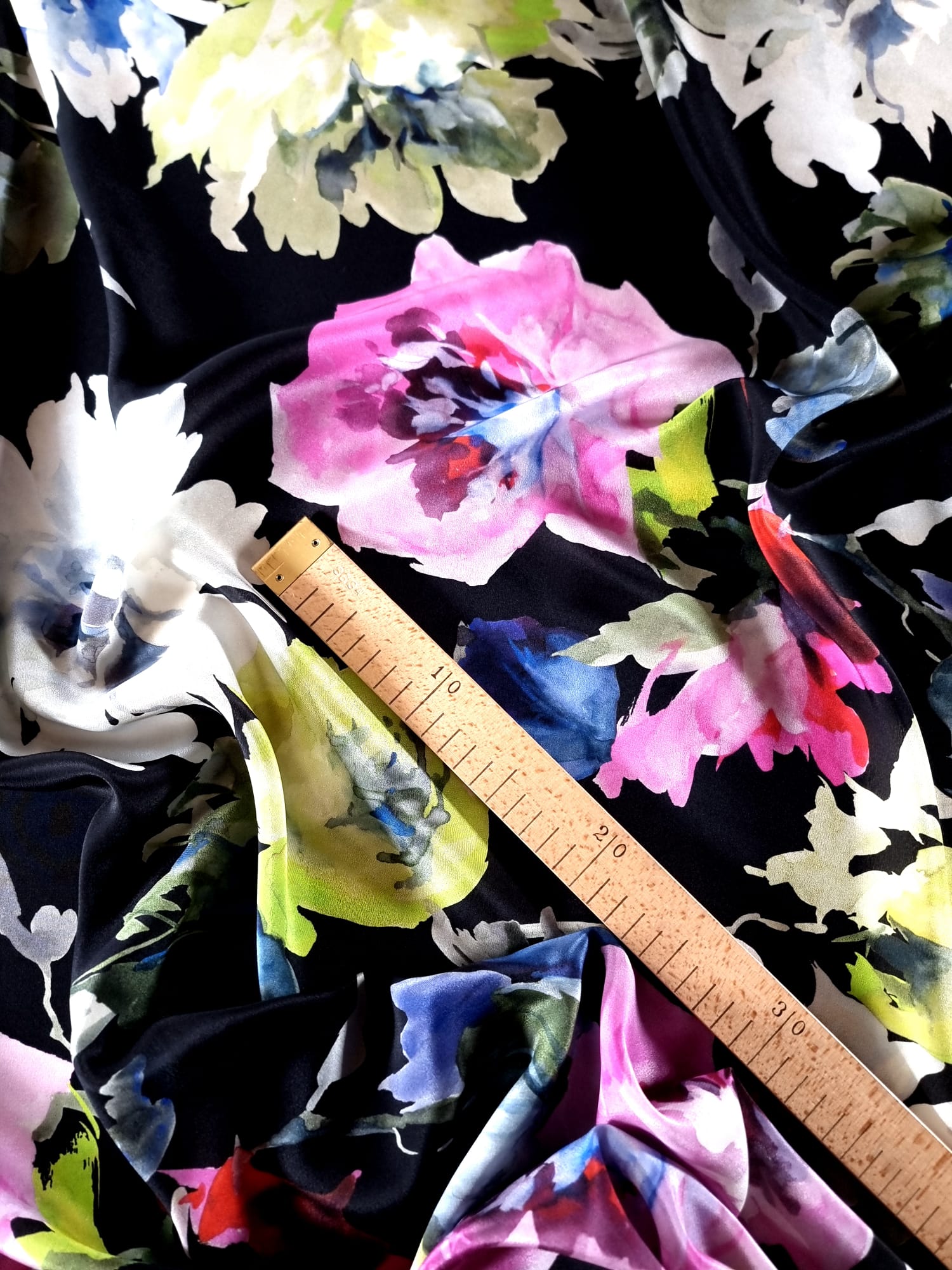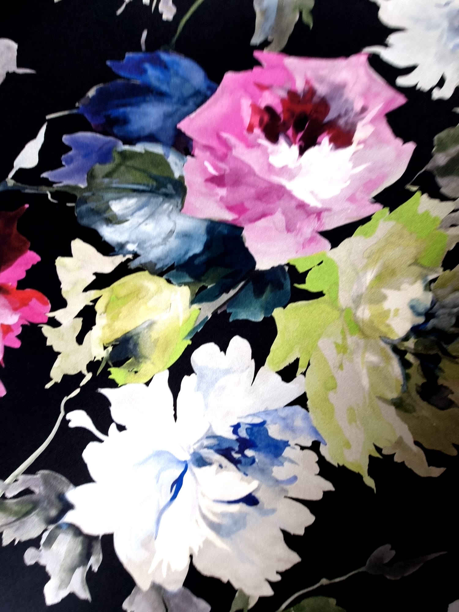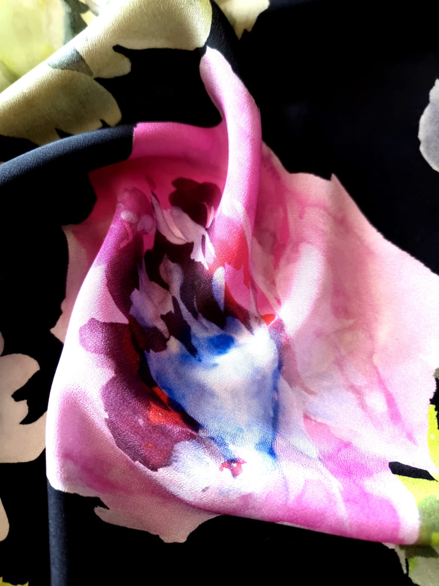 Voal din Matase Naturala – Imprimeu cu flori multicolore pe fond Negru