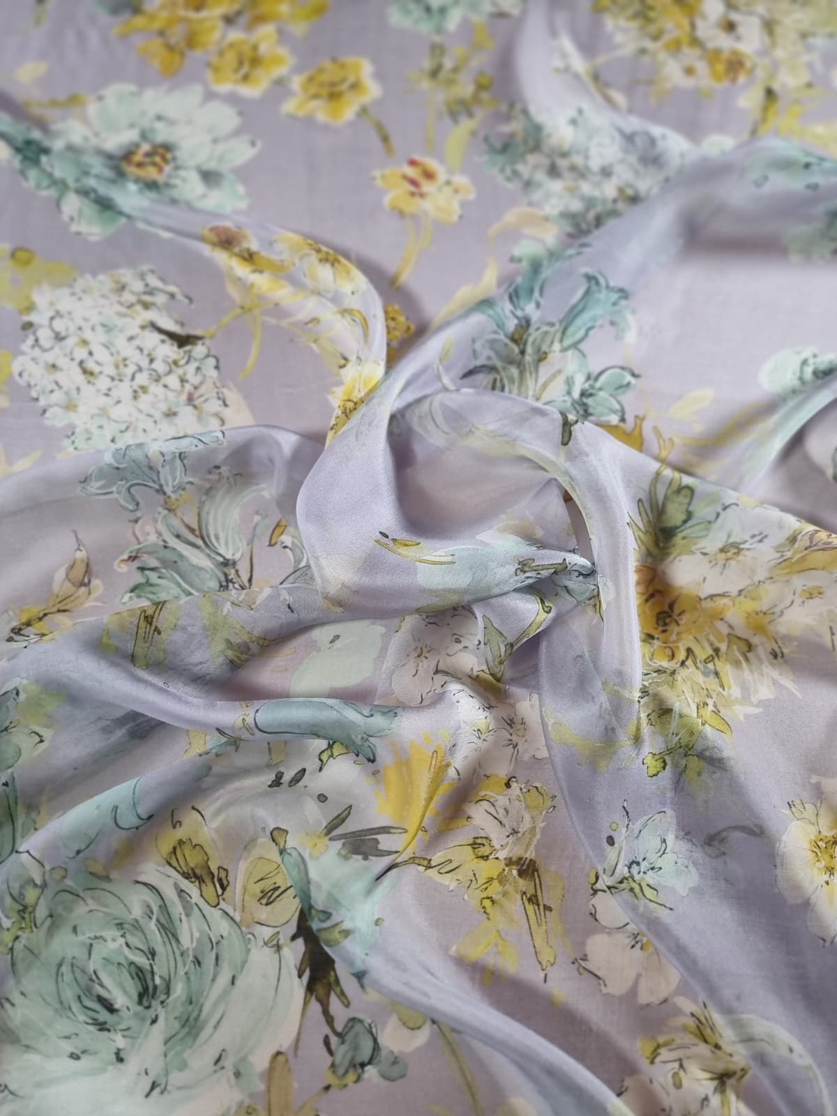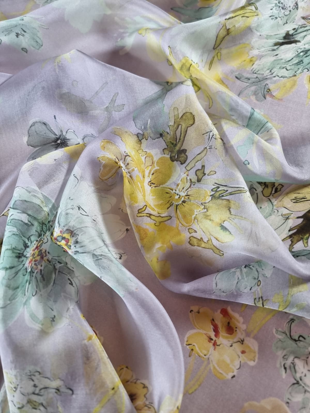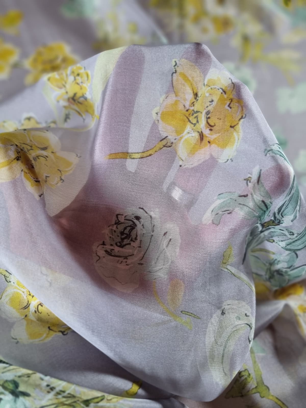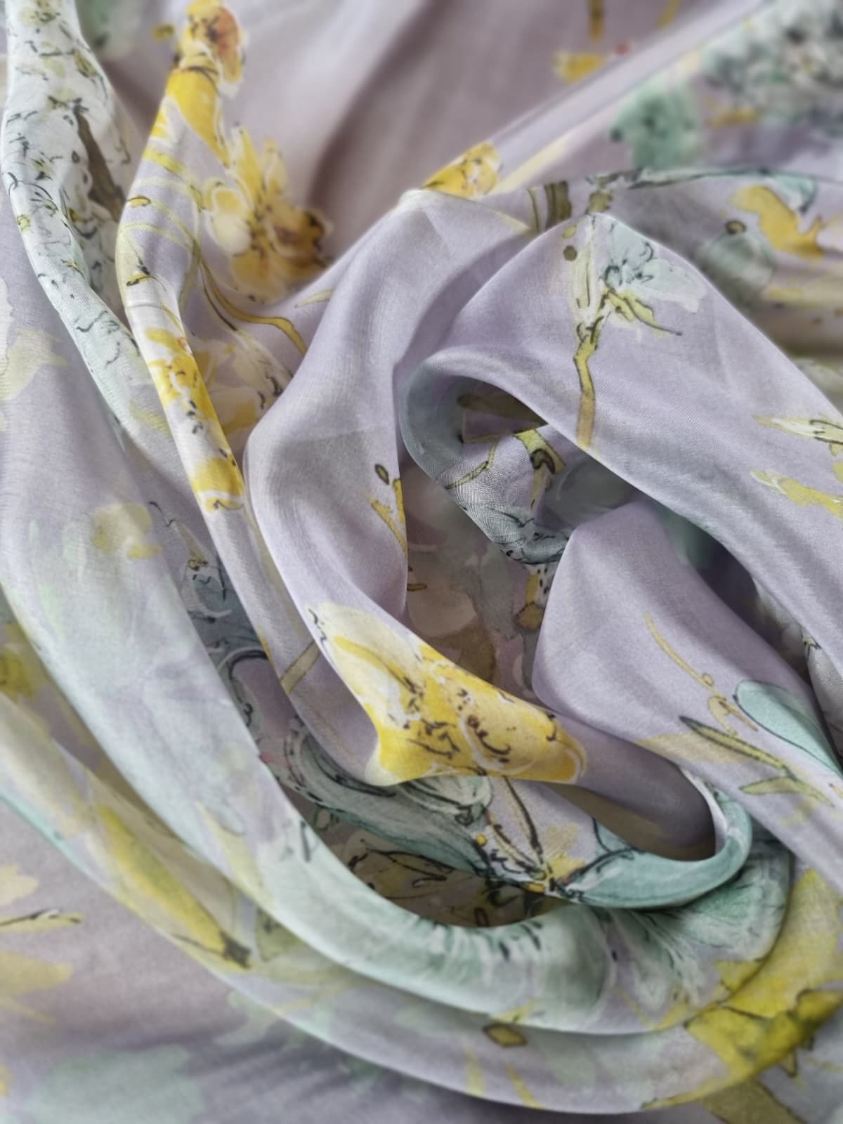 Voal din matase naturala – Imprimeu floral in culori pastel, Galben-pai/Vernil/Gri pearl