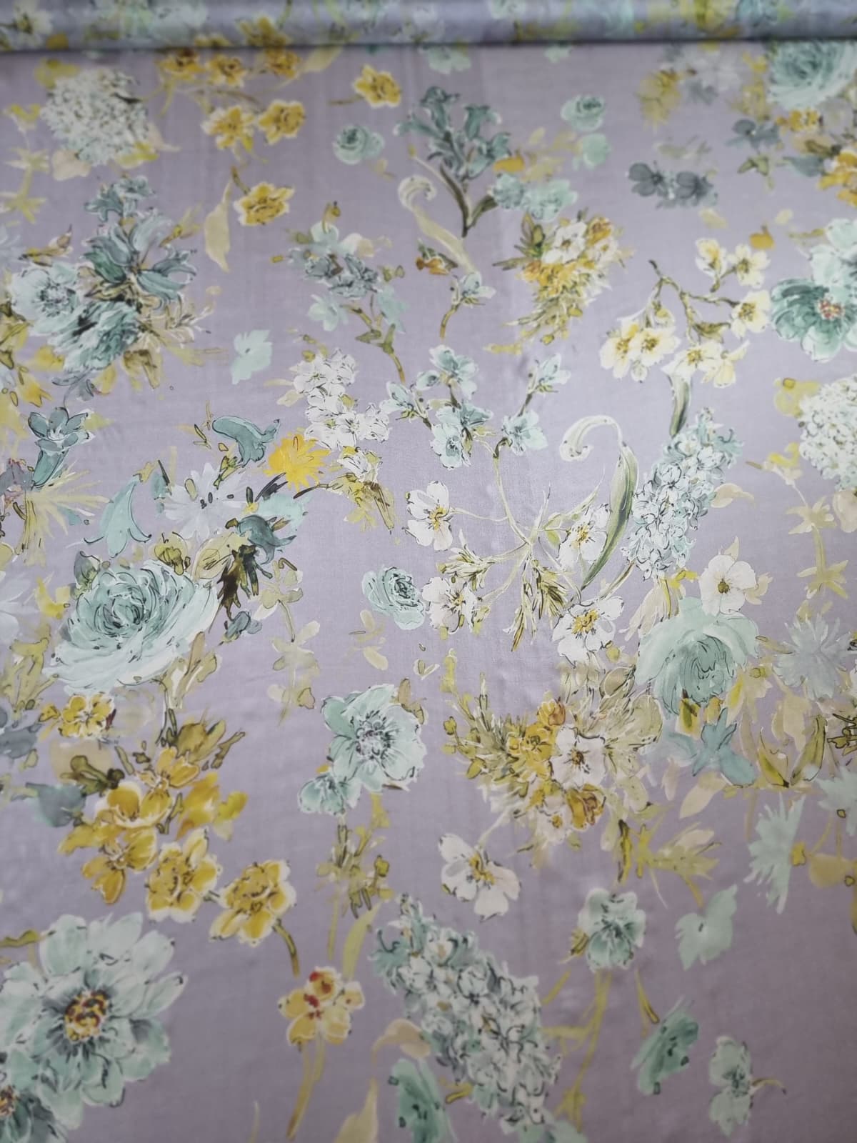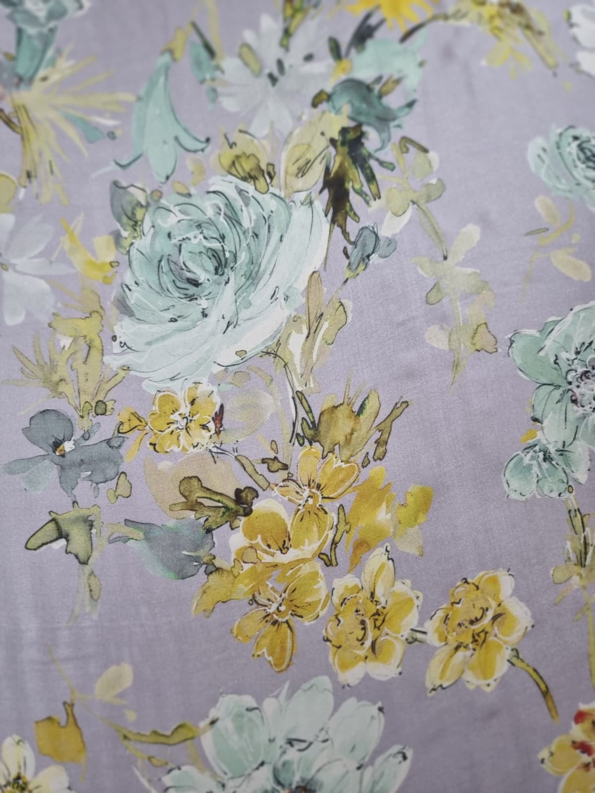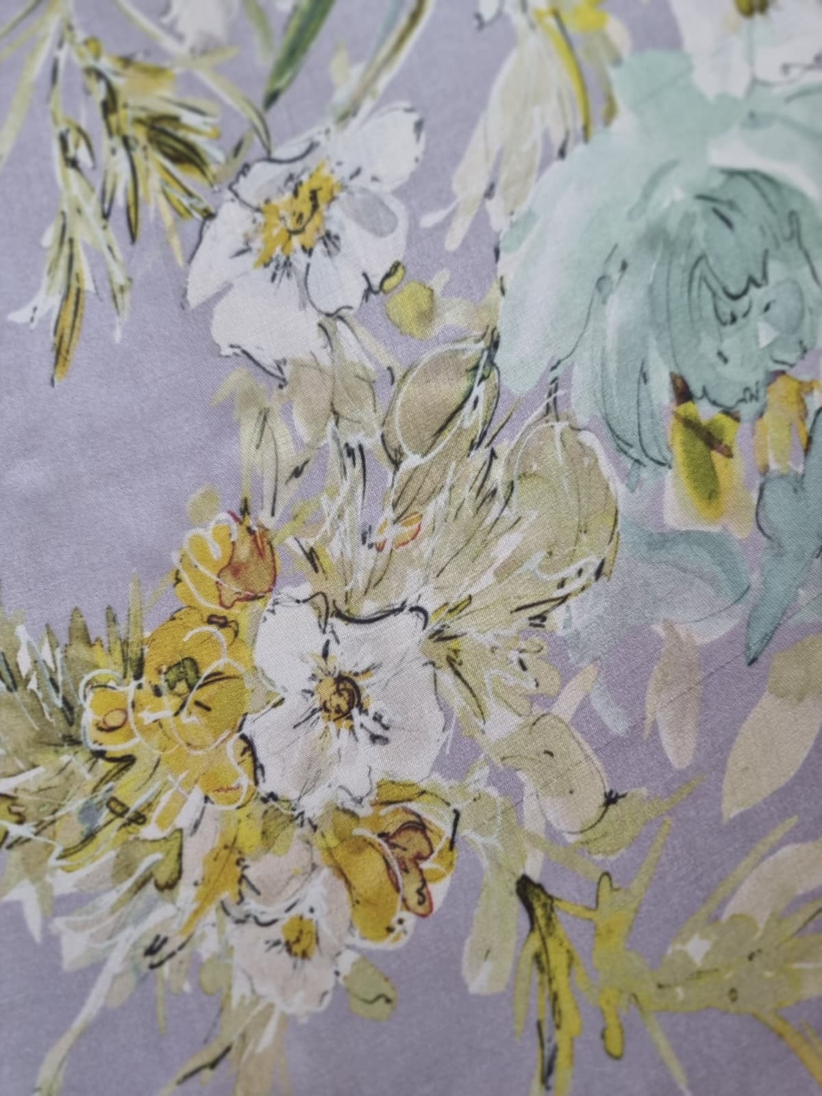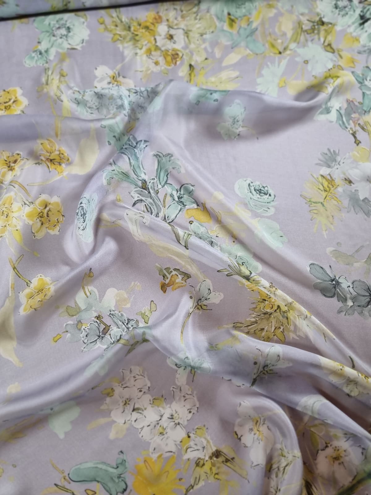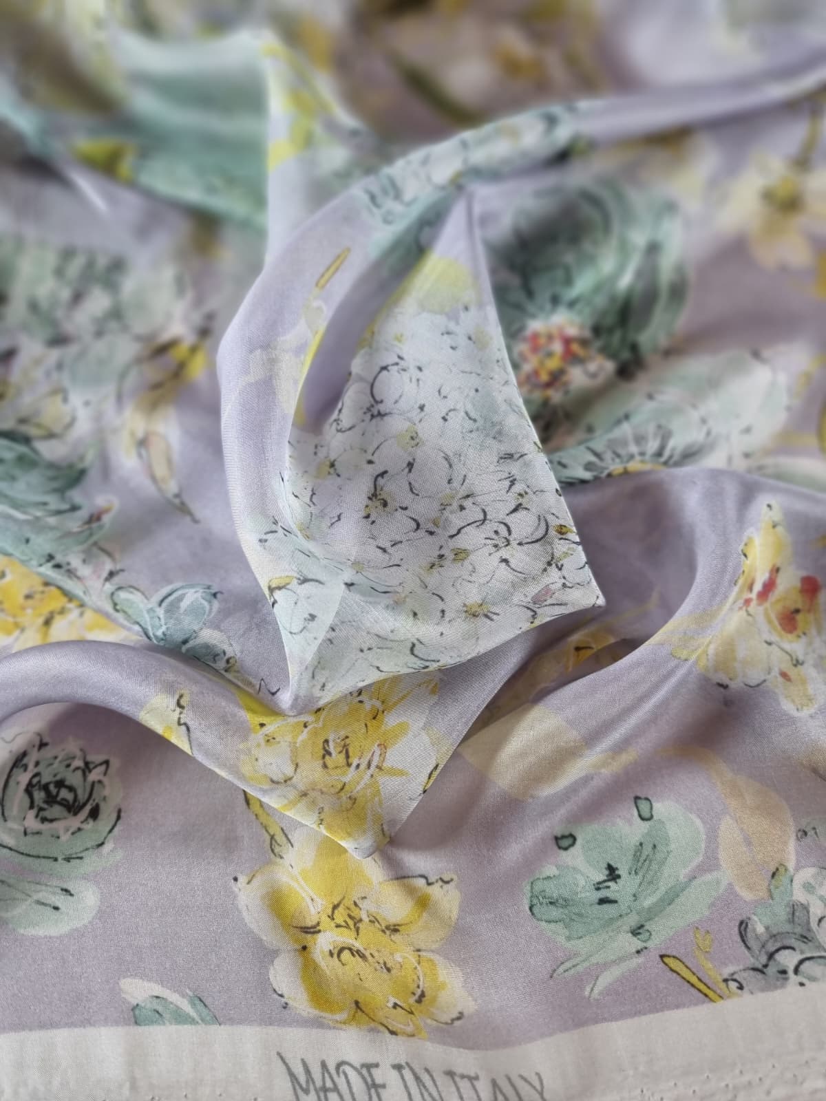 Voal din matase naturala – Imprimeu floral in culori pastel, Galben-pai/Vernil/Gri pearl