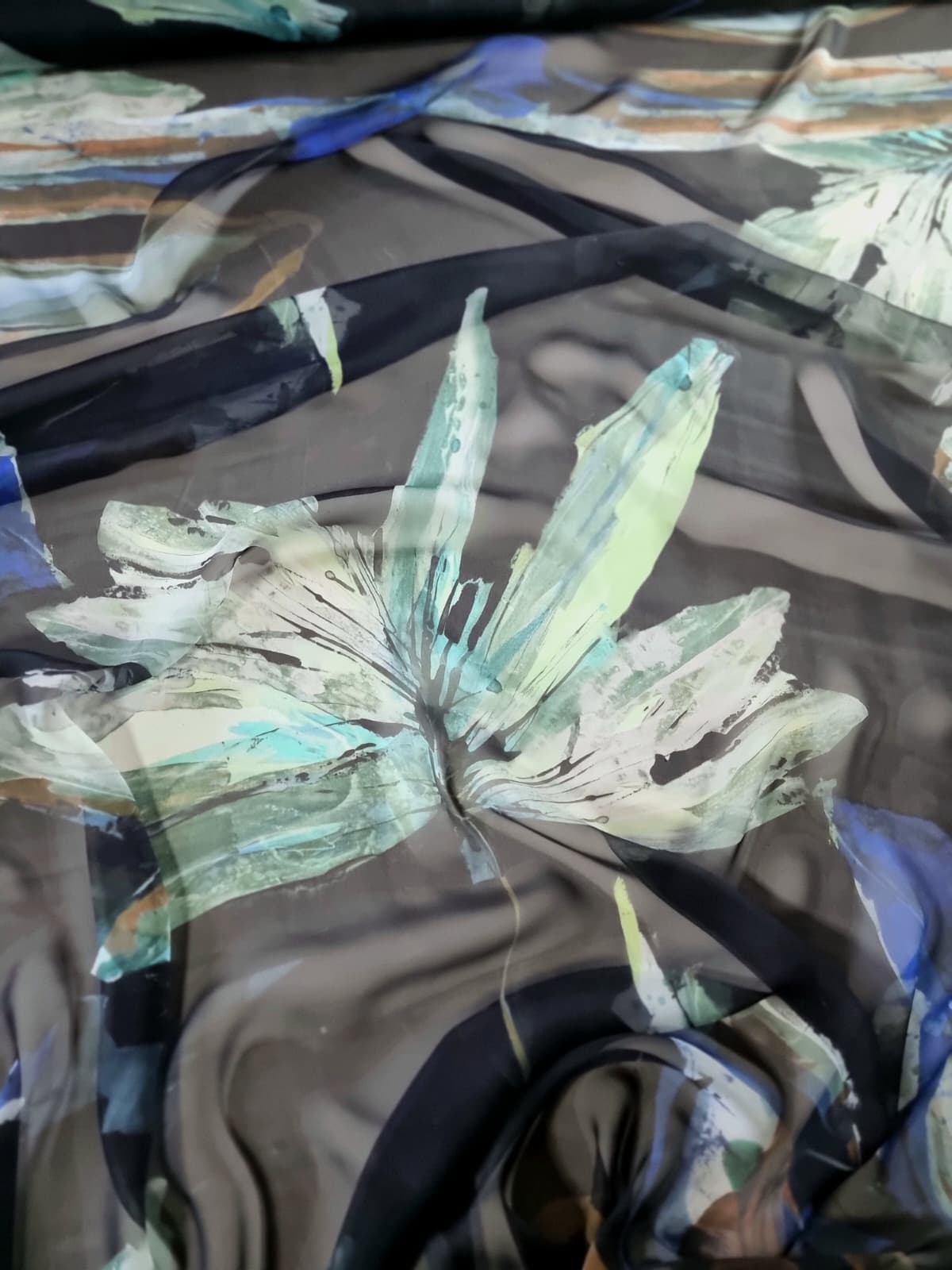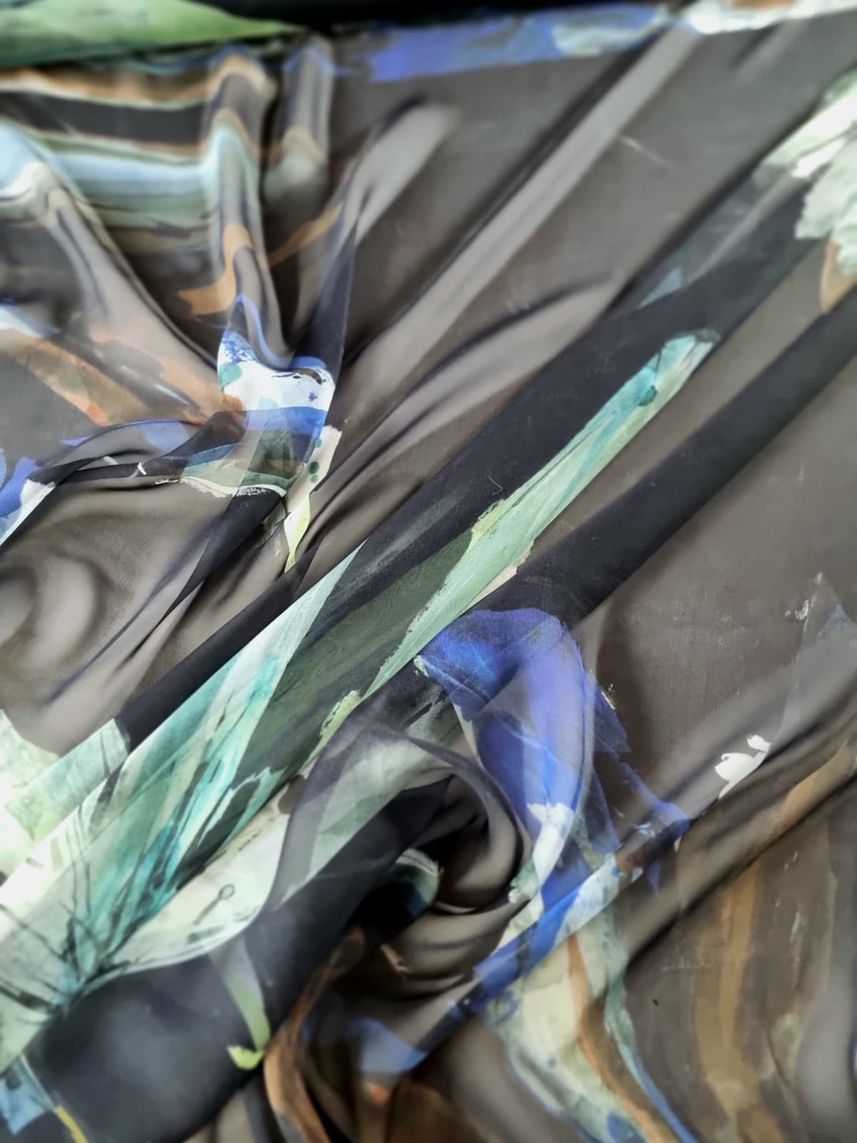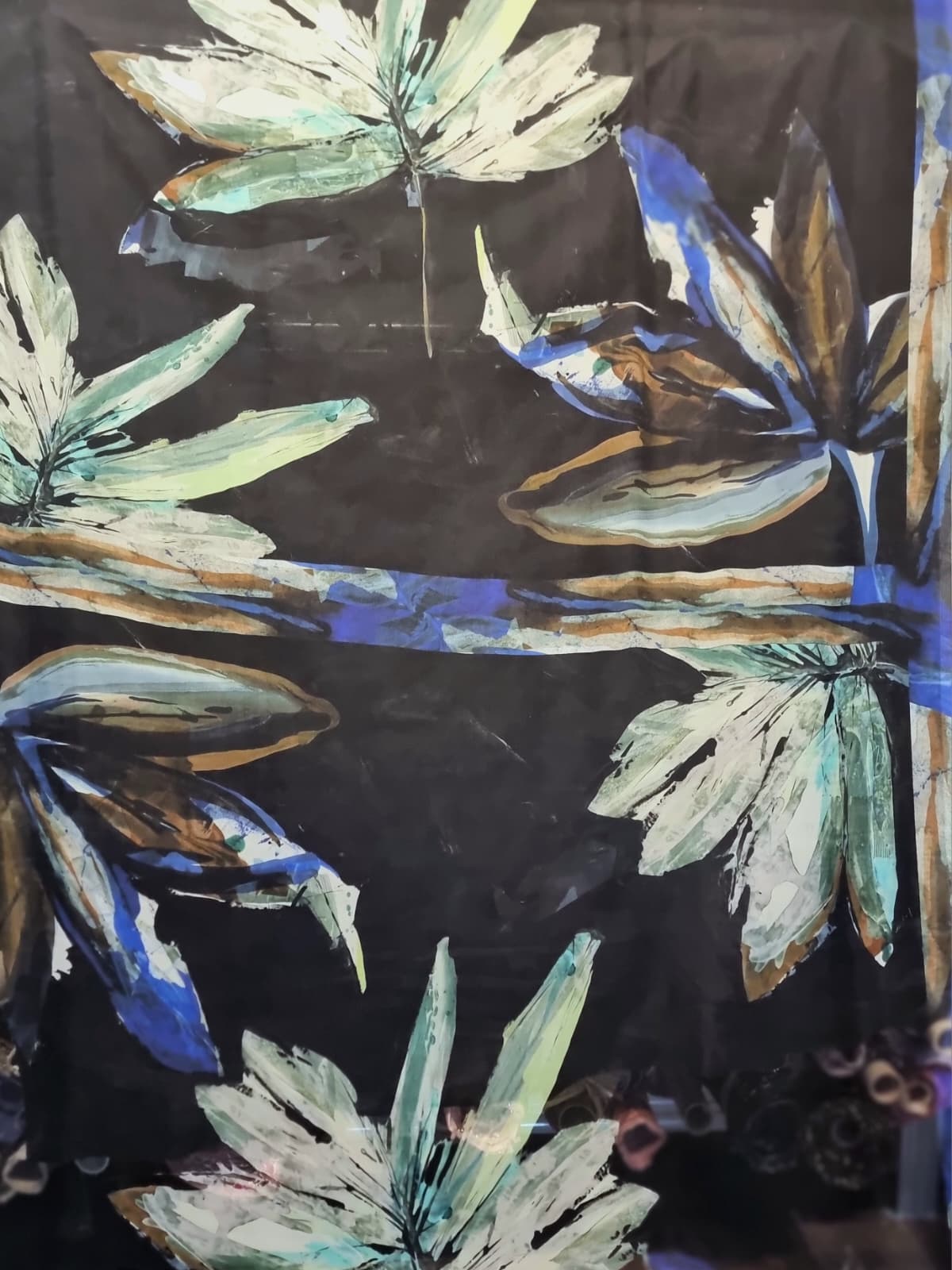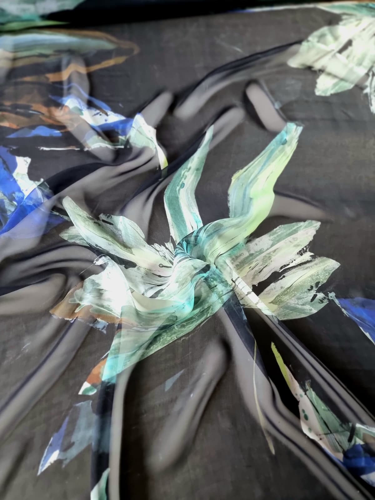 Voal din matase naturala sub formă de panou – Imprimeu floral, Verde / Albastru / Negru