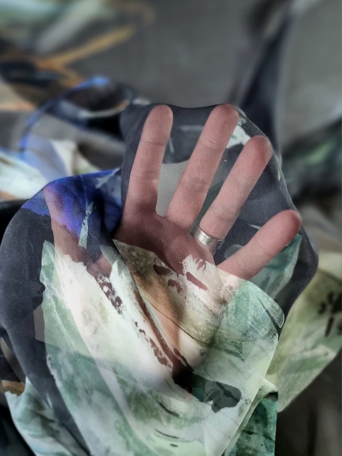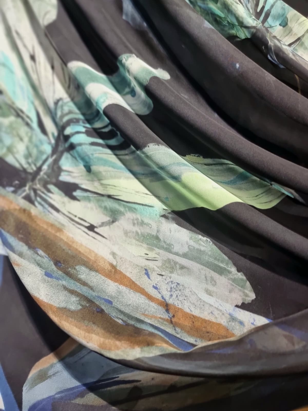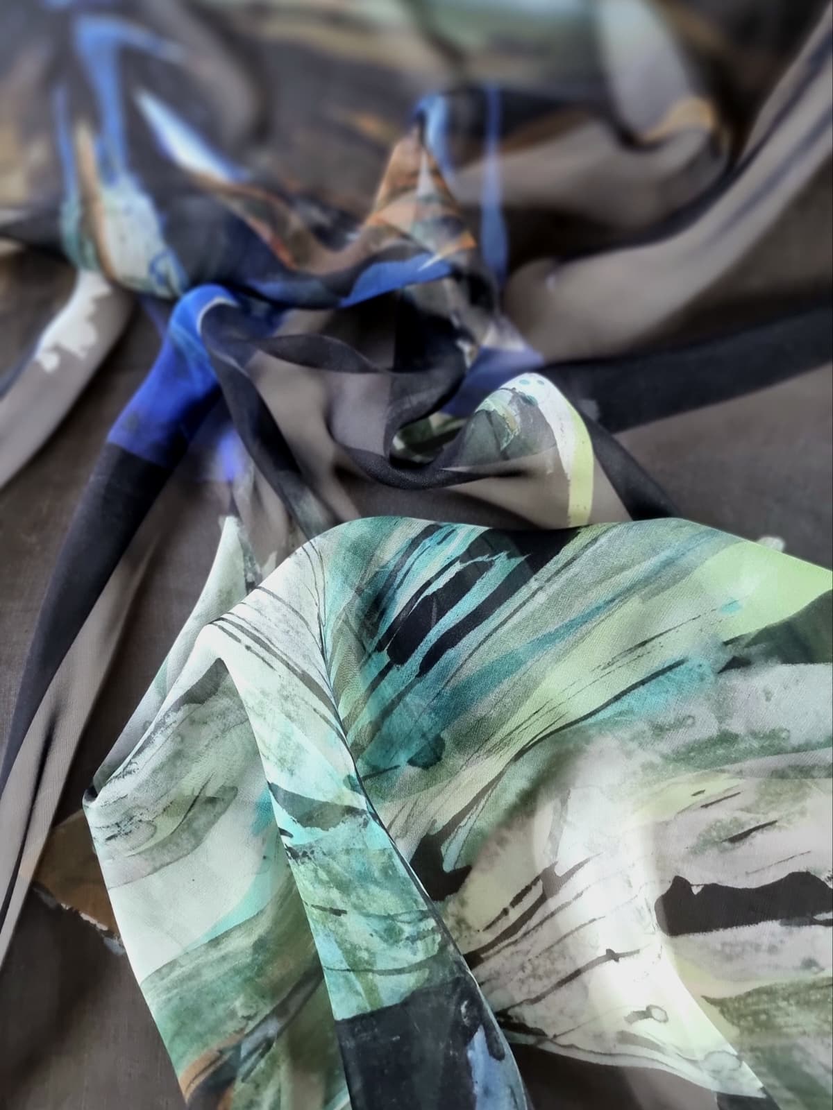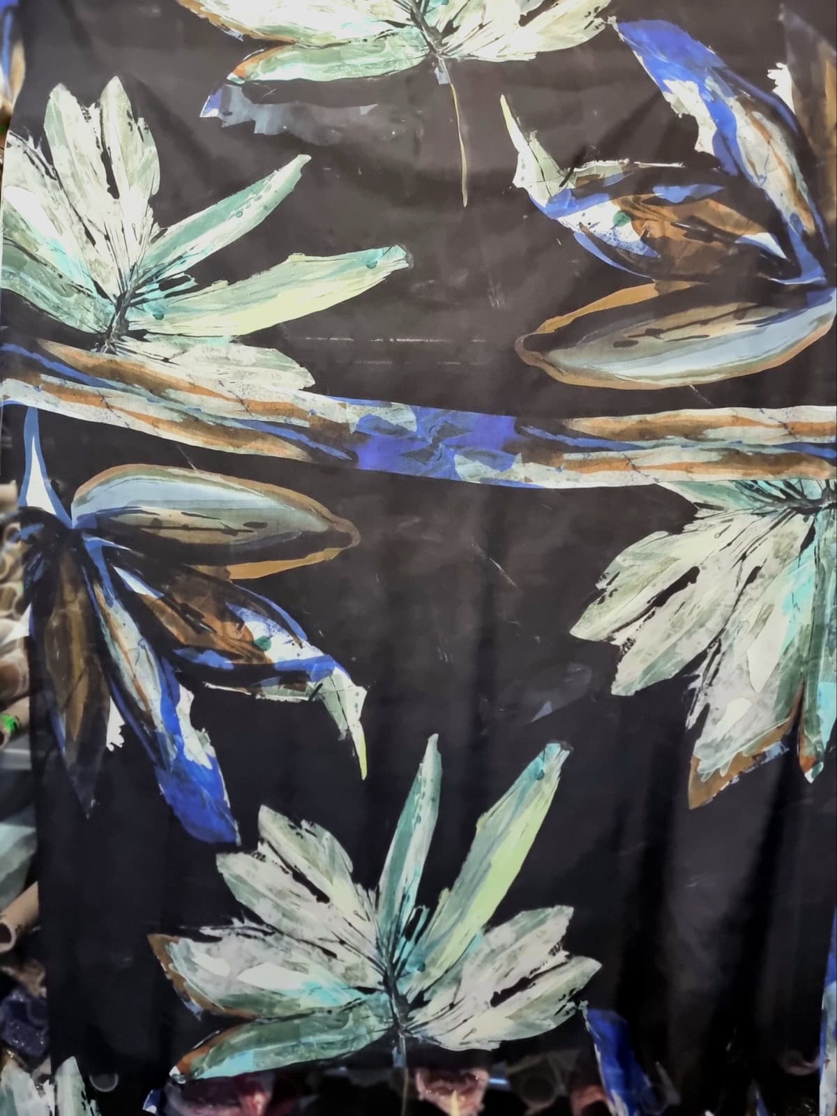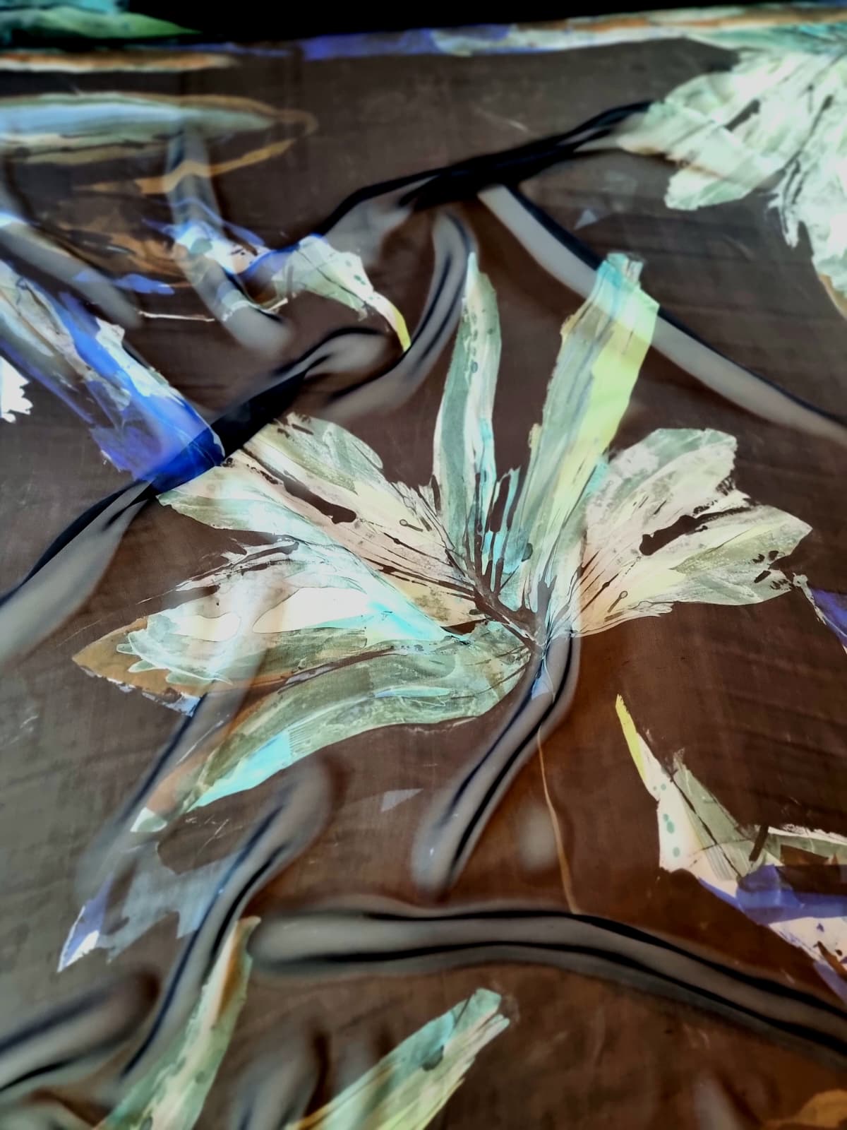 Voal din matase naturala sub formă de panou – Imprimeu floral, Verde / Albastru / Negru