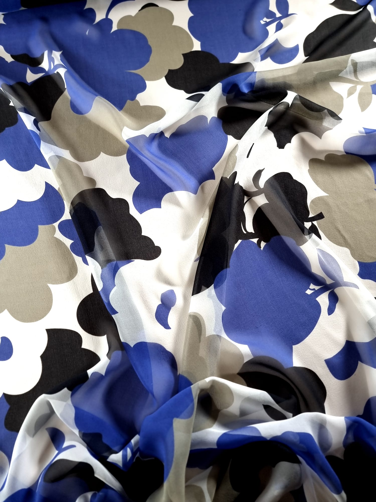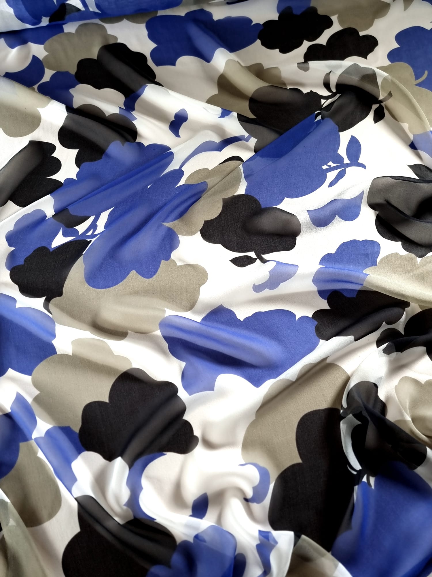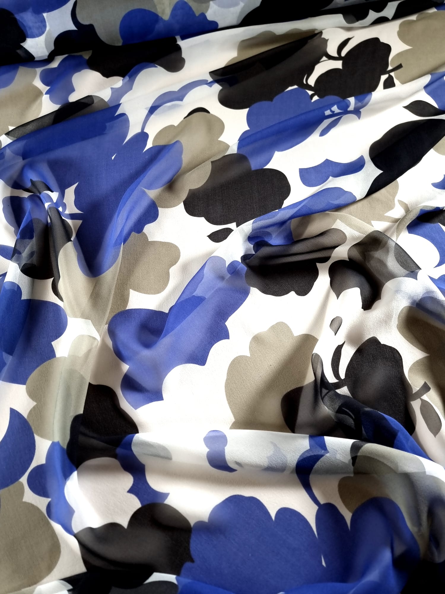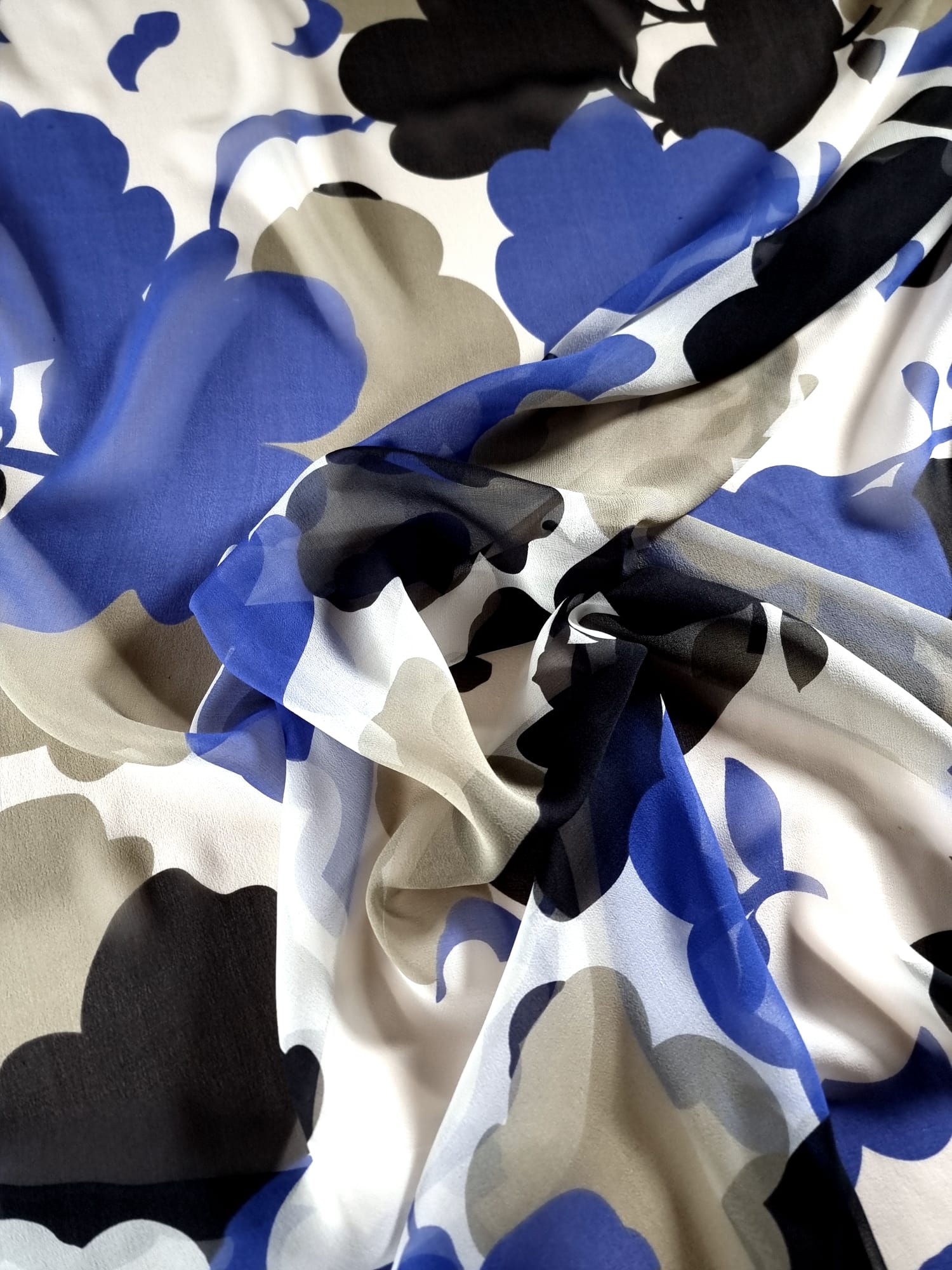 Voal georgette din Matase Naturala – design floral, Albastru / Alb / Negru / Gri