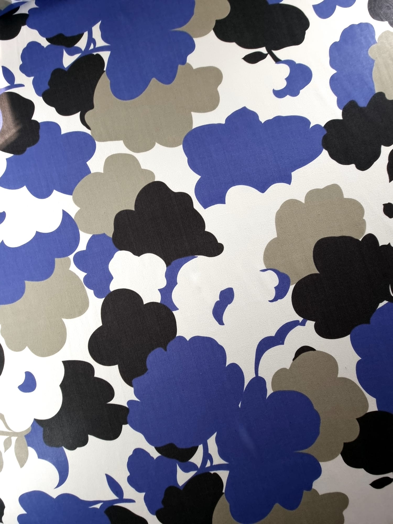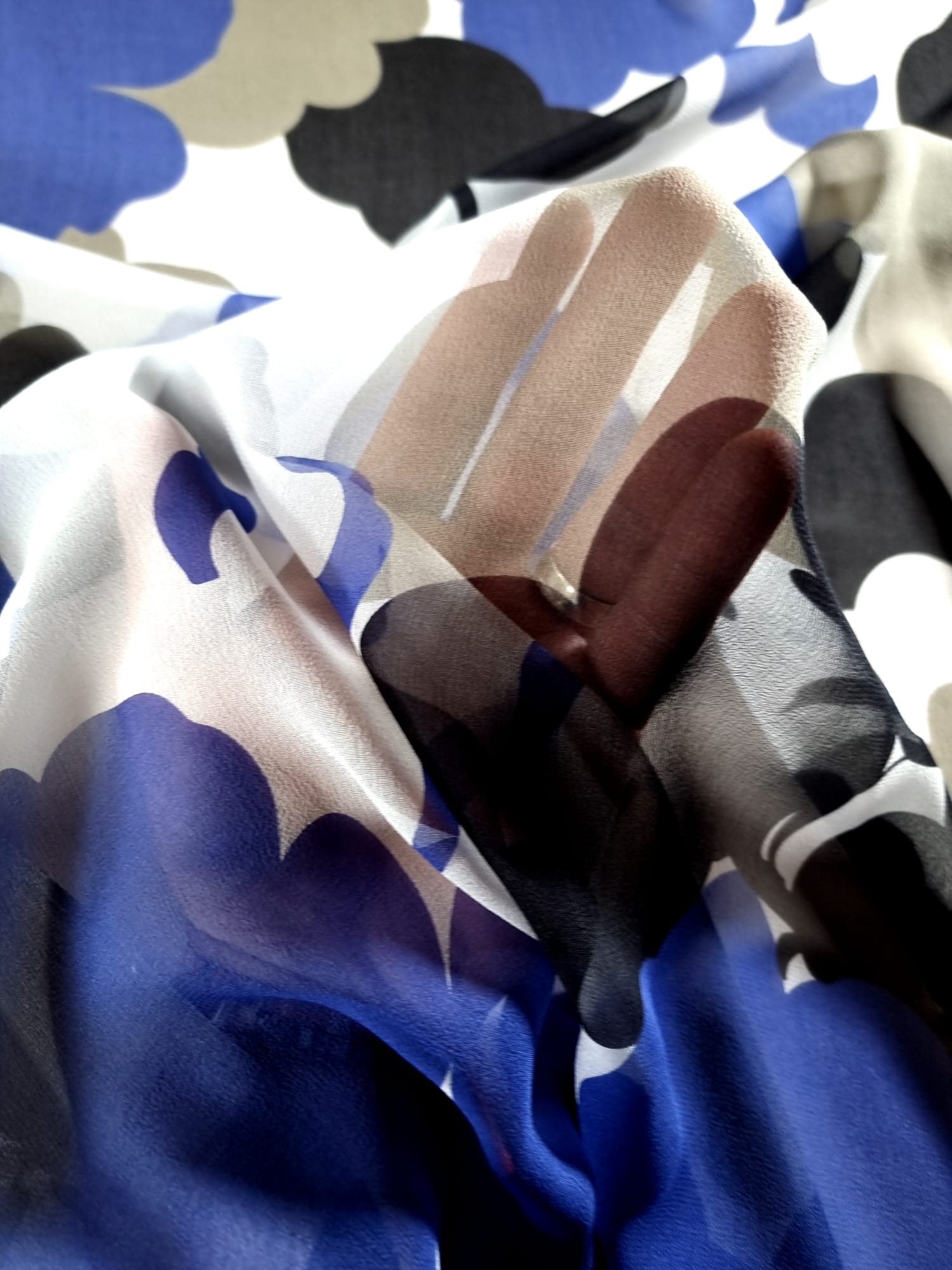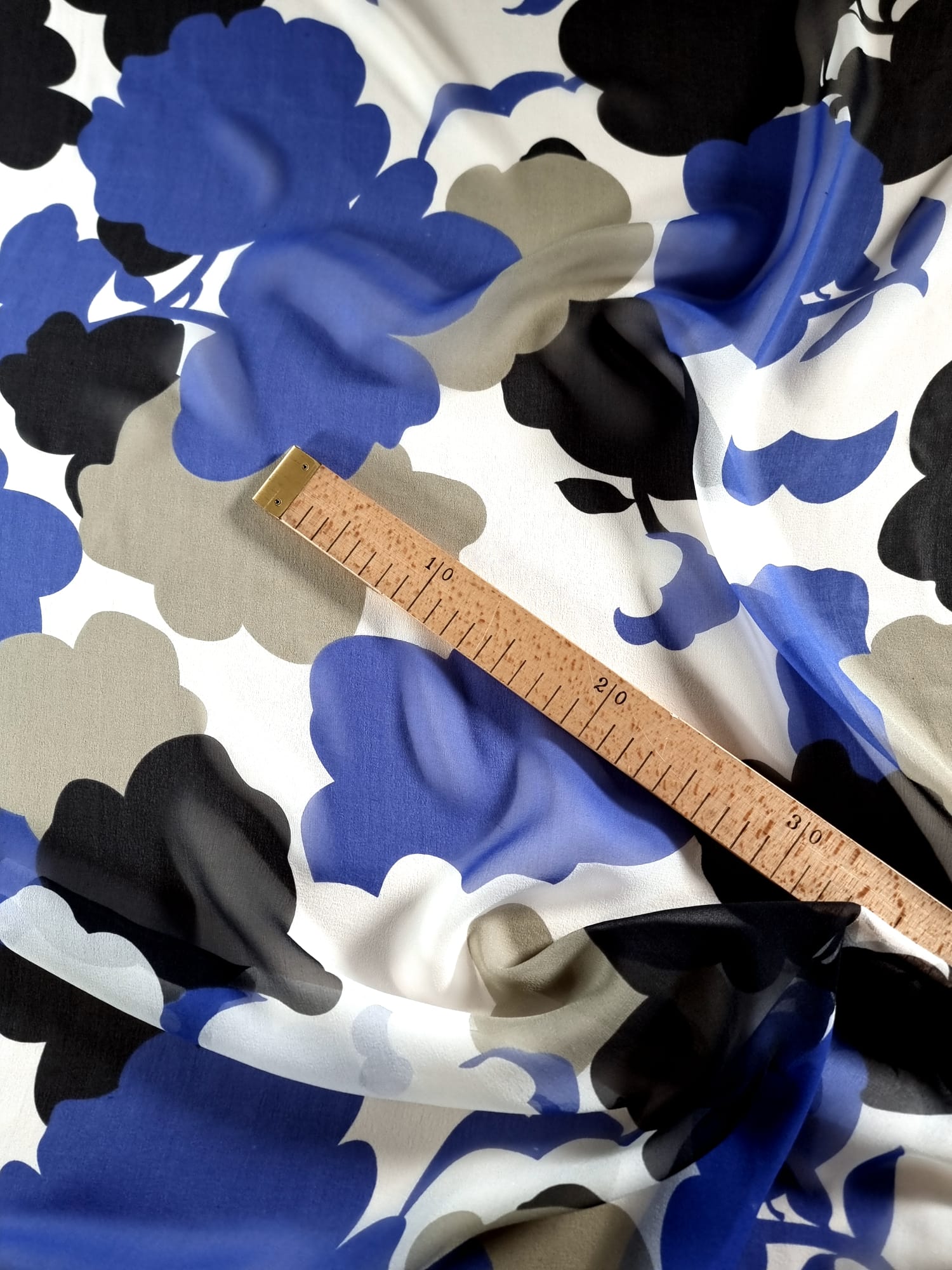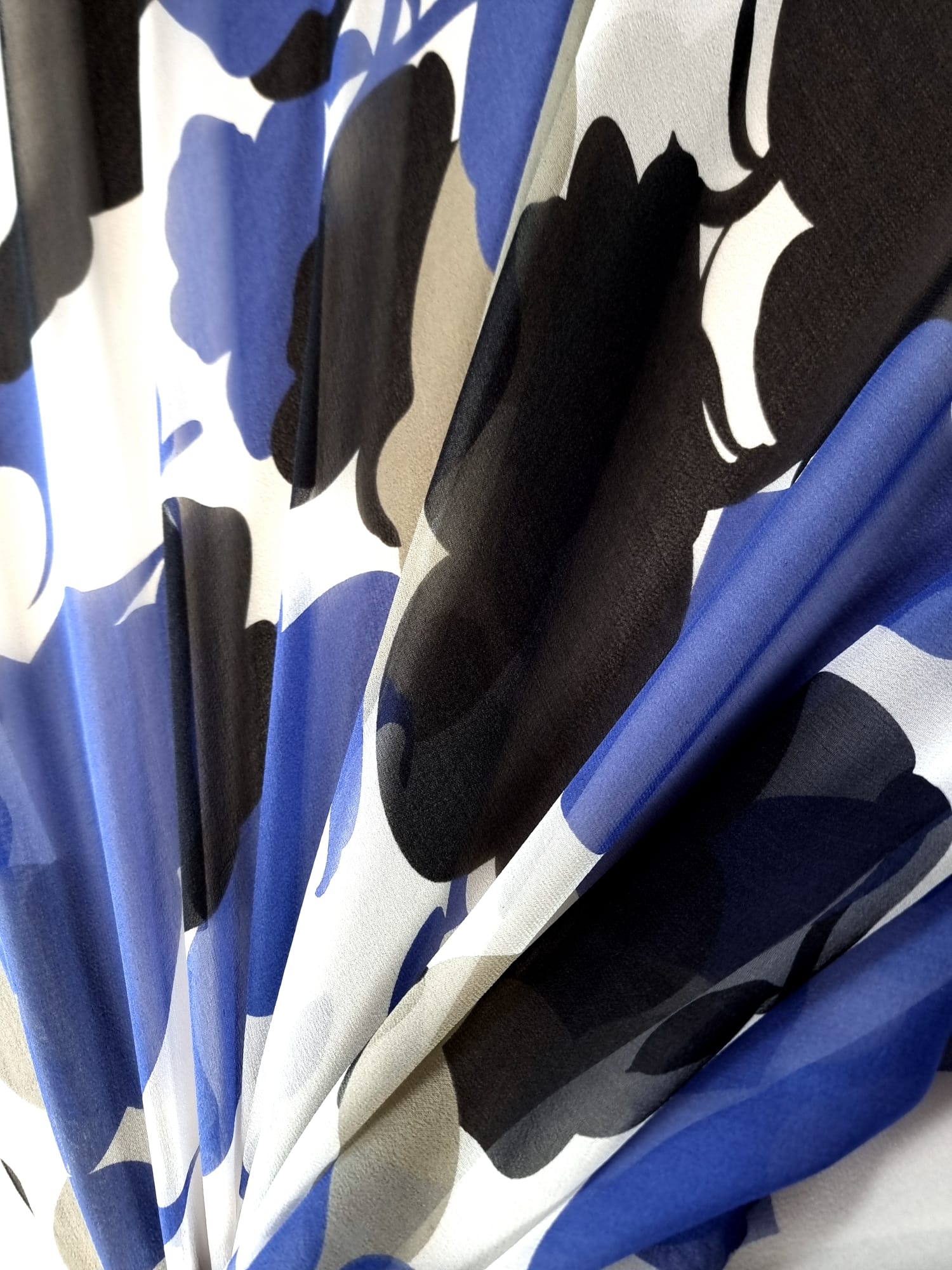 Voal georgette din Matase Naturala – design floral, Albastru / Alb / Negru / Gri