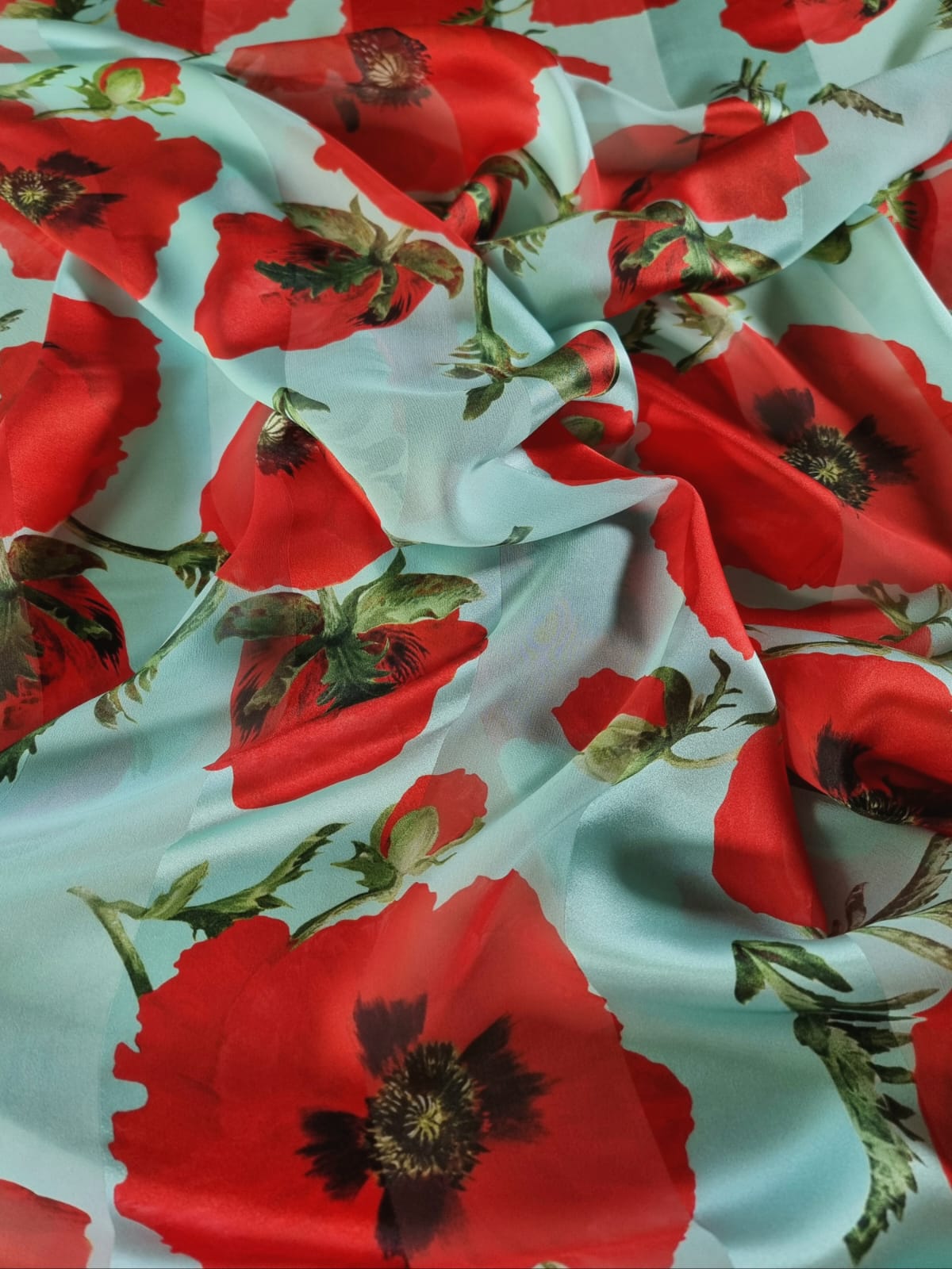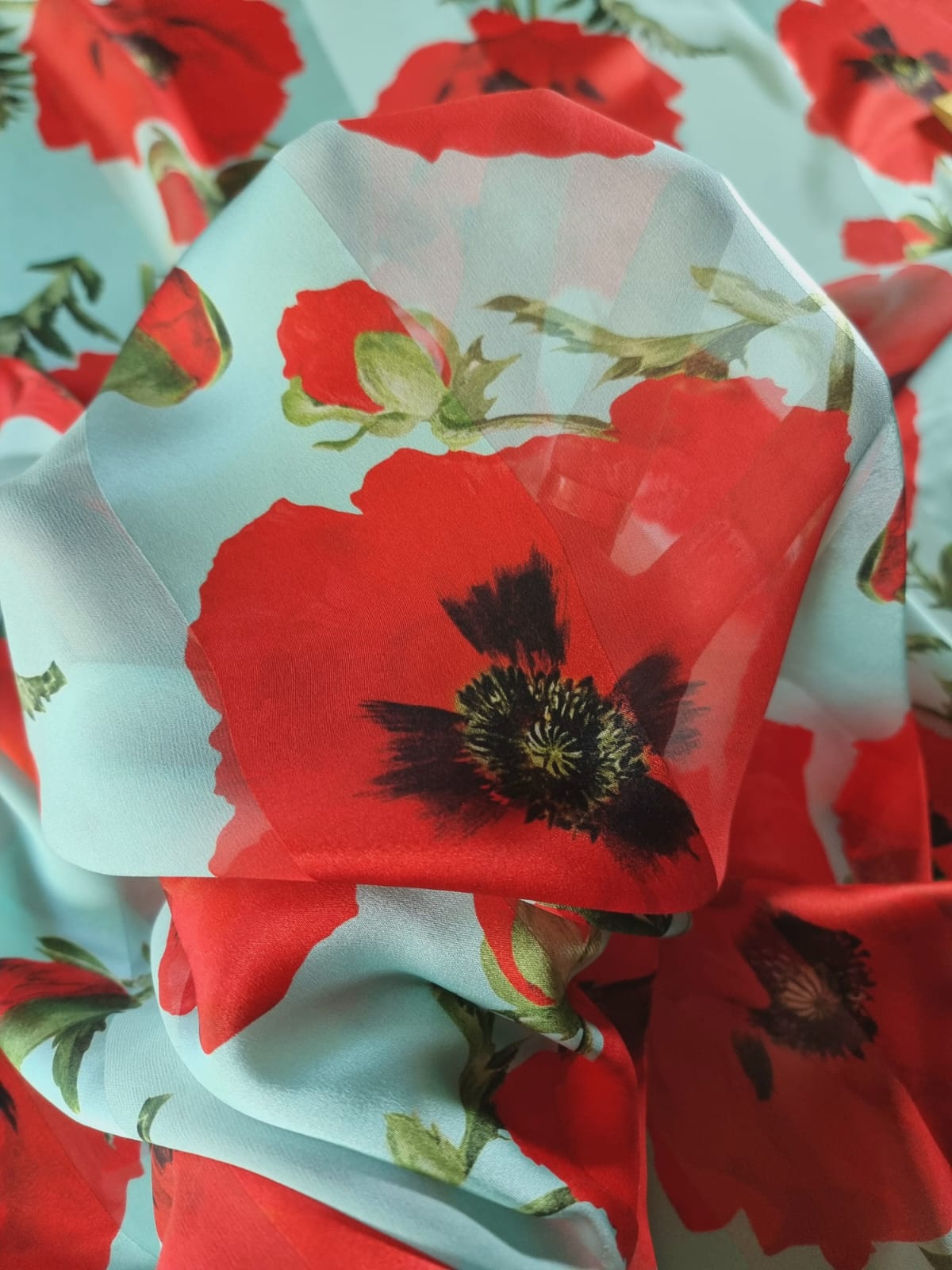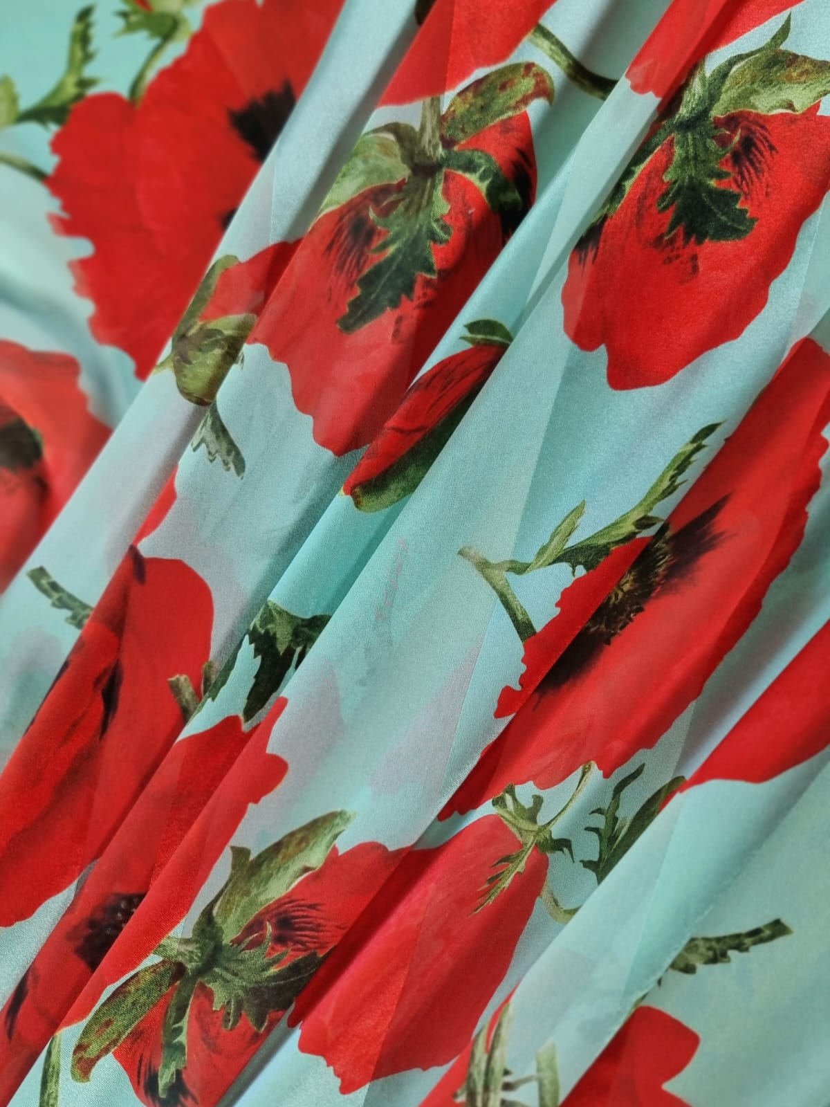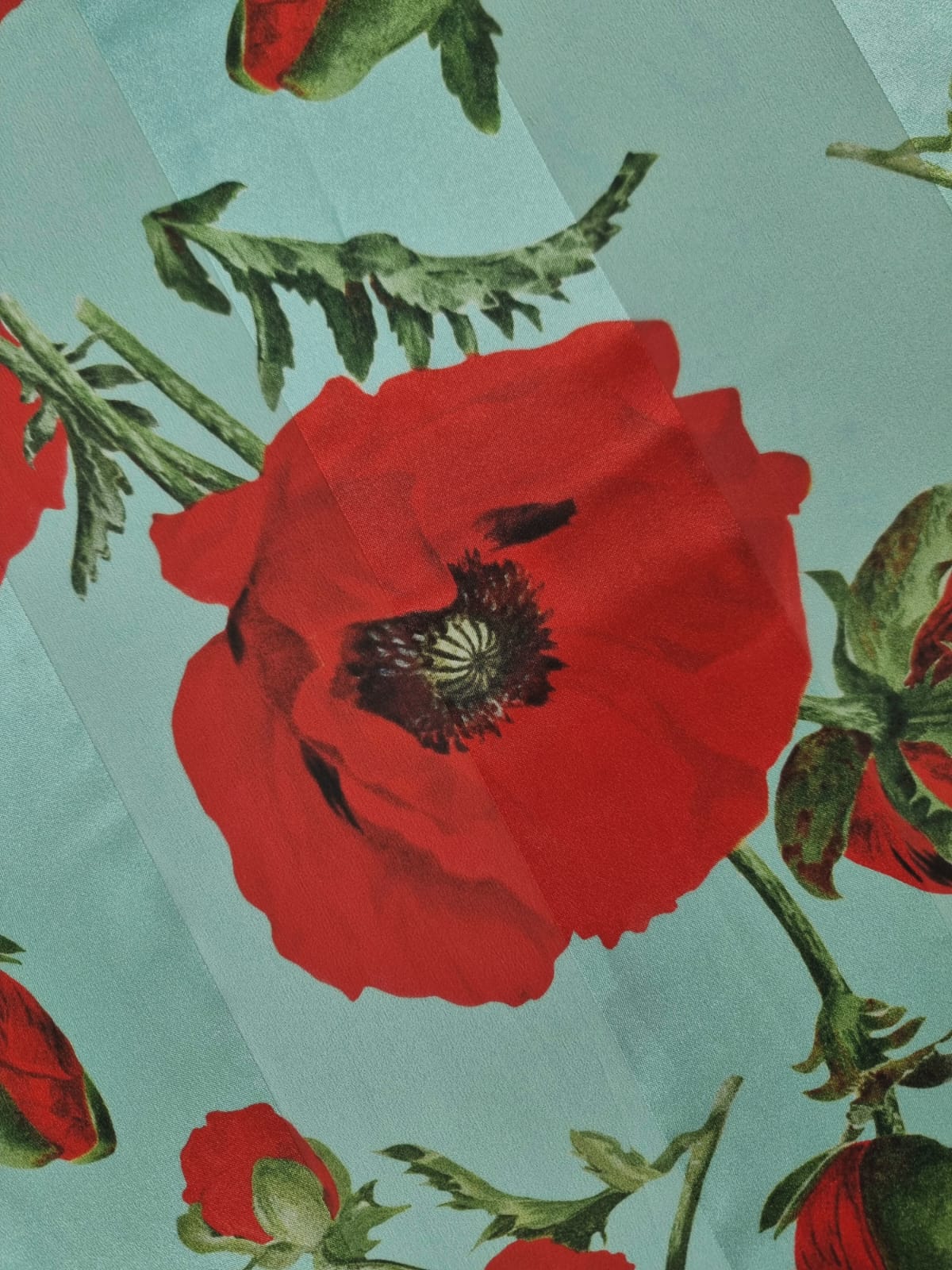 Voal Jacquard din Matase Naturala – Imprimeu cu maci roșii pe fond Verde Turcoaz pastel