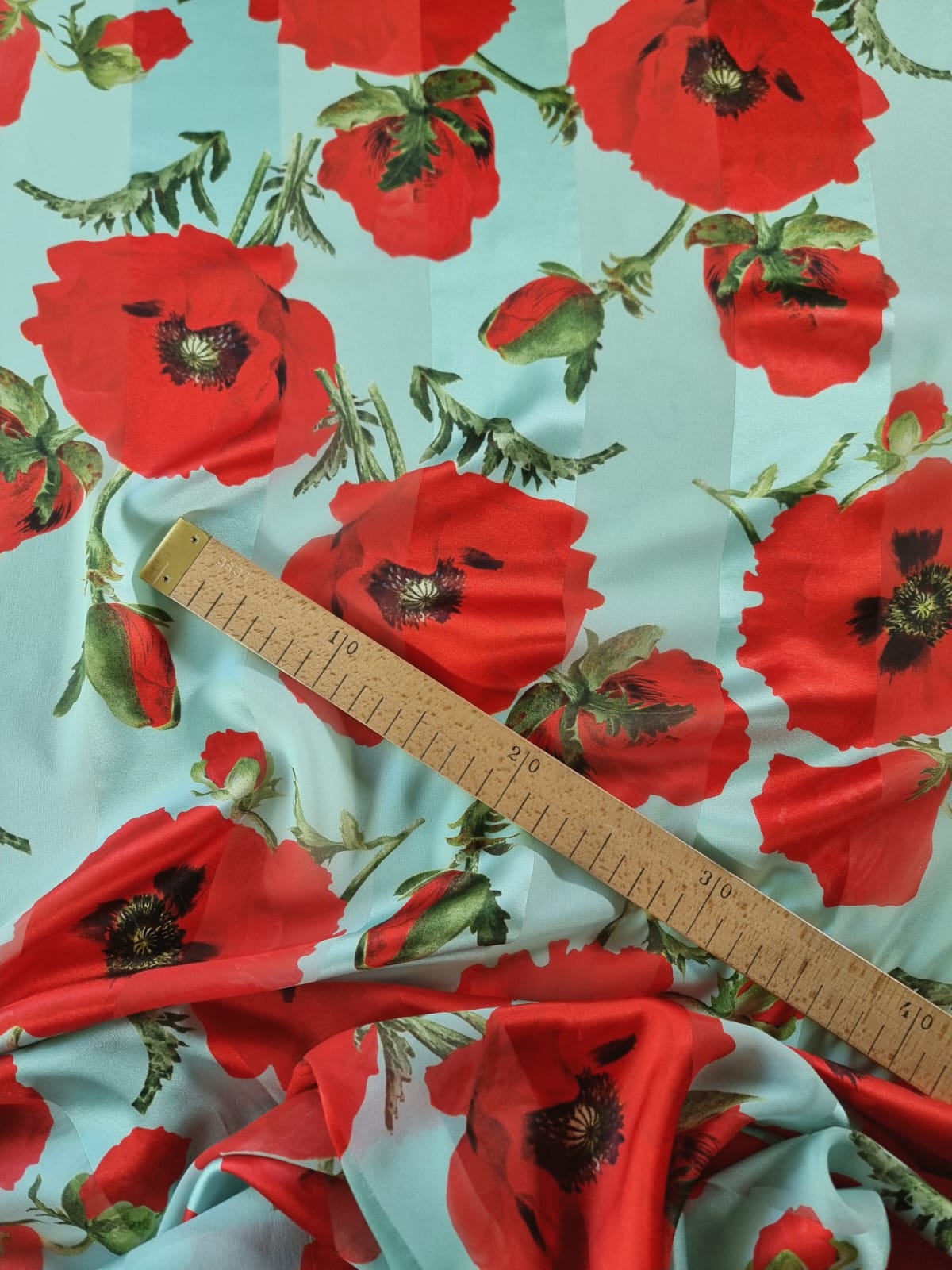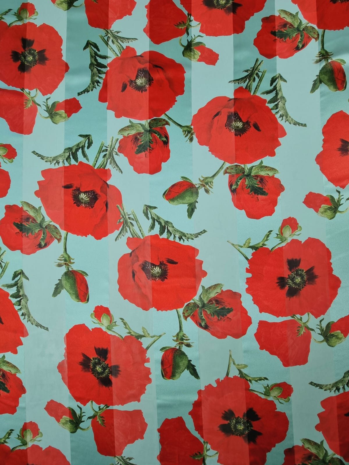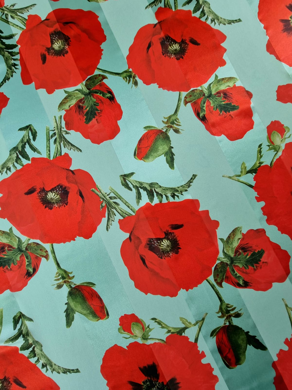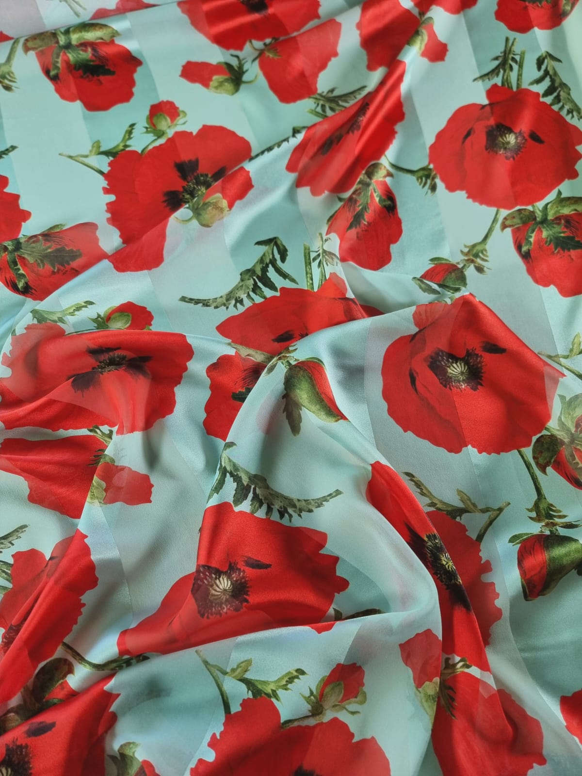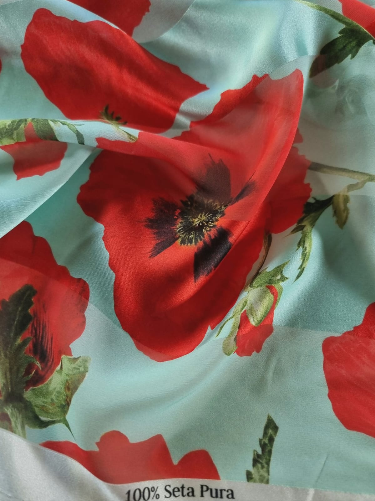 Voal Jacquard din Matase Naturala – Imprimeu cu maci roșii pe fond Verde Turcoaz pastel