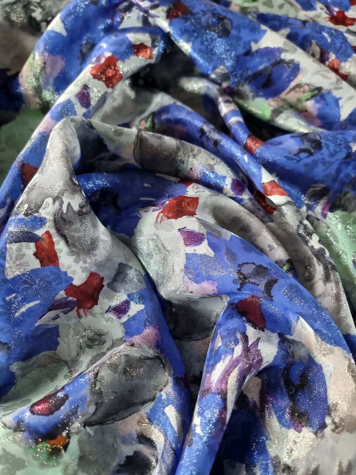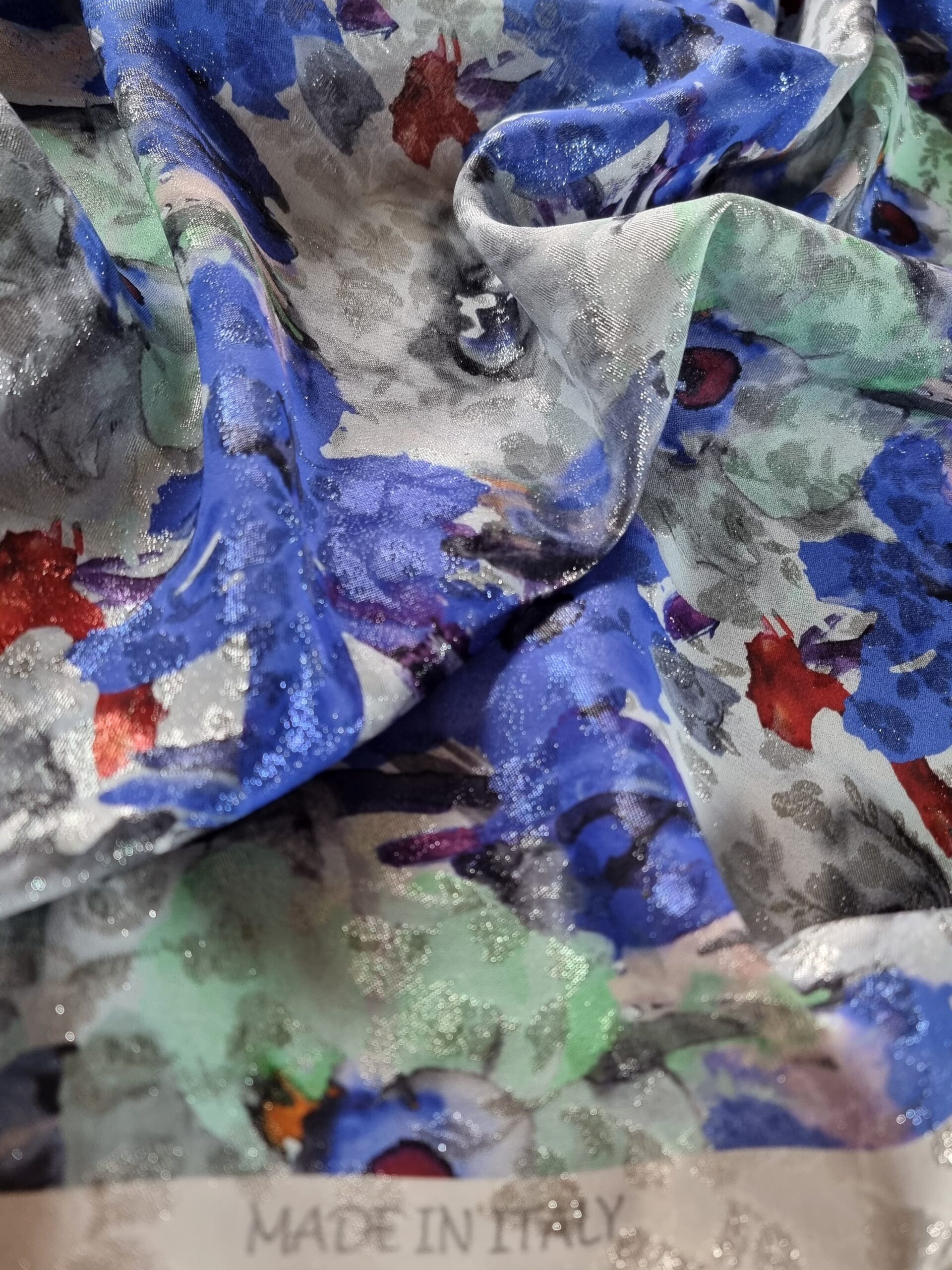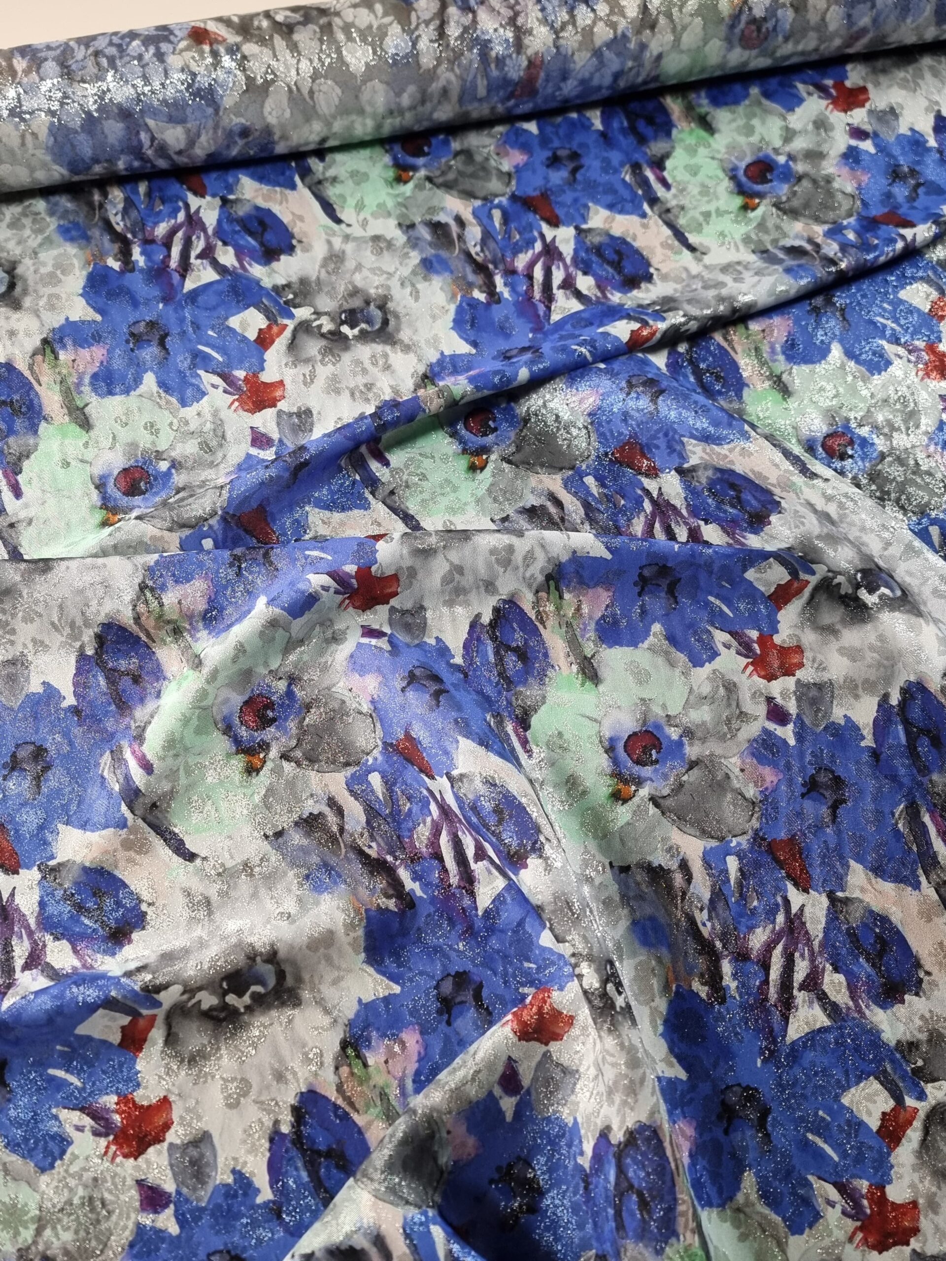 Voal pretios – Jacquard din matase naturala cu insertii discrete de fir argintiu, design floral, Albastru / Verde / Gri