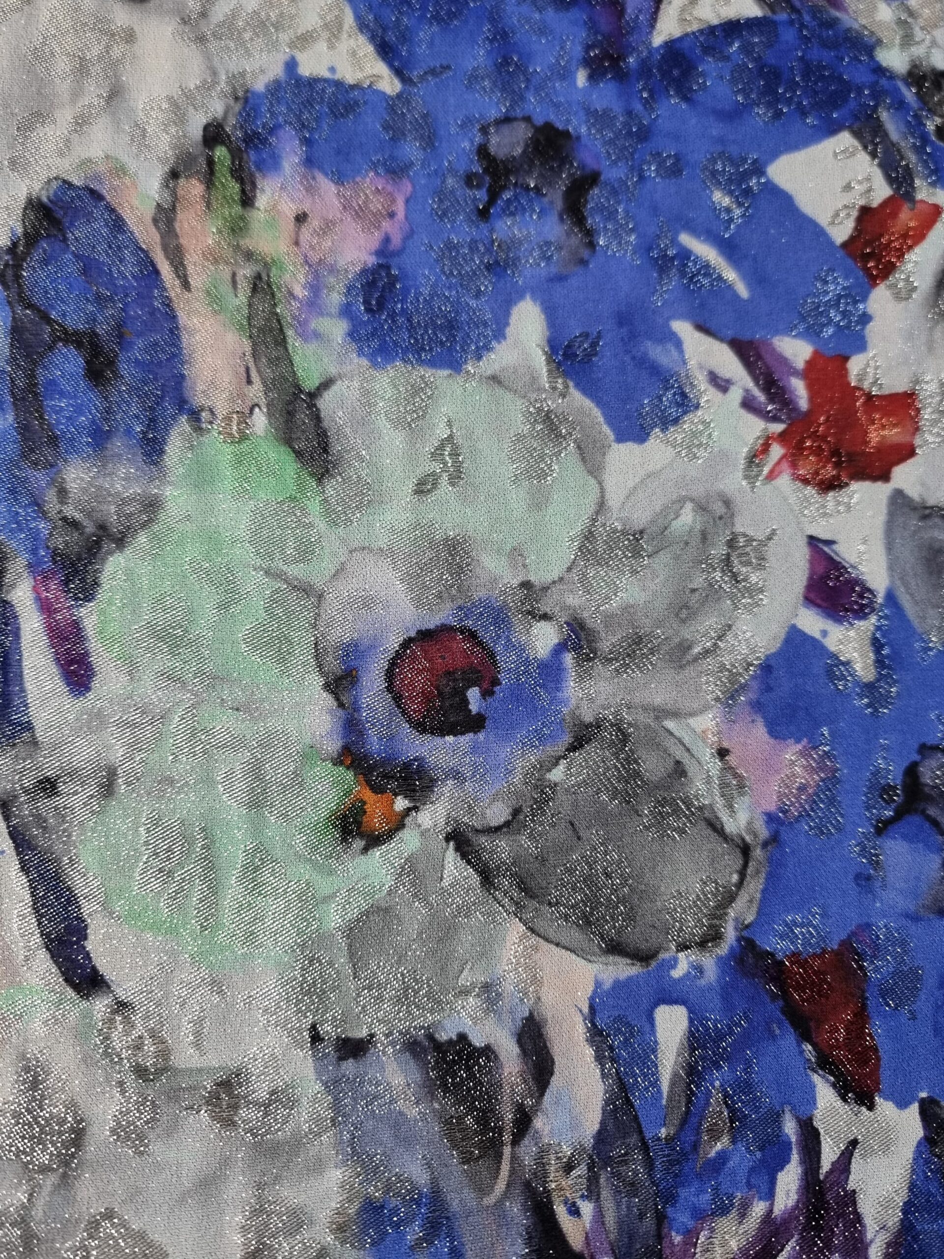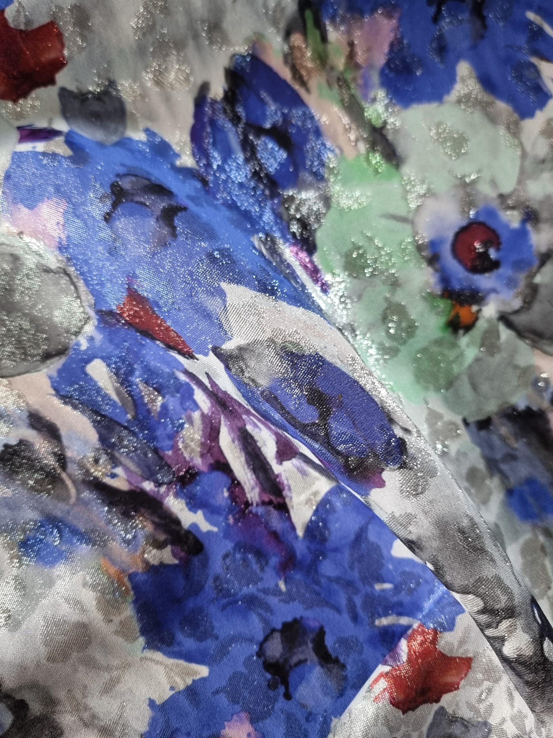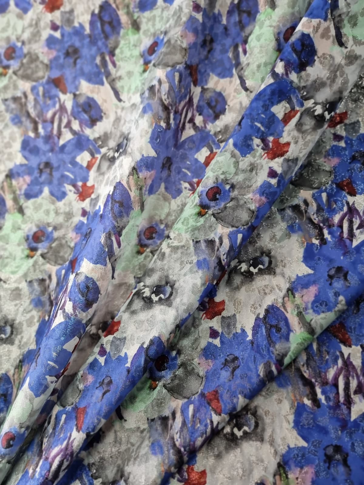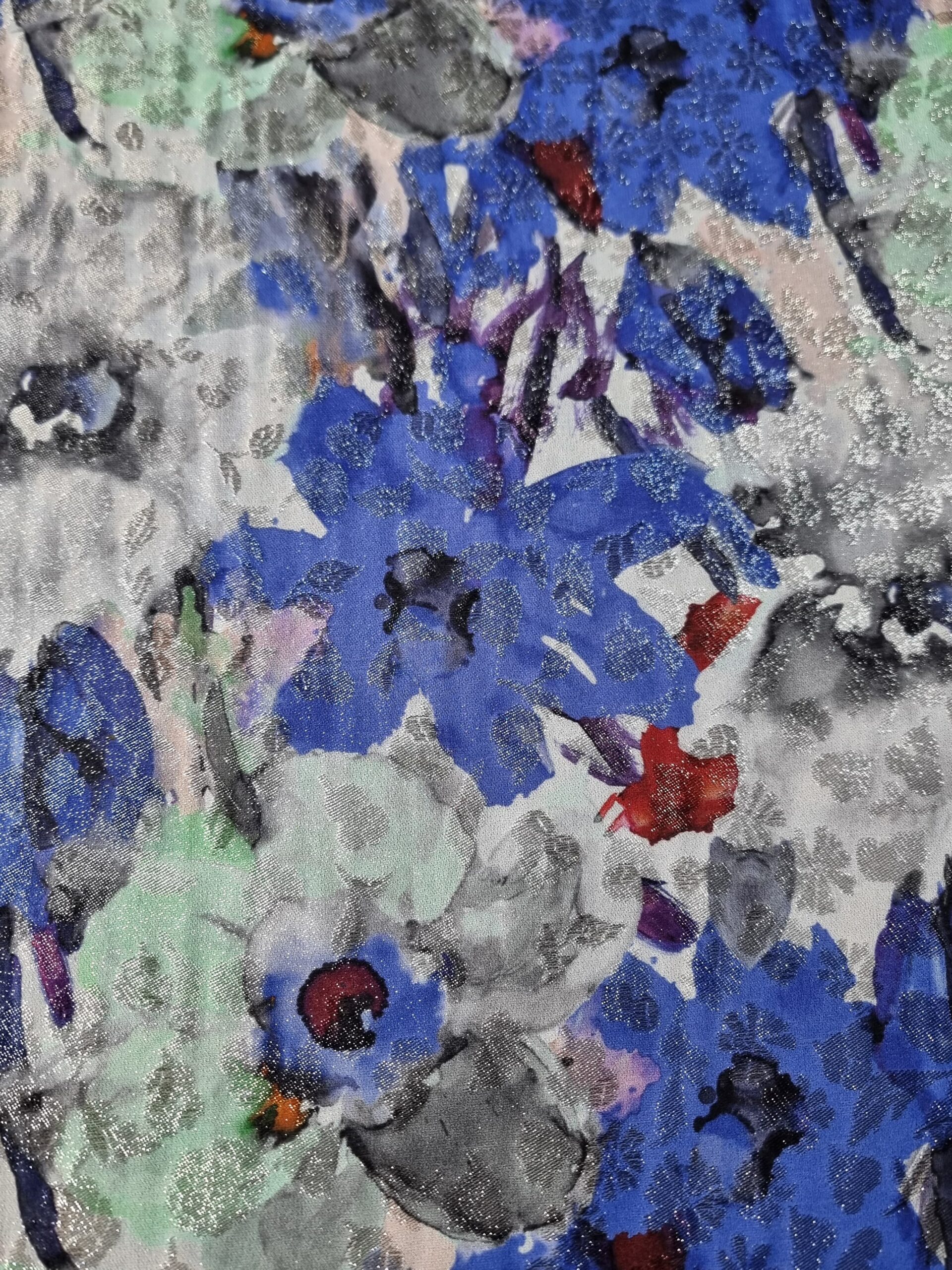 Voal pretios – Jacquard din matase naturala cu insertii discrete de fir argintiu, design floral, Albastru / Verde / Gri