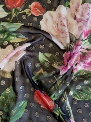 Voal georgette din matase naturala imprimata – design floral, Negru/Gri/Crem