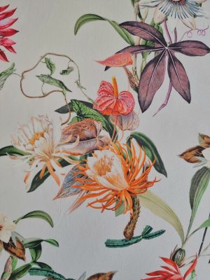 Voal din matase naturala imprimata – design floral, Ivoire/Albastru/Maro – Coniac